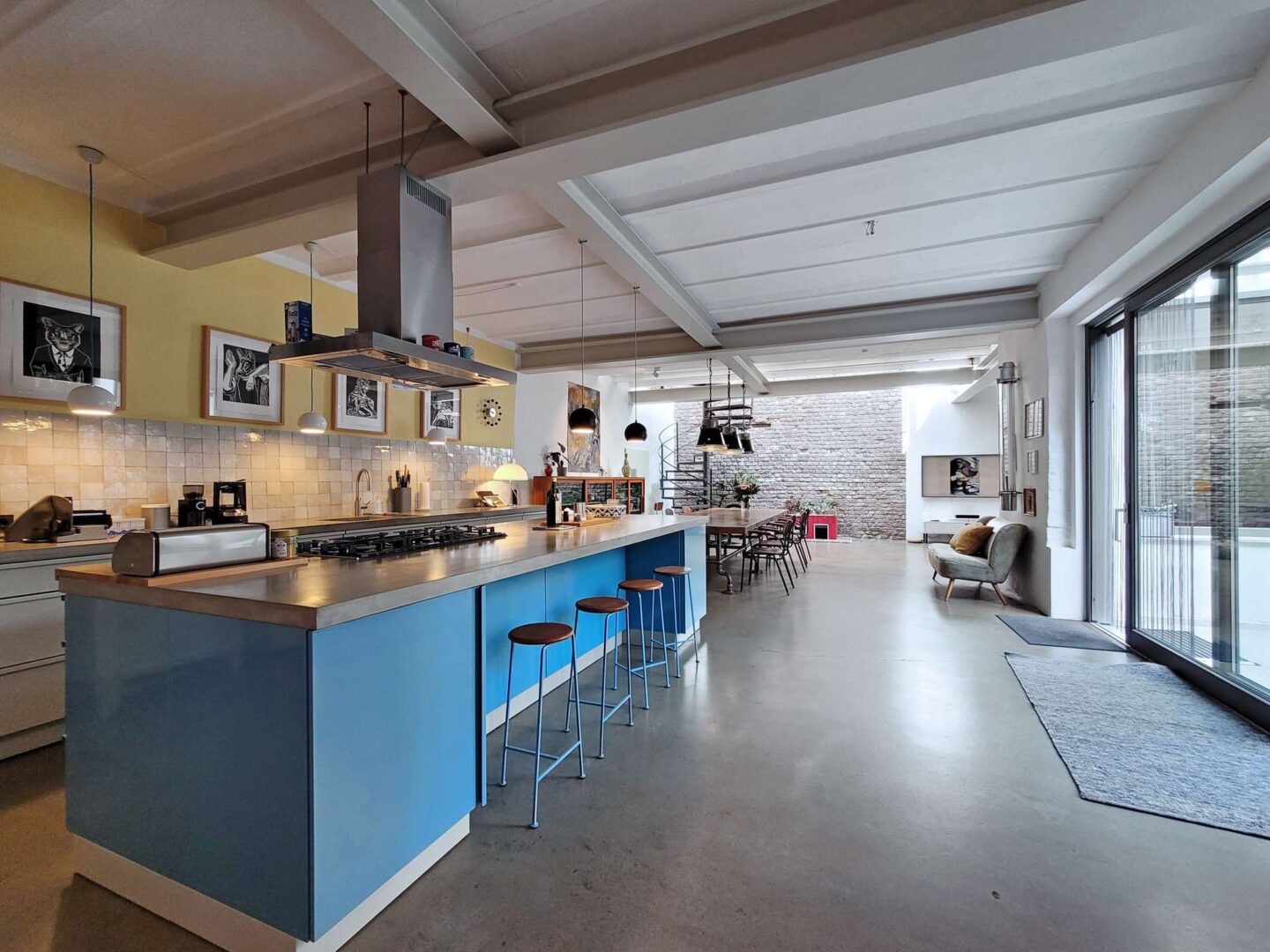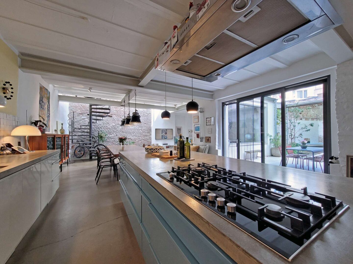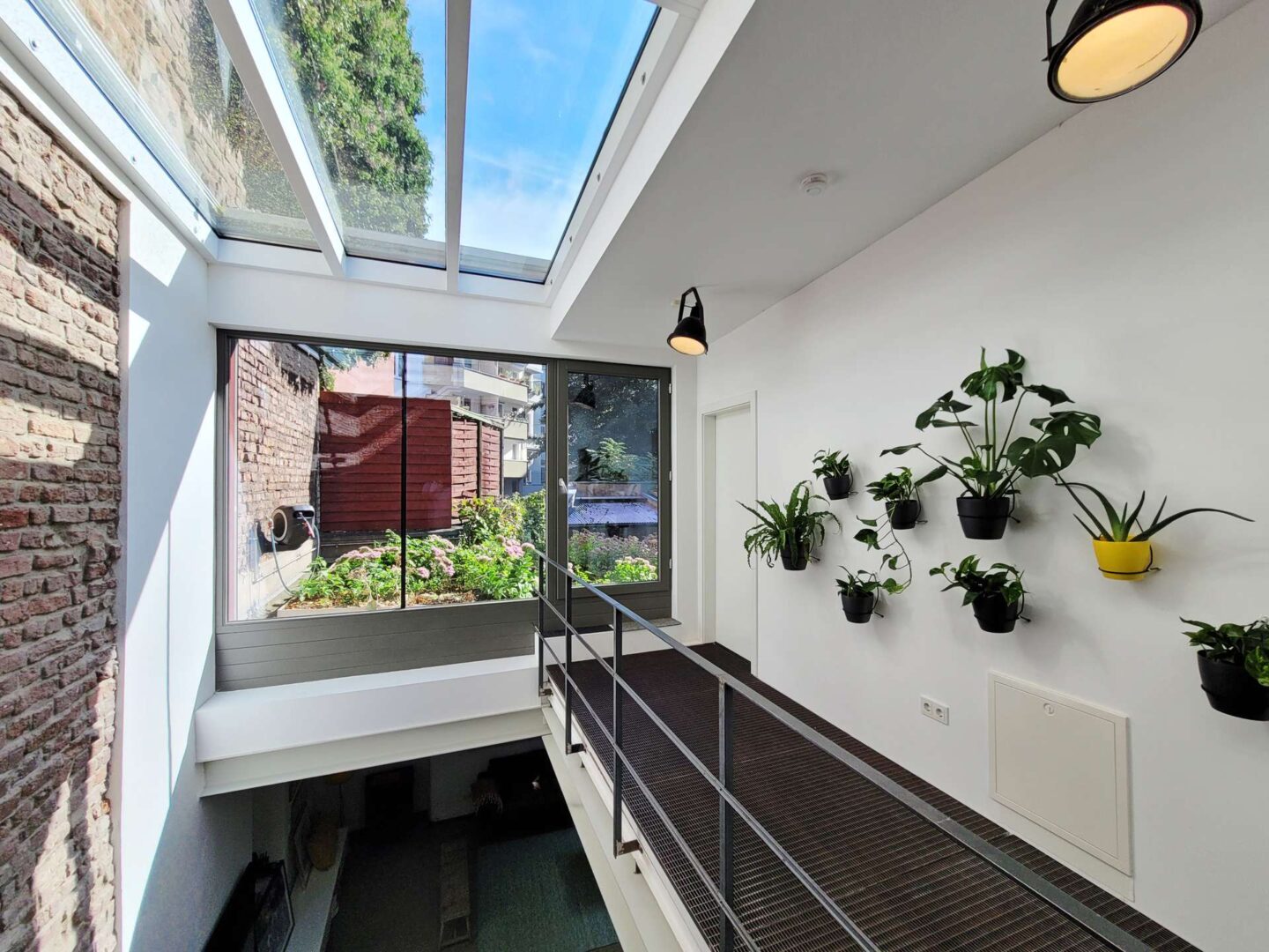 Über den Hinterhof, abseits von Straßenlärm, betreten Sie die großzügige Loft-Wohnung im Erdgeschoss. Über das Entree mit Garderobe gelangen Sie in den weitläufigen Wohnraum, der Küche, Essbereich, Wohnzimmer und einen stilvollen Arbeitsbereich nahtlos miteinander verbindet. Hier können Sie kulinarische Kreationen zubereiten, entspannen und gleichzeitig arbeiten - ein Raum für jede Lebenslage. Große Fensterflächen sorgen für einen lichtdurchfluteten Raum und geben den Blick in den üppig begrünten Innenhof frei. Zahlreiche optische Highlights wie eine Stahlwendeltreppe, offenes Mauerwerk sowie 3 m hohe Decken mit offenen Stahlträgern verleihen dem Raum seine ganz besondere Atmosphäre. Über eine große Schiebetüre haben Sie Zugang zur Terrasse. Große, parallel zueinander verlaufende Fensterfronten im Entree und Wohnzimmer verbinden die Terrasse optisch mit dem Innenraum. Ein gemütliches Gästezimmer, welches alternativ auch als Büro genutzt werden kann, rundet das Raumangebot im Erdgeschoss ab.