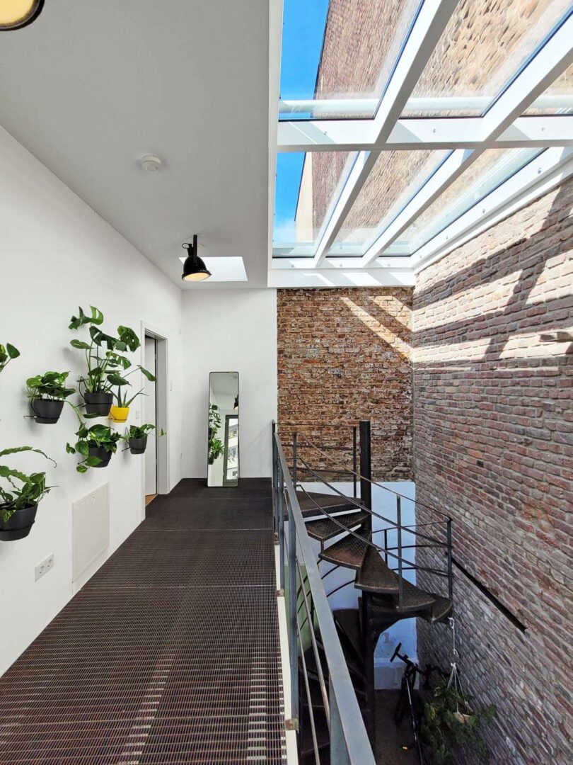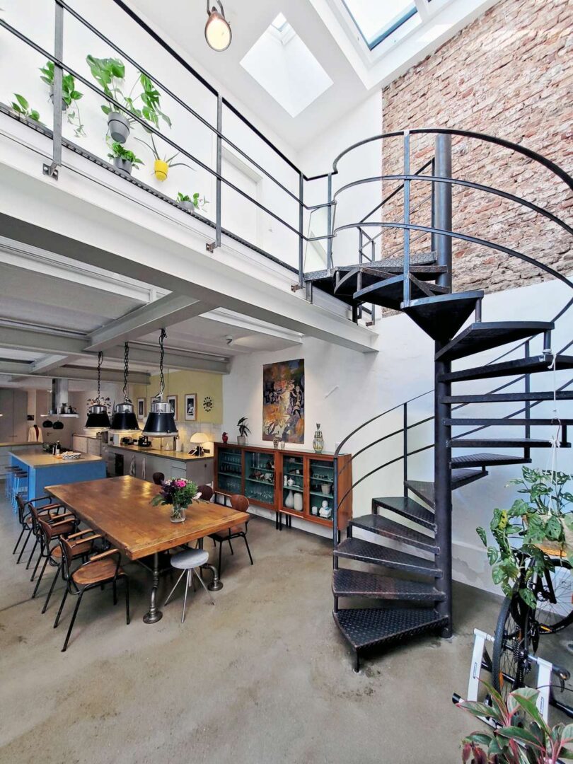 Über die markante Stahlwendeltreppe im Industrial-Look gelangen Sie auf die stilvolle, lichtdurchflutete Galerie im Obergeschoss. Von hier haben Sie Zugang zu Ihrem privaten Bereich, bestehend aus einem Schlafzimmer, einem begehbaren Ankleidezimmer sowie einem großzügigen Badezimmer mit begehbarer Dusche und Badewanne. Jeder Raum wurde mit Liebe zum Detail gestaltet und strahlt seine ganz besondere, individuelle Atmosphäre aus. Des Weiteren bietet die Galerie Zugang zu einem ca. 20 m² großen Dachgarten mit üppiger Bepflanzung.