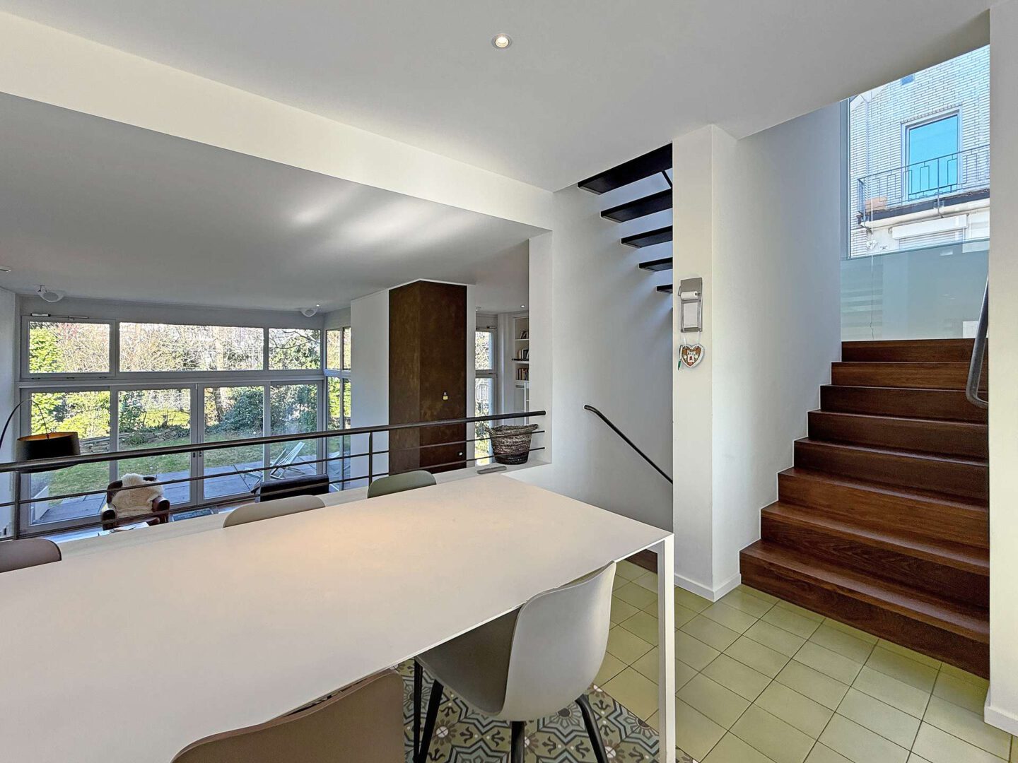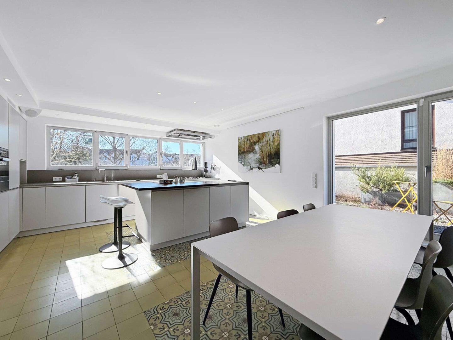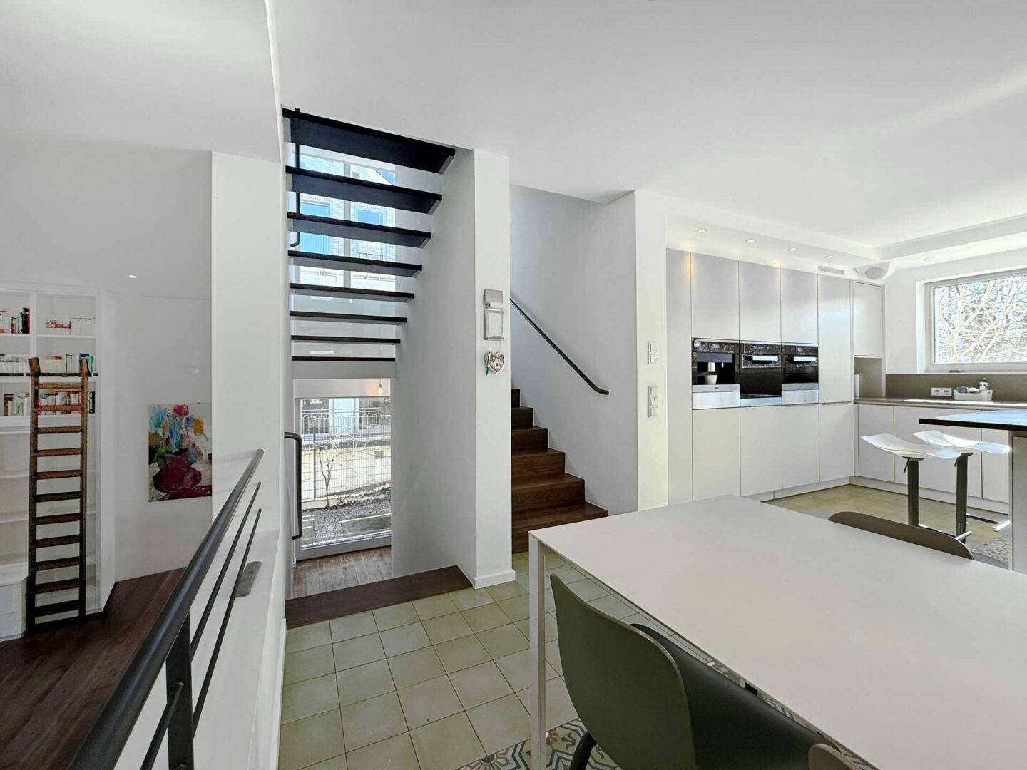 Die Küche samt Essbereich ist als Split-Level mit Galerie gestaltet und wirkt dadurch architektonisch besonders spannend. Passend zum Entrée greifen geometrische Zementfliesen mit Ornamenten den Vintage-Look auf und setzen einen markanten Akzent. Hochwertige Elektrogeräte und eine großzügige Kücheninsel sorgen für Komfort und viel Arbeitsfläche. Über einen direkten Zugang gelangt man auf das begrünte Garagendach. Vom Essplatz an der Galerie entsteht eine schöne Blickachse über das Wohnzimmer bis in den Garten.