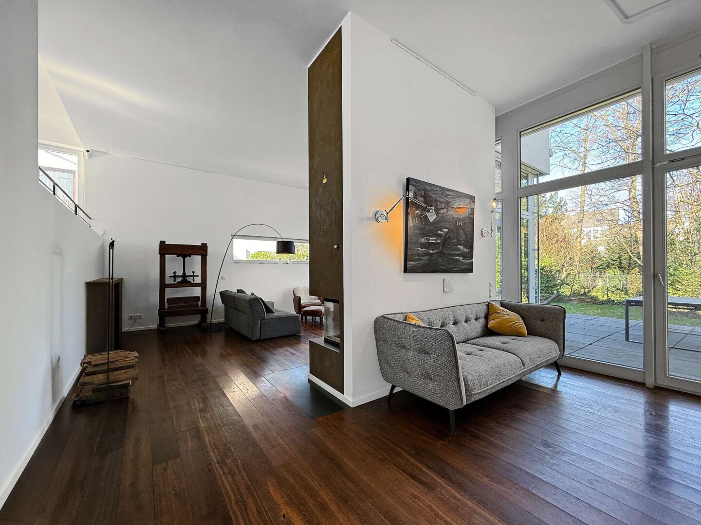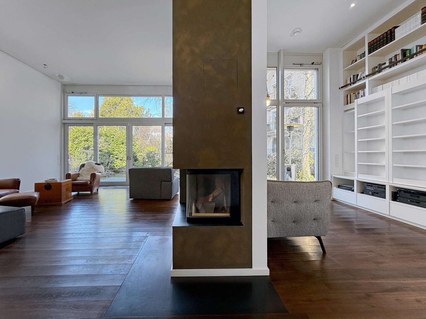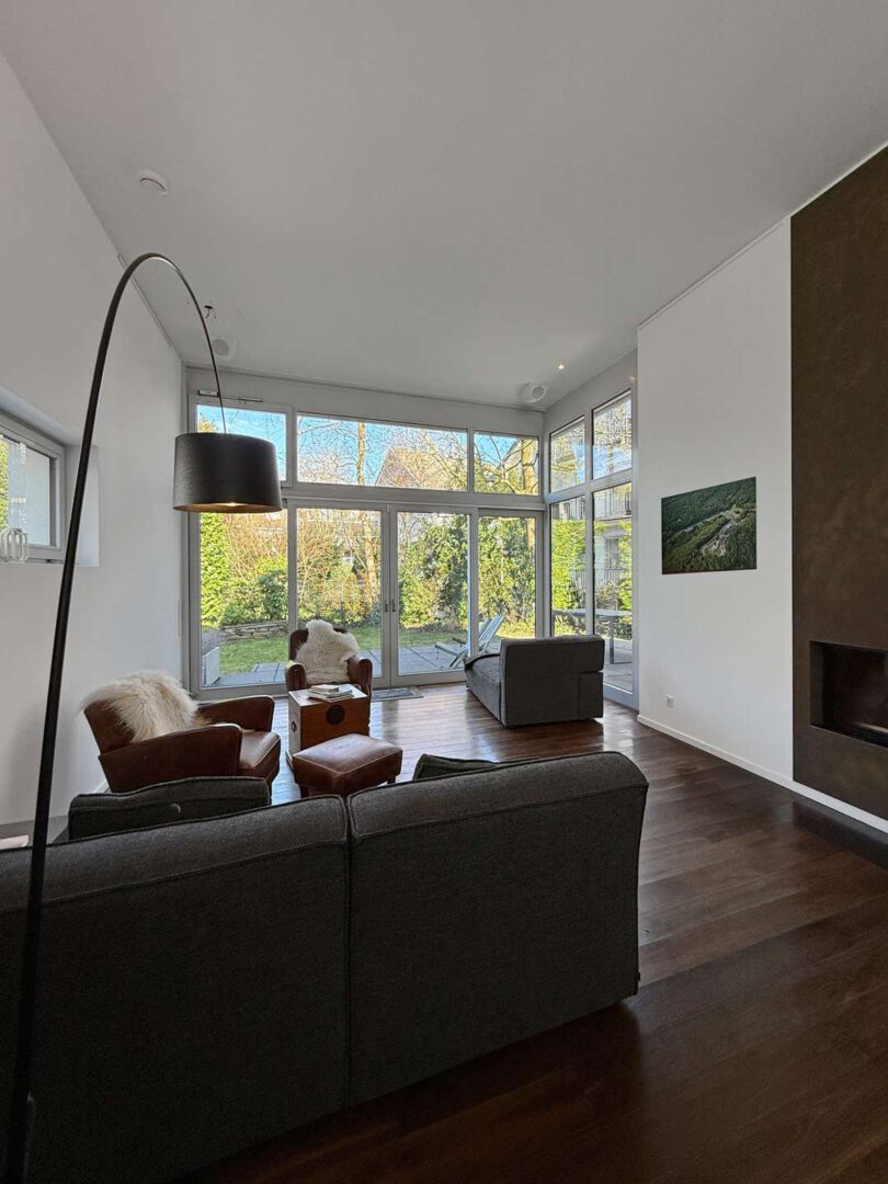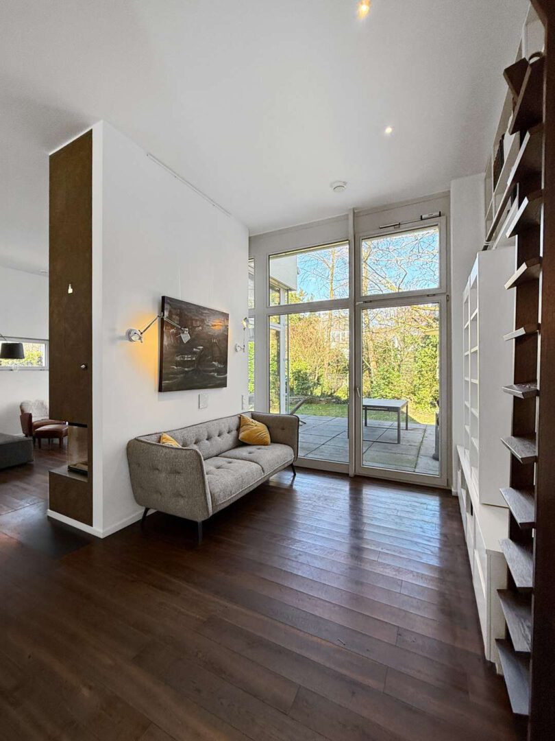 Vom Entree aus öffnet sich der Grundriss fließend in Richtung Wohnbereich: großzügig dimensioniert, lichtdurchflutet und geprägt von großen Fensterflächen mit direkter Verbindung zur Terrasse und in den Garten. Die Blickführung ist bewusst nach außen angelegt – über die Terrasse hinweg ins Grün – und schafft eine stimmige Verbindung zwischen Innenraum und Außenbereich. Eine markante Kaminwand, als Raumteiler ausgeführt, gliedert den Raum in Wohnbereich und Bibliothek, ohne die Offenheit und Weite zu beeinträchtigen.