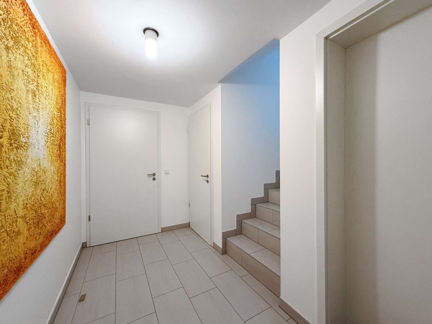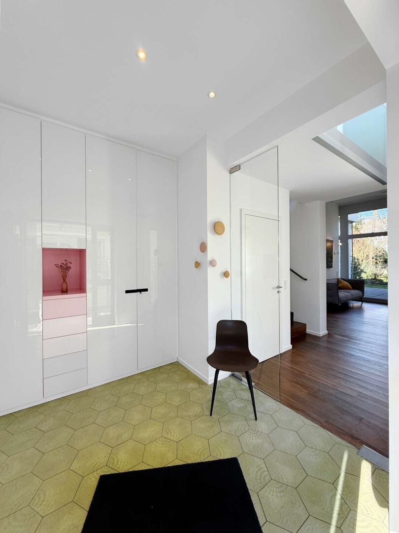 Bereits das Entree vermittelt die exklusive Ausstattung des Hauses: Hexagonfliesen im Retro-Look, inspiriert vom Originaldesign des berühmten katalanischen Architekten Antoni Gaudí, setzen einen stilvollen, grafischen Akzent und geben dem Eingangsbereich sofort Charakter. Im spannenden Kontrast dazu stehen die maßgefertigten, modernen Schrankeinbauten, die sich flächenbündig ins Gesamtbild einfügen, viel Stauraum bieten und für ein aufgeräumtes, elegantes Erscheinungsbild sorgen. Angrenzend befindet sich das stilvolle Gäste-WC.