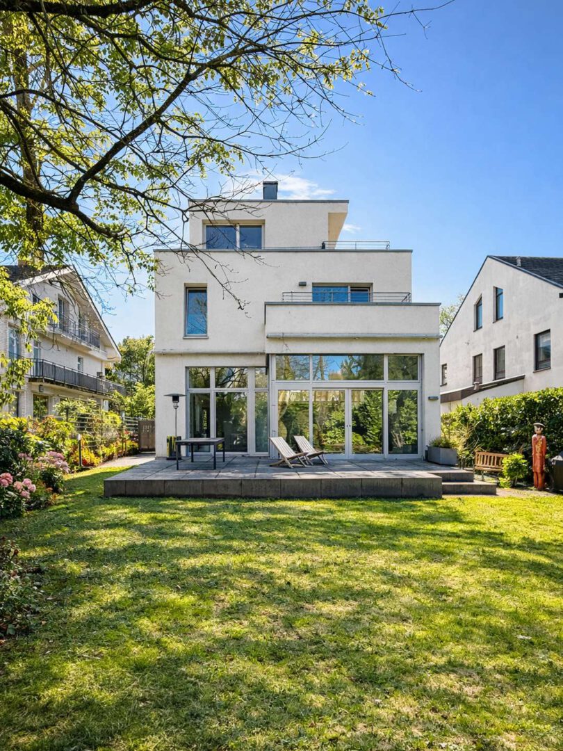Das freistehende Einfamilienhaus liegt auf einem ca. 519 m² großen Gartengrundstück in gehobener, ruhiger Lage von Düsseldorf-Mörsenbroich. Die Immobilie wurde im Jahr 2014 im Bauhausstil errichtet und bietet auf ca. 272 m² Wohnfläche eine architektonisch interessante Gestaltung mit Split-Level-Elementen, hohen Decken sowie großzügigen, lichtdurchfluteten Räumen. Große Fensterflächen und klare Blickachsen führen dabei immer wieder in den Garten und schaffen einen fließenden Übergang zwischen Innen- und Außenraum.