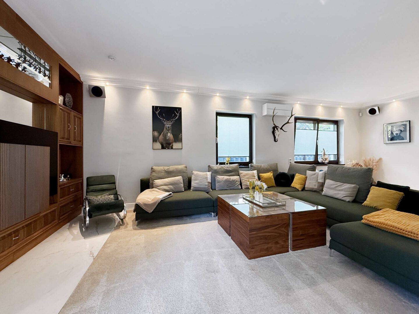 Das weitläufige Untergeschoss (u. a. mit Kühlraum) bietet beste Voraussetzungen für Hobby, Fitness und Stauraum; die Haustechnik präsentiert sich auf aktuellem Stand. Fußbodenheizung sowie Mitsubishi-Klimageräte sorgen in Erd- und Obergeschoss für ein angenehmes Raumklima, elektrisch steuerbare Rollläden und Smart-Home-Funktionen erhöhen den Komfort im Alltag. Ein ABUS-Alarmsystem, Glasfaseranschluss und die umfangreiche App-Steuerung für Licht, Rollläden, Bewässerung und Heizung unterstreichen den zukunftssicheren Charakter des Hauses.