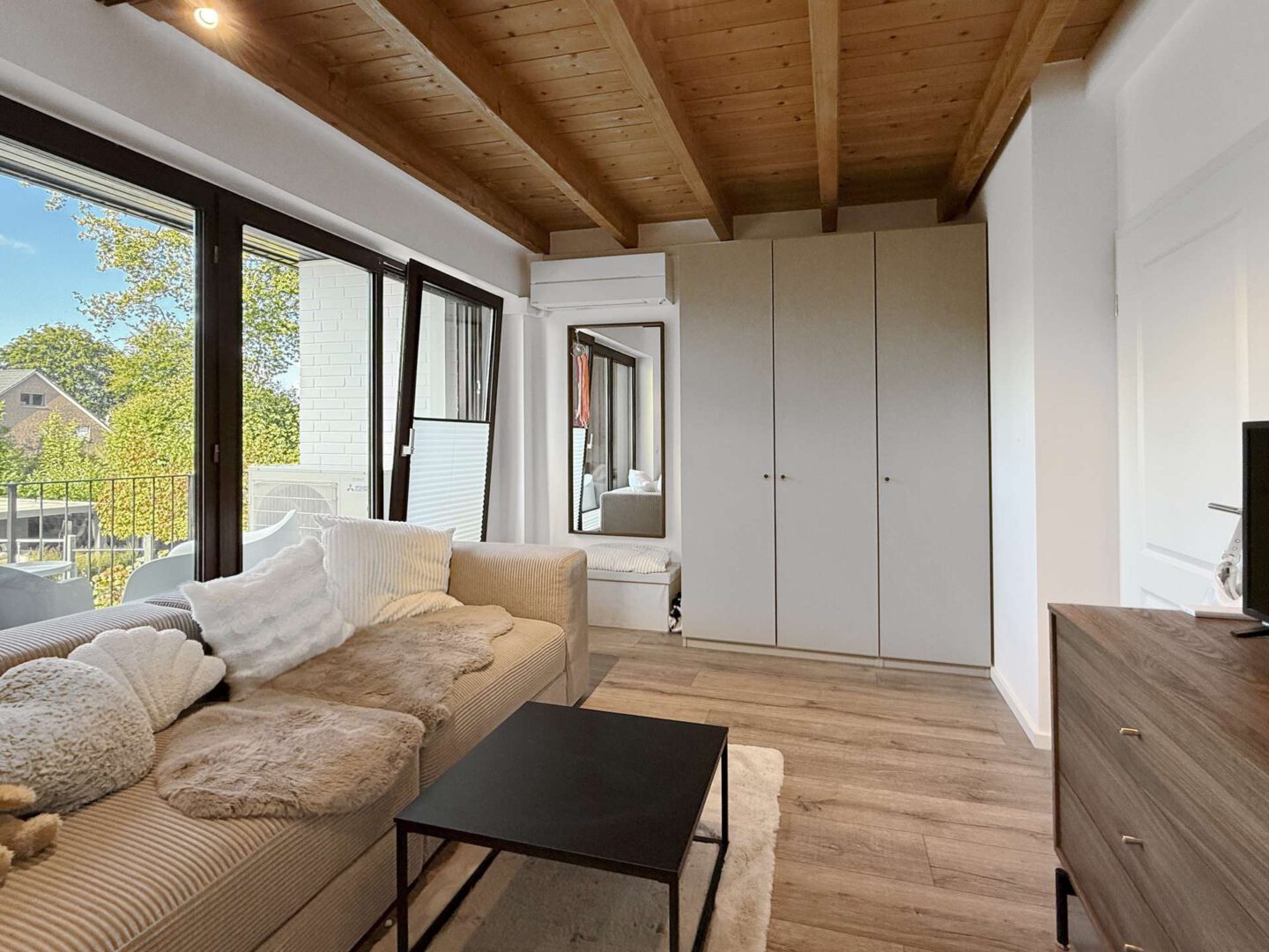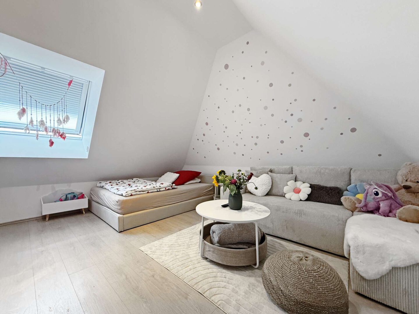 Zwei weitere Zimmer – jeweils mit Zugang zum großen Balkon – sowie ein elegantes Bad erreichen Sie über die markante Wendeltreppe im Wohnbereich.