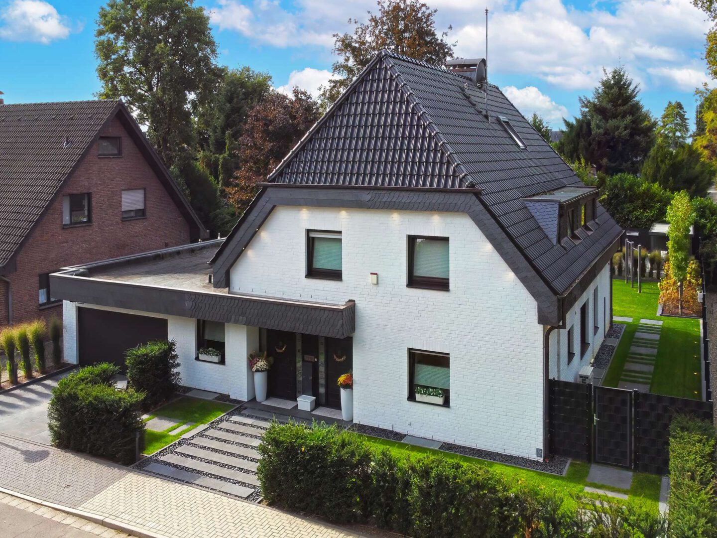 In den Holterhöfen im Krefelder Stadtteil Forstwald, einer der beliebten und naturnahen Wohnlagen der Stadt, präsentiert sich dieses freistehende Einfamilienhaus als zeitlos elegantes Refugium. Die Immobilie aus dem Jahre 1981 wurde 2020 bis 2023 ganzheitlich, aufwändig modernisiert und entspricht heute nahezu Neubaustandard. Die Wohnfläche beträgt ca. 265 qm und verteilt sich auf 2 Etagen zzgl. ausgebautem Spitzboden. Ein aufwendig gestalteter Außenbereich mit Outdoor-Lounge samt Küche sowie ein großes Terrassendeck mit Whirlpool und Swim Spa sorgen für eine hohe Aufenthaltsqualität im Freien.