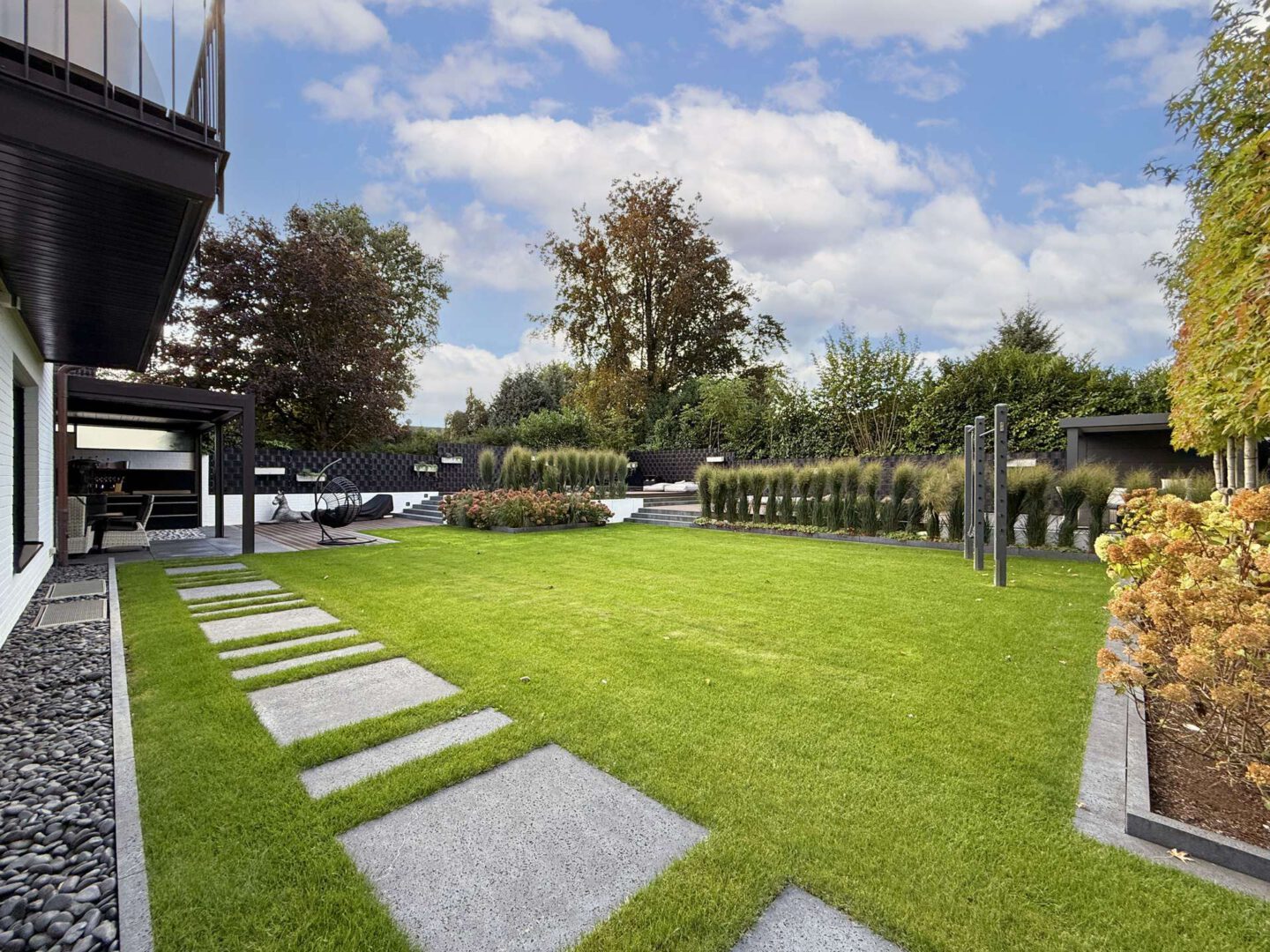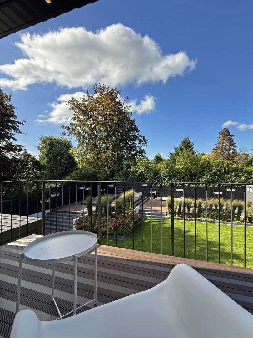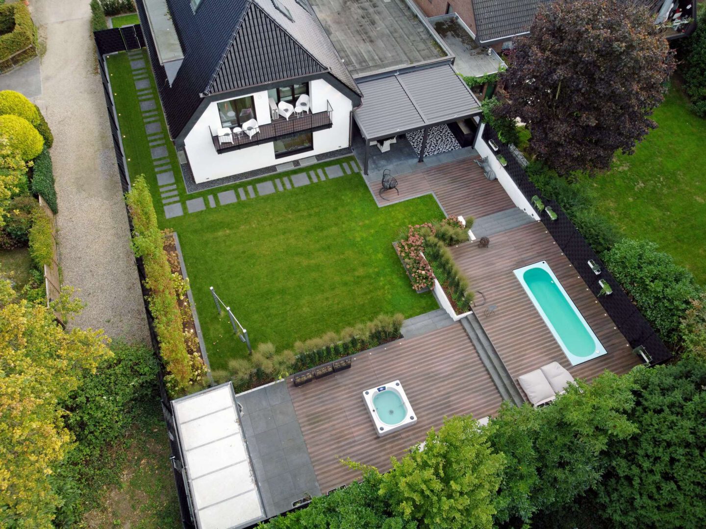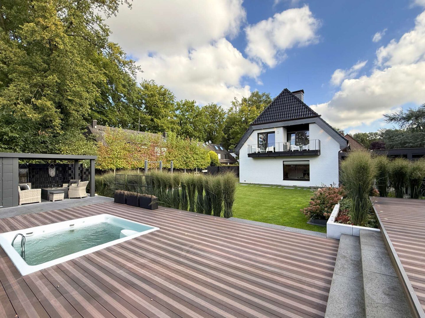 Der aufwendig gestaltete Außenbereich ergänzt den Wohnraum um einen souverän gestalteten Lebensraum im Freien: eine überdachte Outdoor-Lounge mit voll ausgestatteter Freigeist-Küche, ein großzügiges Terrassendeck mit Whirlpool und Swim Spa, gepflegte Rasenflächen und aufwendige Bepflanzung – das alles perfekt inszeniert in sonniger Süd-West-Ausrichtung. Ein Gartenhaus mit angrenzender, überdachter Terrasse sowie der gepflegte Vorgarten runden das stimmige Gesamtbild ab.