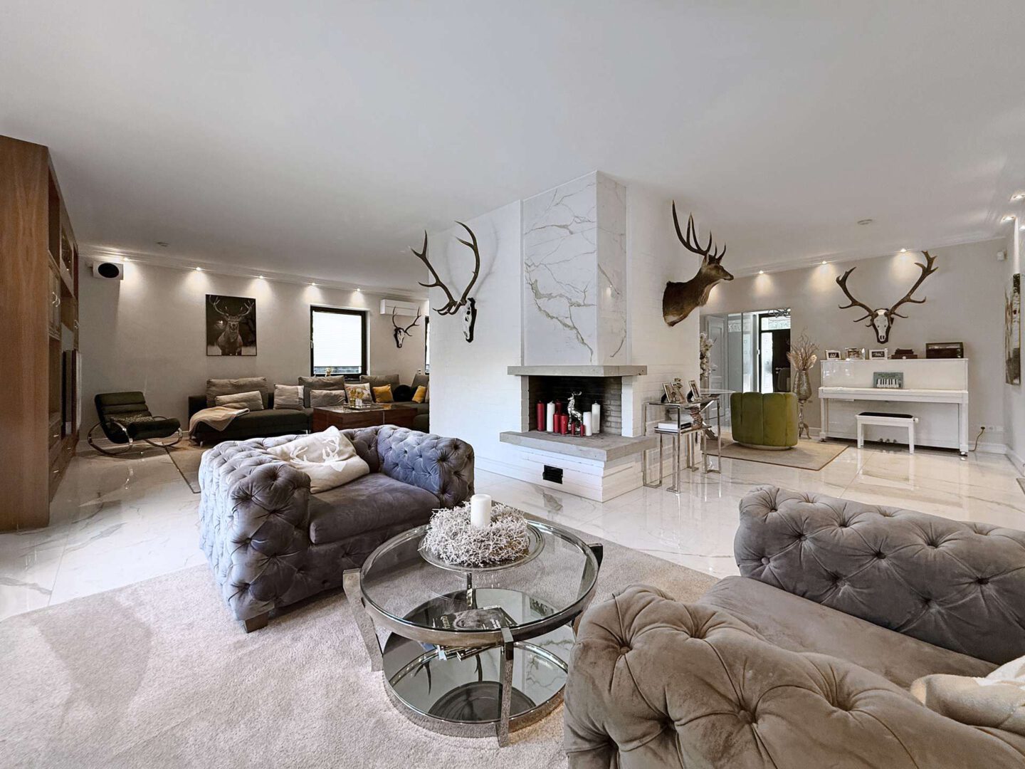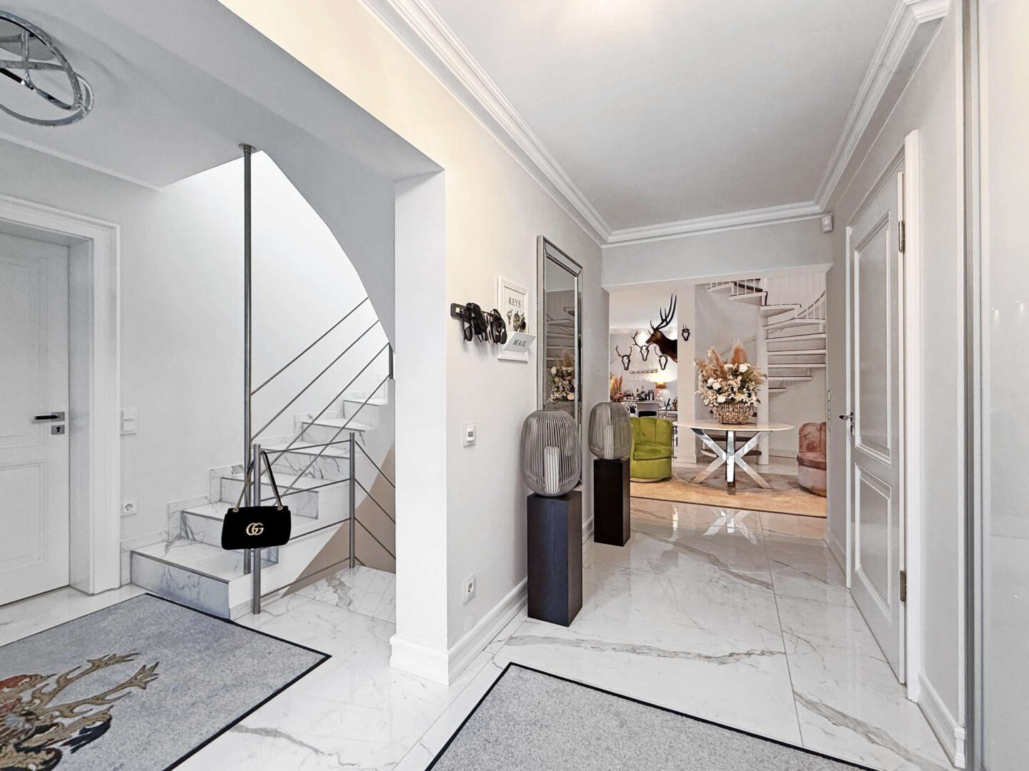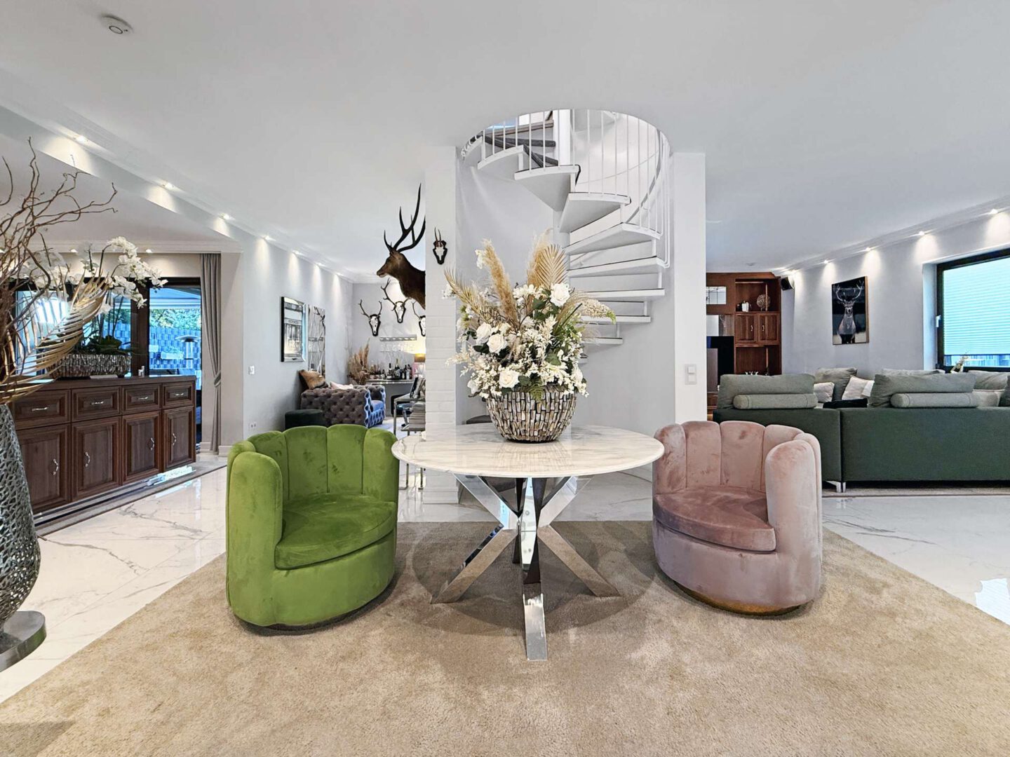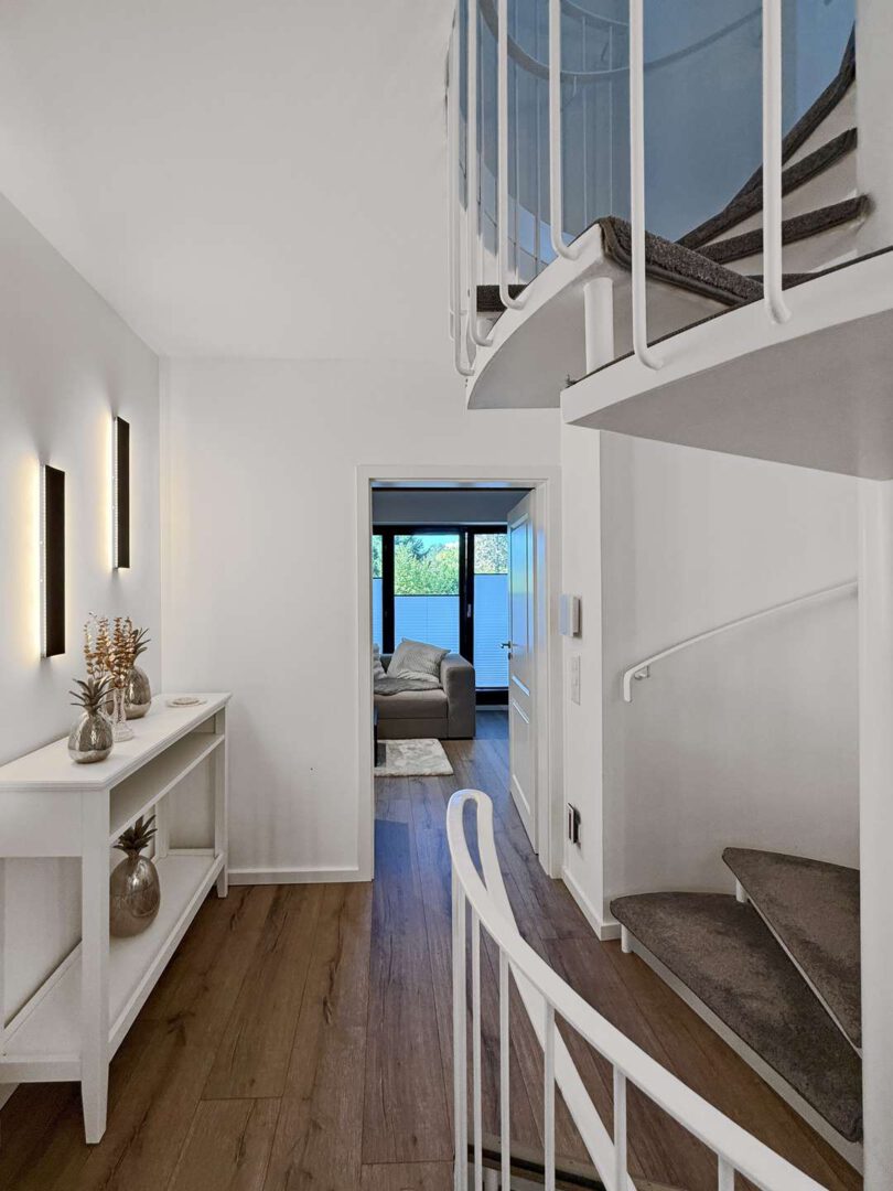 Über das elegante Entree – mit zwei Eingangstüren, Garderobe, Gäste-WC und Treppenaufgang zur Mastersuite – gelangen Sie in den großzügigen Wohnbereich. Eine markante Wendeltreppe, bildet den Mittelpunkt des Raums und gliedert den Raum in mehrere Bereiche und Sitzzonen. Ein Echtholz-Kamin sorgt für eine gemütliche Atmosphäre.