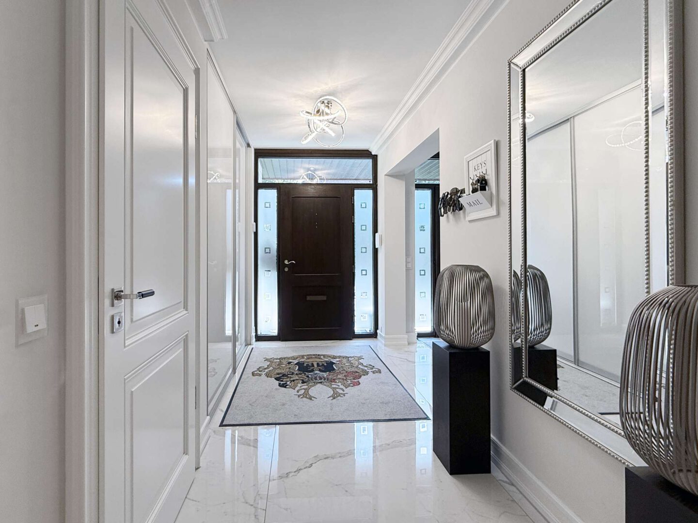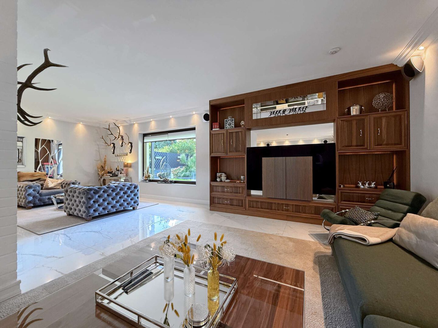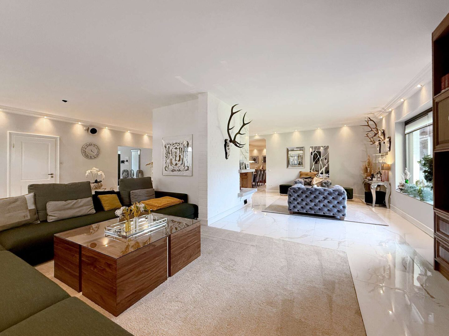 Über das elegante Entree – mit zwei Eingangstüren, Garderobe, Gäste-WC und Treppenaufgang zur Mastersuite – gelangen Sie in den großzügigen Wohnbereich. Eine markante Wendeltreppe, bildet den Mittelpunkt des Raums und gliedert den Raum in mehrere Bereiche und Sitzzonen. Ein Echtholz-Kamin sorgt für eine gemütliche Atmosphäre.