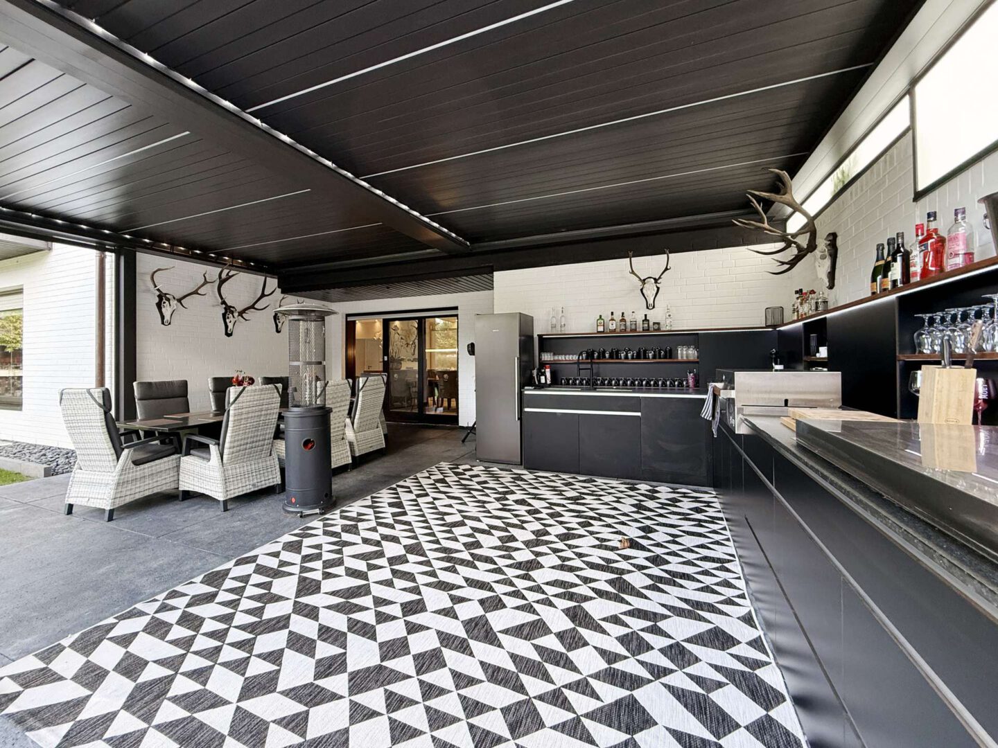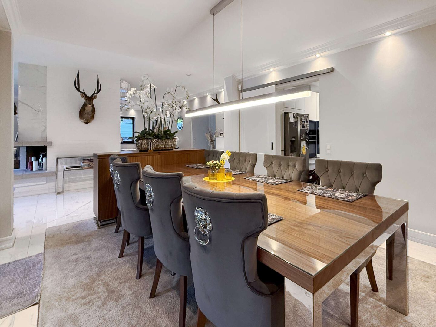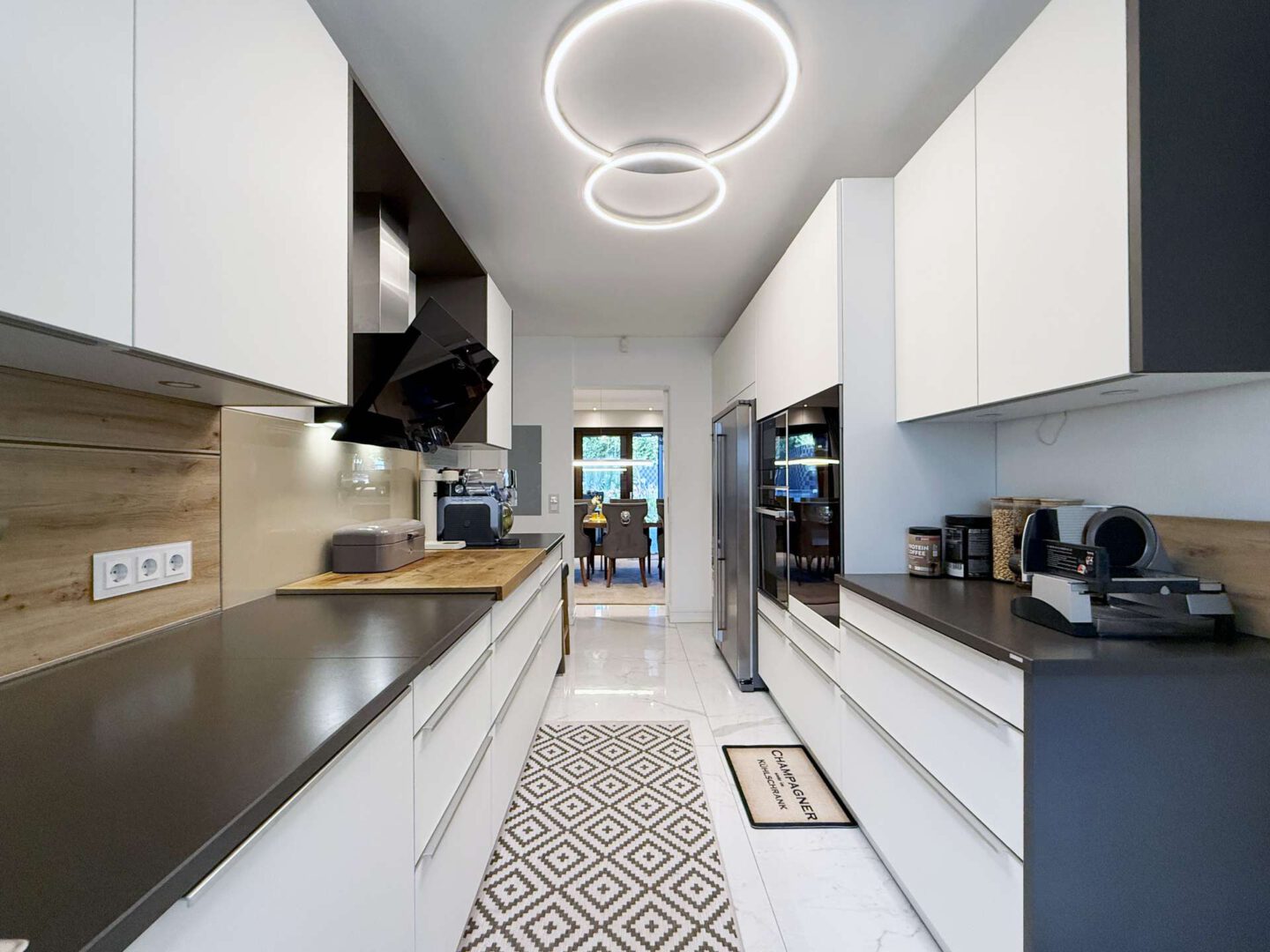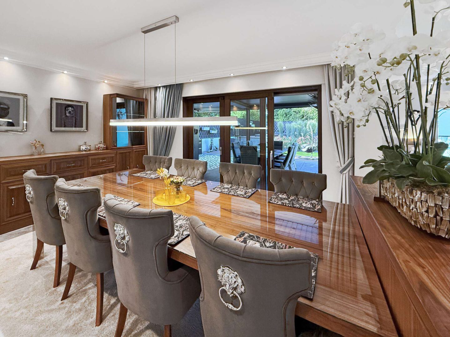 Das Esszimmer schließt sich an den Wohnbereich an und bietet Zugang zur großen, überdachten Outdoor Lounge samt hochwertiger Outdoor-Küche von Freigeist. Vom Esszimmer aus haben Sie direkten Zugang zur Küche, was die Wege verkürzt. Die maßgefertigte Contur-Einbauküche ist mit hochwertigen Elektrogeräten (großes Induktionsfeld, Backofen, Mikrowelle, Weinkühlschrank und Quooker) ausgestattet.