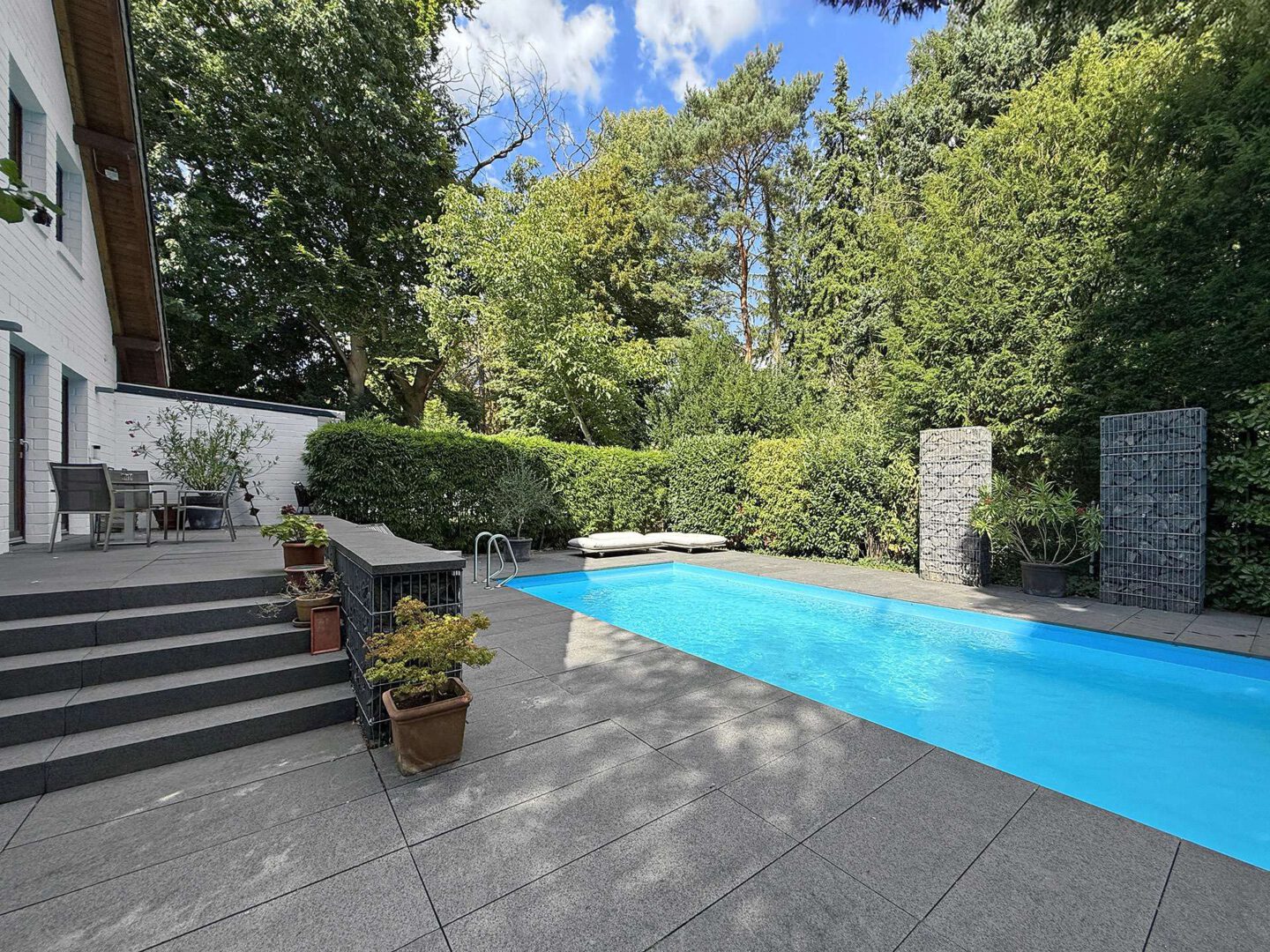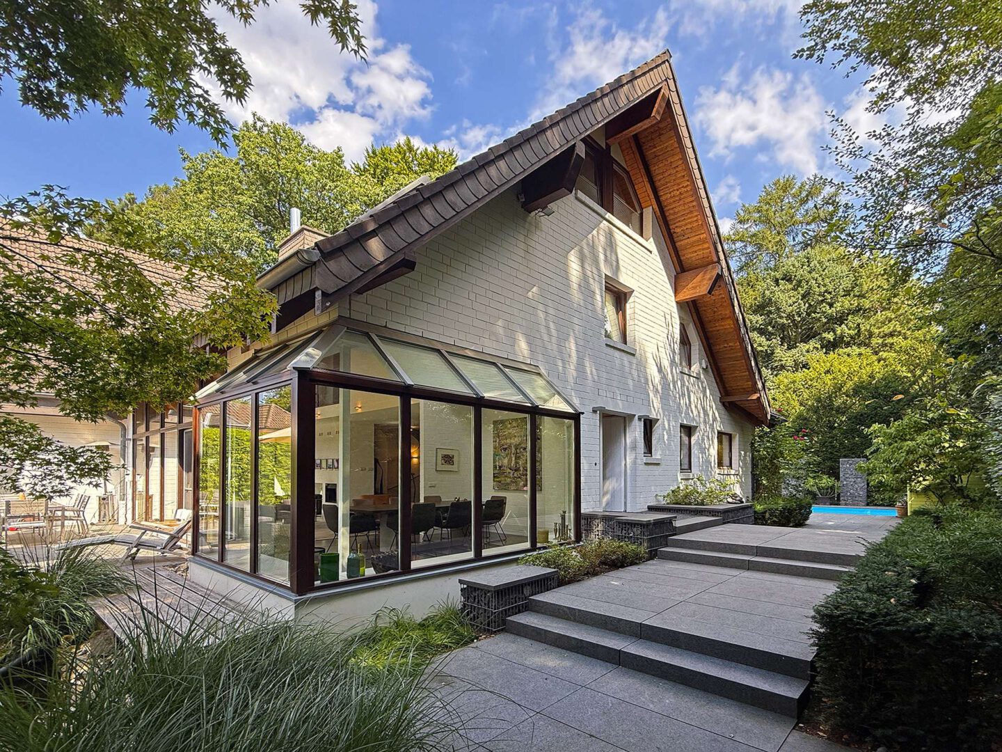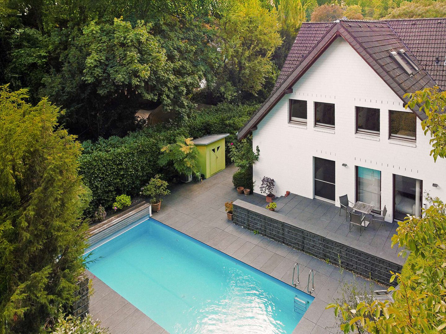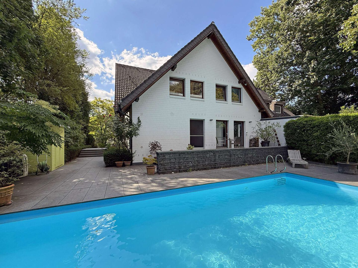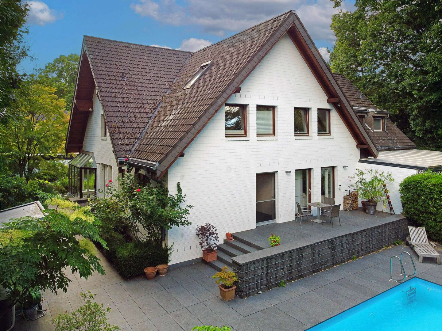 Die Außenbereiche sind ein wahres Highlight dieser Immobilie: Ein prachtvoll eingewachsener Garten mit altem Baumbestand, zwei Sonnenterrassen, Teich sowie das beheizbare Außenschwimmbecken (4 x 10 m) mit elektrischer Abdeckung bilden eine private Wohlfühloase direkt vor den Toren Düsseldorfs. Ein separates Garagenhaus mit Platz für zwei Fahrzeuge und zusätzlicher Stellfläche für Fahrräder und Gartengeräte rundet das exklusive Gesamtbild ab.