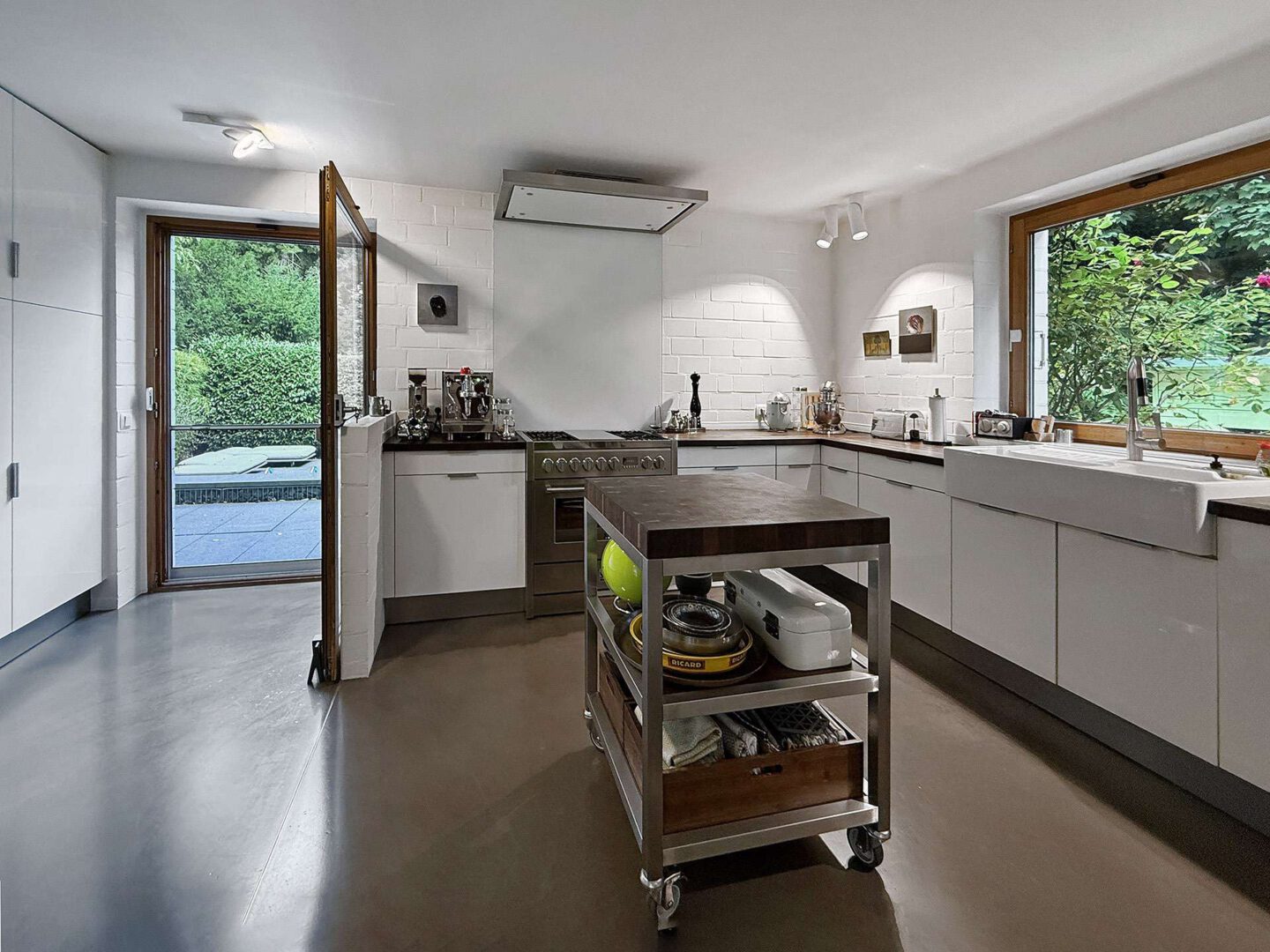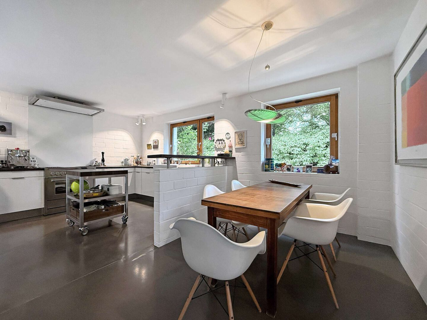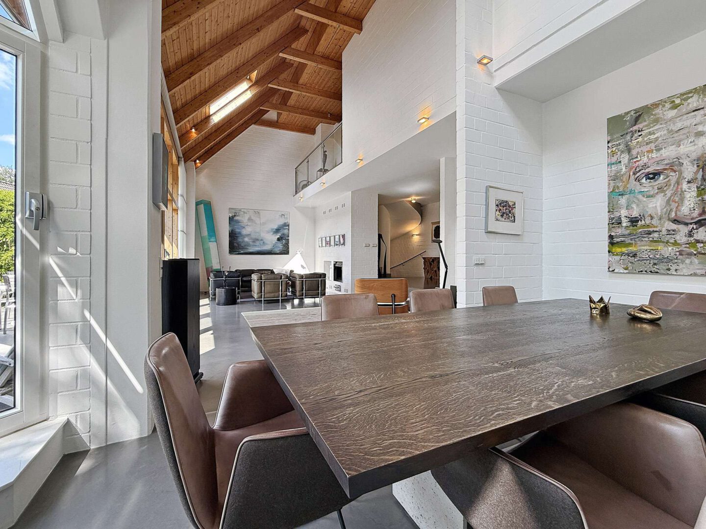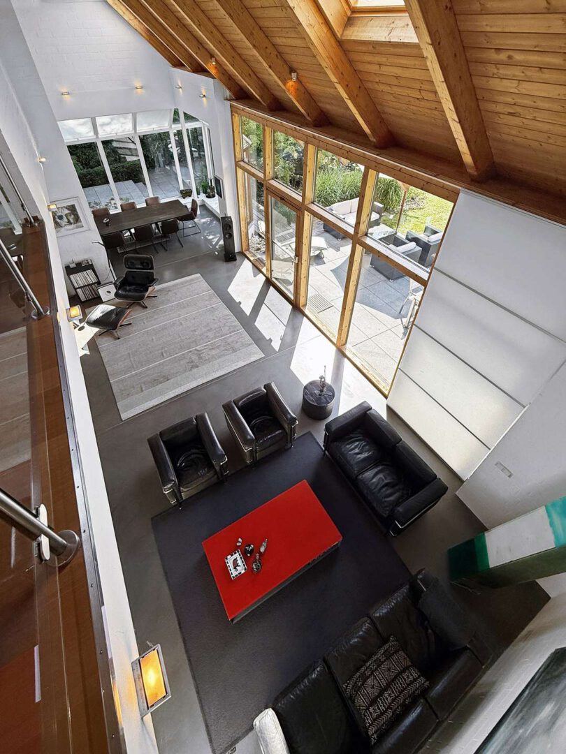 Über das Entrée mit Garderobe und Gäste-WC betreten Sie den imposanten Empfangsbereich samt einer skulpturalen Wendeltreppe, die den offenen Charakter des Hauses eindrucksvoll unterstreicht. Herzstück der Immobilie ist der beeindruckende Wohn- und Essbereich mit bis zu 8 Metern Deckenhöhe, sichtbar gearbeiteter Holzdachkonstruktion und einem Kamin. Die Kombination aus offenem Luftraum, hohen Fensterfronten und edlen Materialien schafft ein unvergleichlich lichtdurchflutetes Wohngefühl. Das angrenzende Esszimmer im Wintergartenstil sowie die moderne Küche von Eggersmann mit großem Edelstahl-Gasherd und hochwertigen Einbauten bilden den perfekten Rahmen für genussvolle Stunden mit Familie und Gästen. Ein separates Gästezimmer mit eigenem Bad en Suite bietet zudem einen komfortablen Rückzugsort für Besucher. Dank eines separaten Eingangs (Terrassentür) bietet sich das Zimmer auch hervorragend zur Unterbringung eines Au-pairs an.