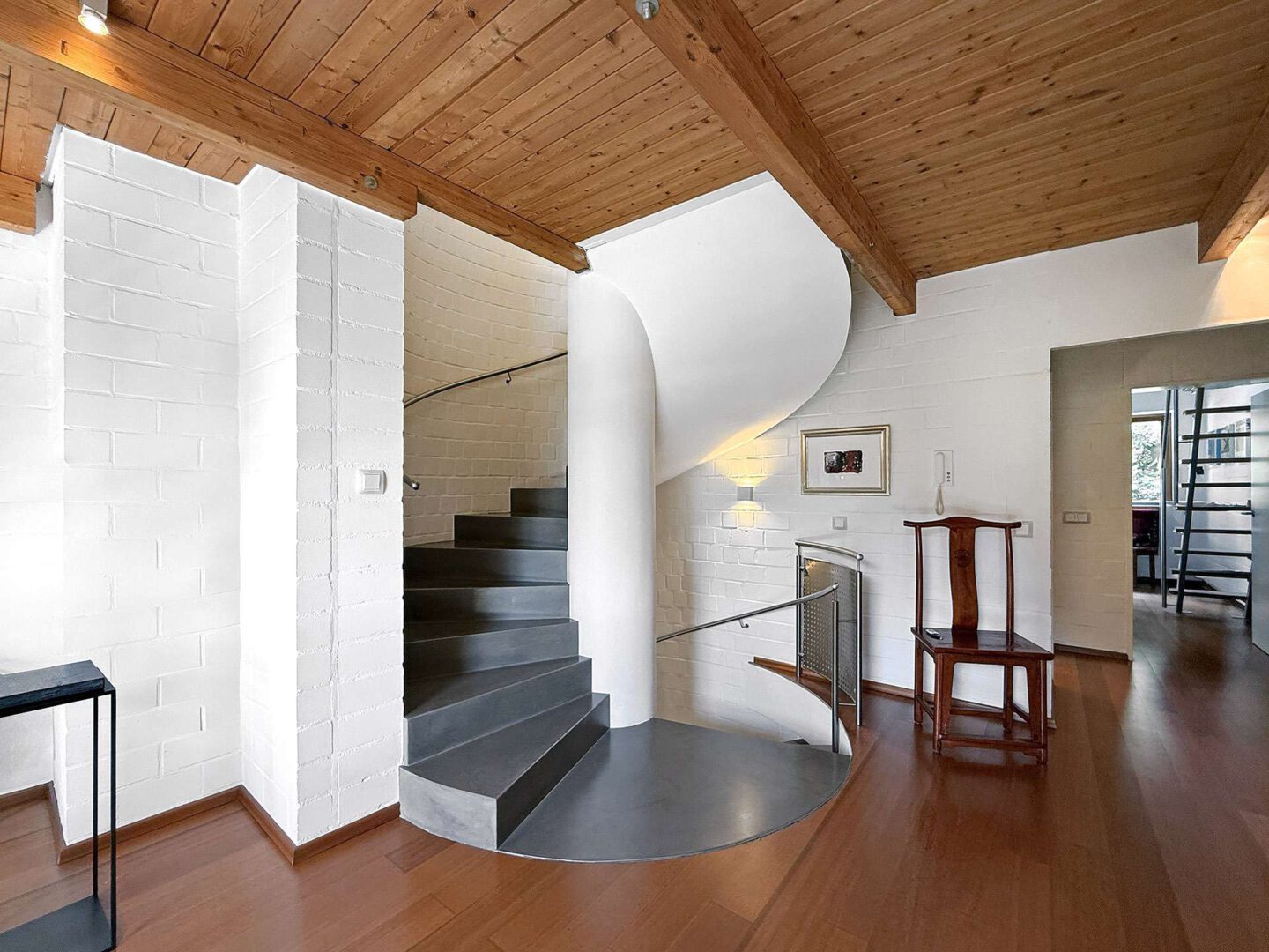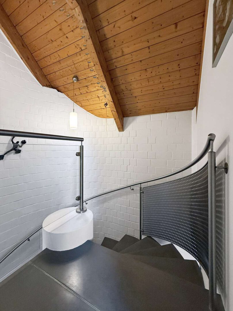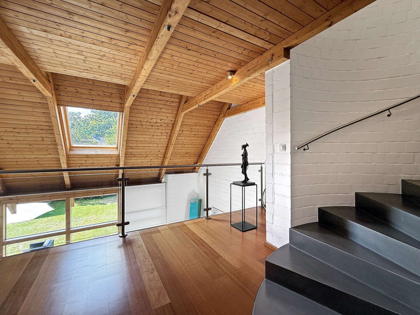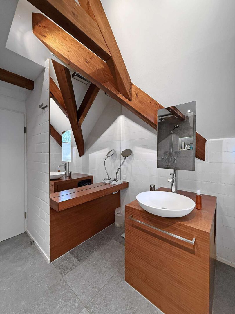 Im ausgebauten Spitzboden erwartet Sie ein charmantes, großzügiges Studiozimmer mit offenliegenden Dachbalken – ideal als Atelier, Bibliothek oder zusätzlicher Wohnbereich.