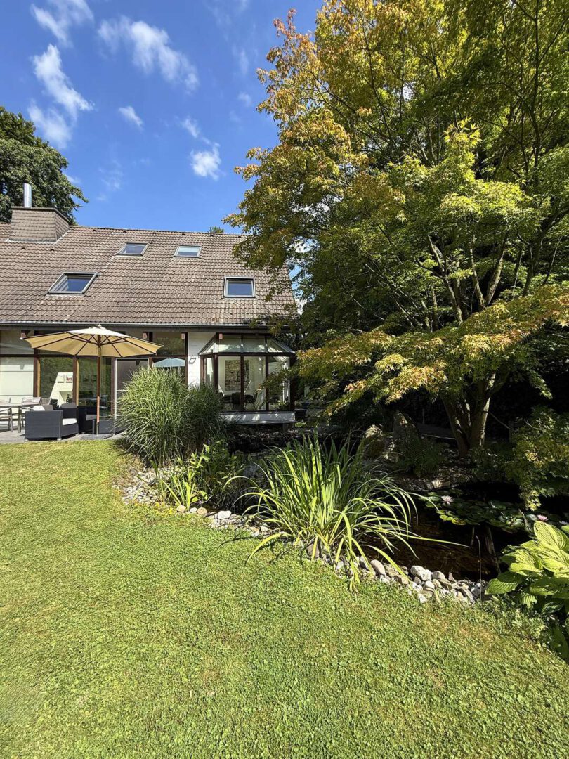 Die Außenbereiche sind ein wahres Highlight dieser Immobilie: Ein prachtvoll eingewachsener Garten mit altem Baumbestand, zwei Sonnenterrassen, Teich sowie das beheizbare Außenschwimmbecken (4 x 10 m) mit elektrischer Abdeckung bilden eine private Wohlfühloase direkt vor den Toren Düsseldorfs. Ein separates Garagenhaus mit Platz für zwei Fahrzeuge und zusätzlicher Stellfläche für Fahrräder und Gartengeräte rundet das exklusive Gesamtbild ab.