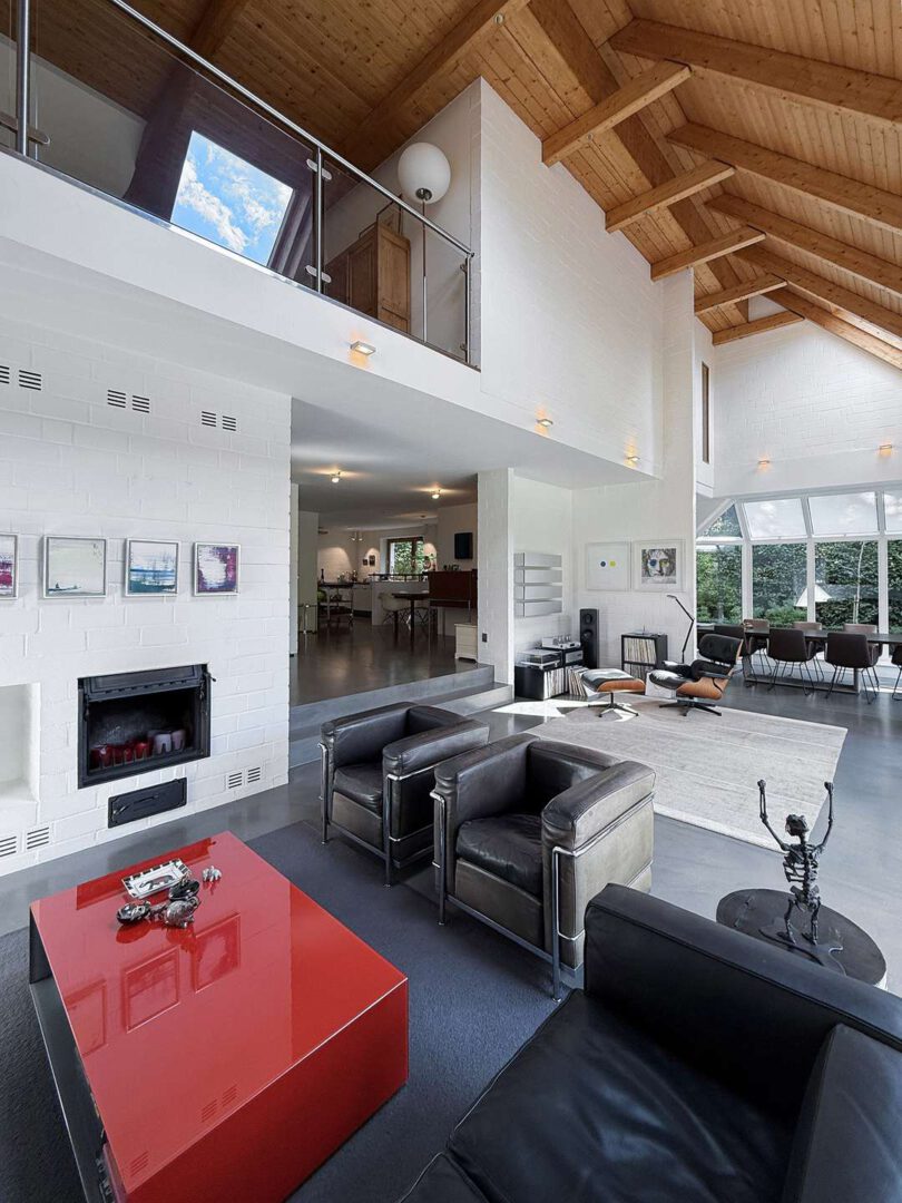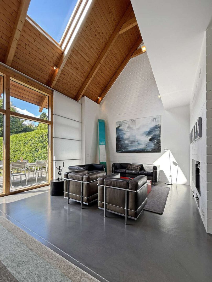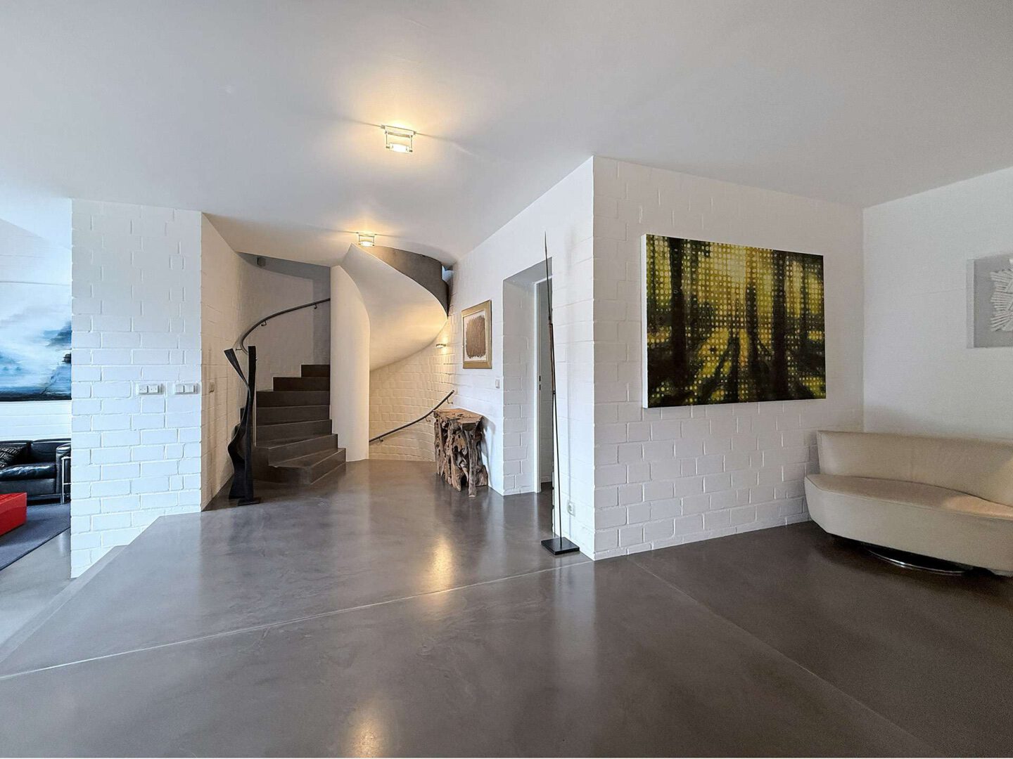 Über das Entrée mit Garderobe und Gäste-WC betreten Sie den imposanten Empfangsbereich samt einer skulpturalen Wendeltreppe, die den offenen Charakter des Hauses eindrucksvoll unterstreicht. Herzstück der Immobilie ist der beeindruckende Wohn- und Essbereich mit bis zu 8 Metern Deckenhöhe, sichtbar gearbeiteter Holzdachkonstruktion und einem Kamin. Die Kombination aus offenem Luftraum, hohen Fensterfronten und edlen Materialien schafft ein unvergleichlich lichtdurchflutetes Wohngefühl. Das angrenzende Esszimmer im Wintergartenstil sowie die moderne Küche von Eggersmann mit großem Edelstahl-Gasherd und hochwertigen Einbauten bilden den perfekten Rahmen für genussvolle Stunden mit Familie und Gästen. Ein separates Gästezimmer mit eigenem Bad en Suite bietet zudem einen komfortablen Rückzugsort für Besucher. Dank eines separaten Eingangs (Terrassentür) bietet sich das Zimmer auch hervorragend zur Unterbringung eines Au-pairs an.