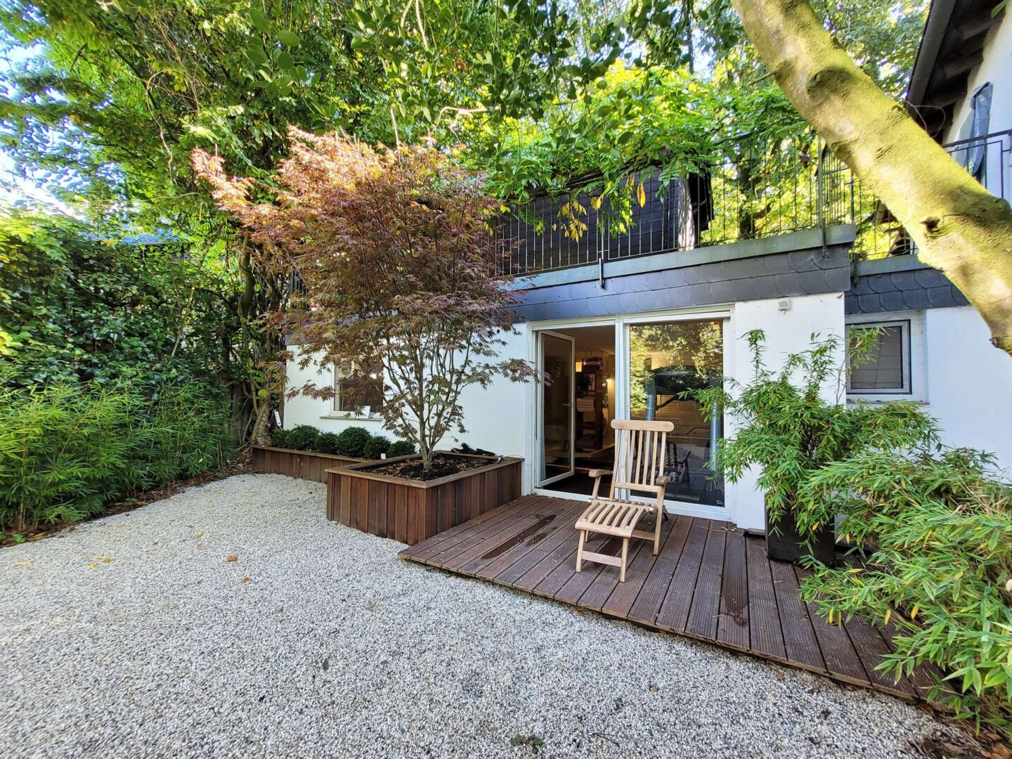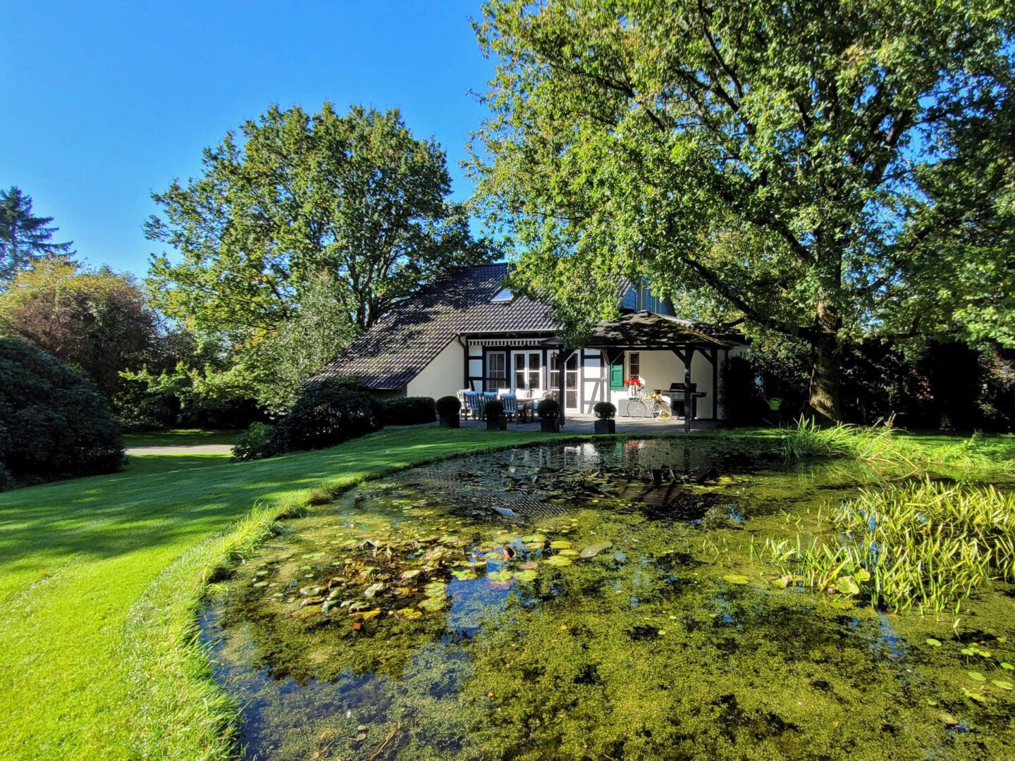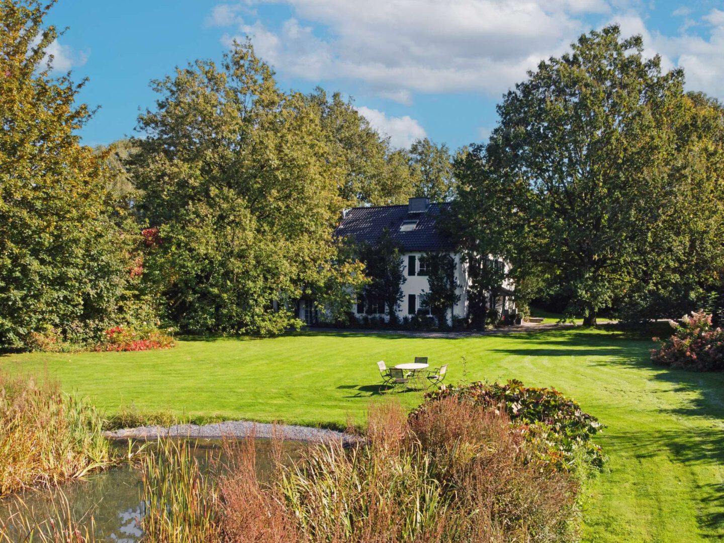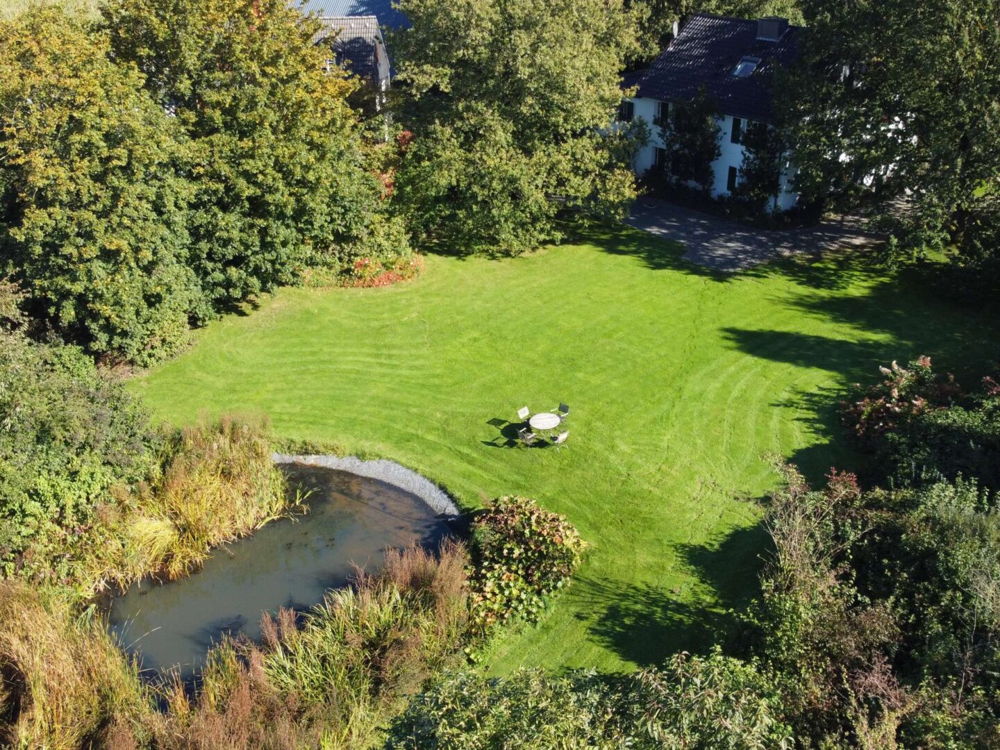 Der eingewachsene Park, in dessen Mitte das Wohnhaus steht, wurde von den renommierten Landschaftsarchitekten Weber, Klein & Maaß nach alten englischen Pflanzplänen gestaltet und realisiert. Eine großvolumige landschaftsnahe Hecke mit Ahornen, blühenden Gehölzen und Rhododendren schafft einen geschlossenen Gartenraum, der die Privatsphäre sichert. Im Inneren des Gartens strahlen gepflegte Rasenflächen Ruhe aus, die Sichtachsen werden von großen Eichen strukturiert. Zwei Teiche komplettieren den Erlebnisraum. Vor dem Wellnessbereich lädt ein Zen-Garten zum Meditieren ein.