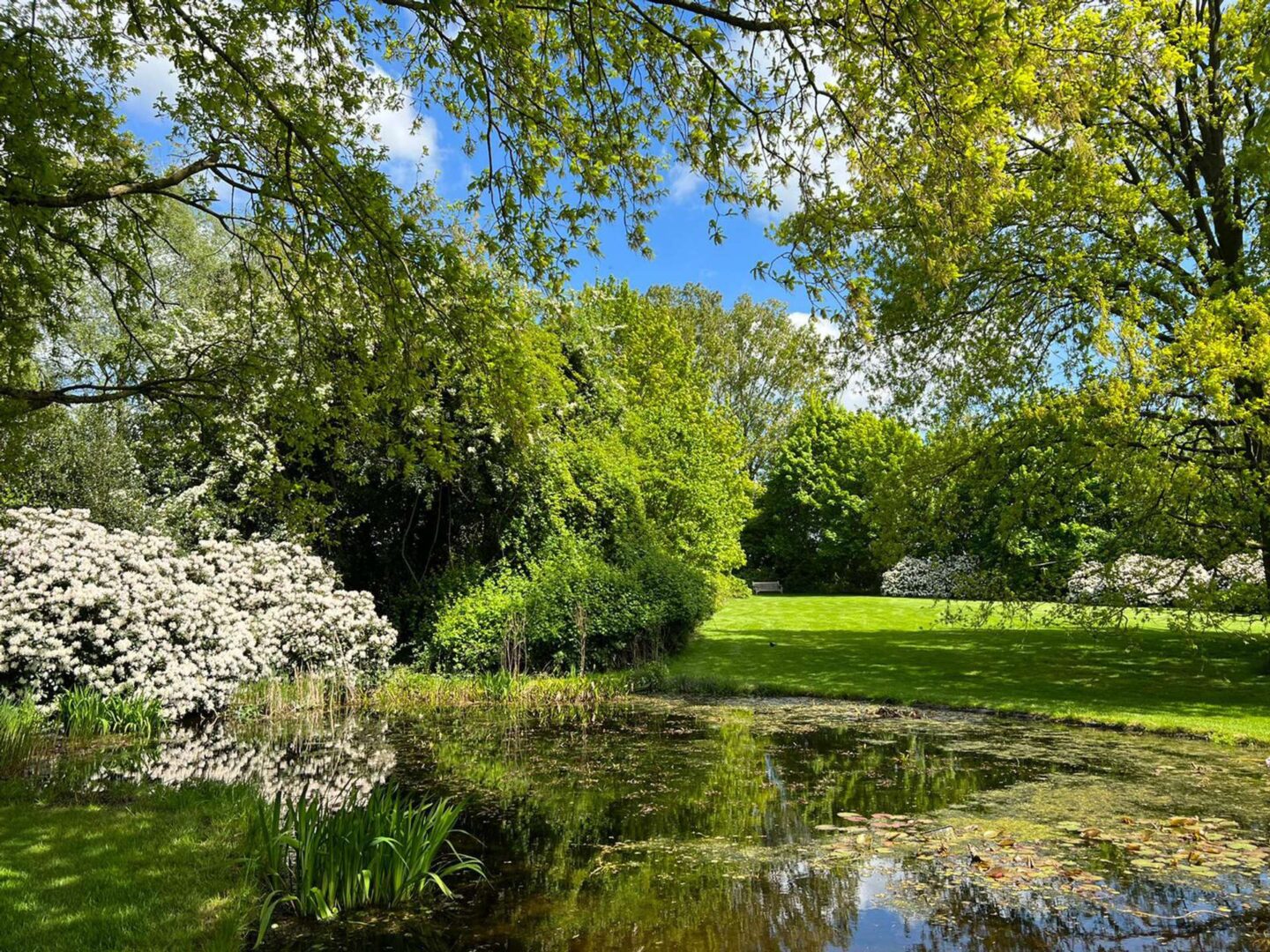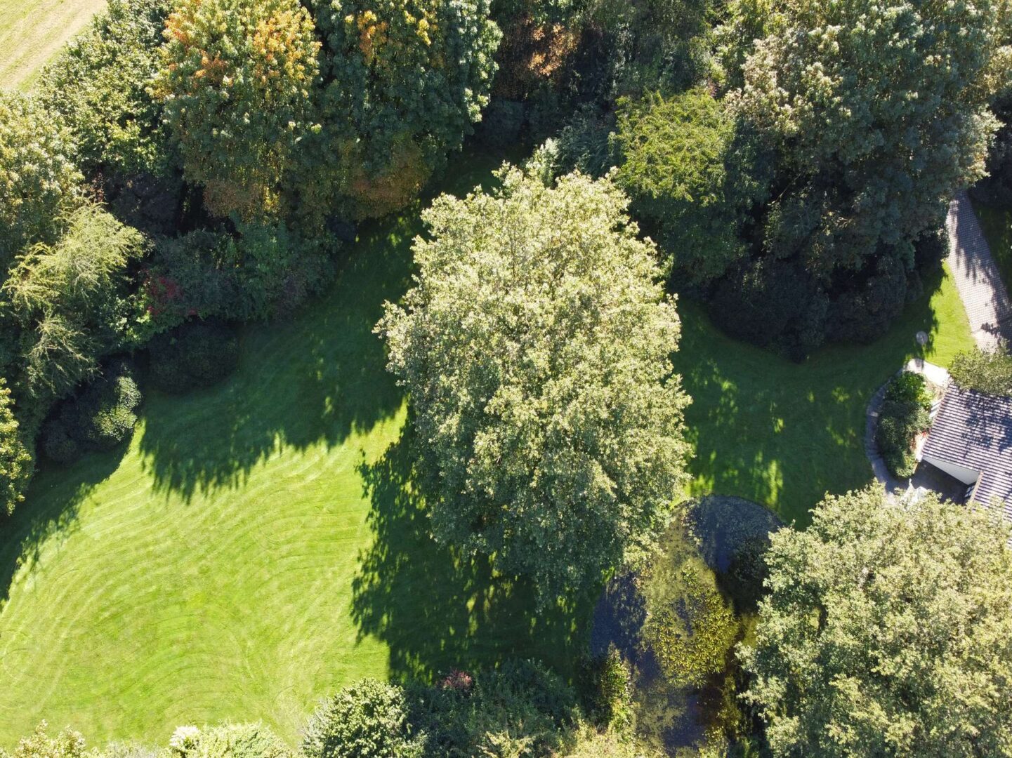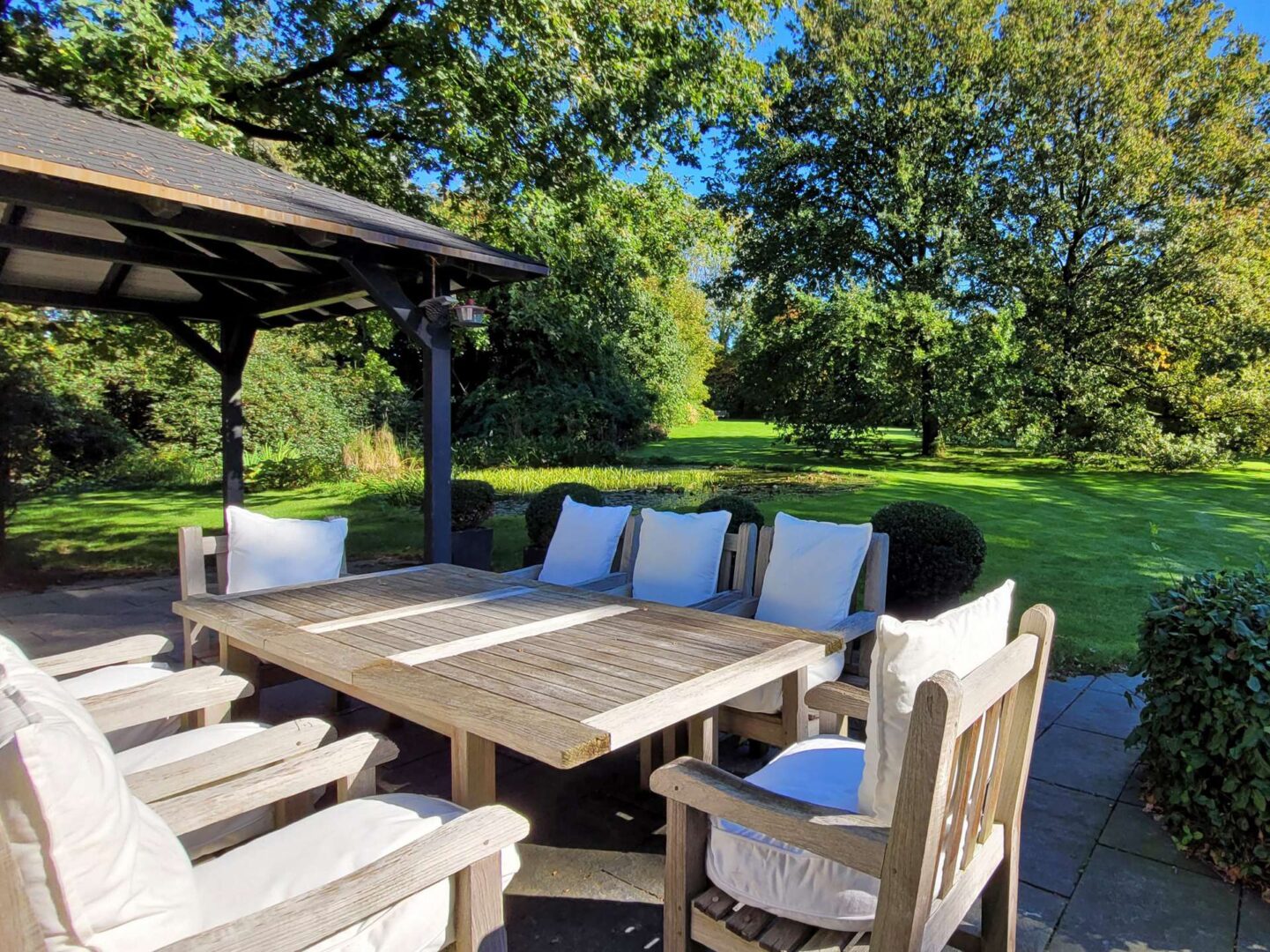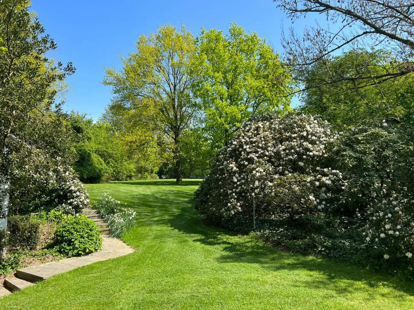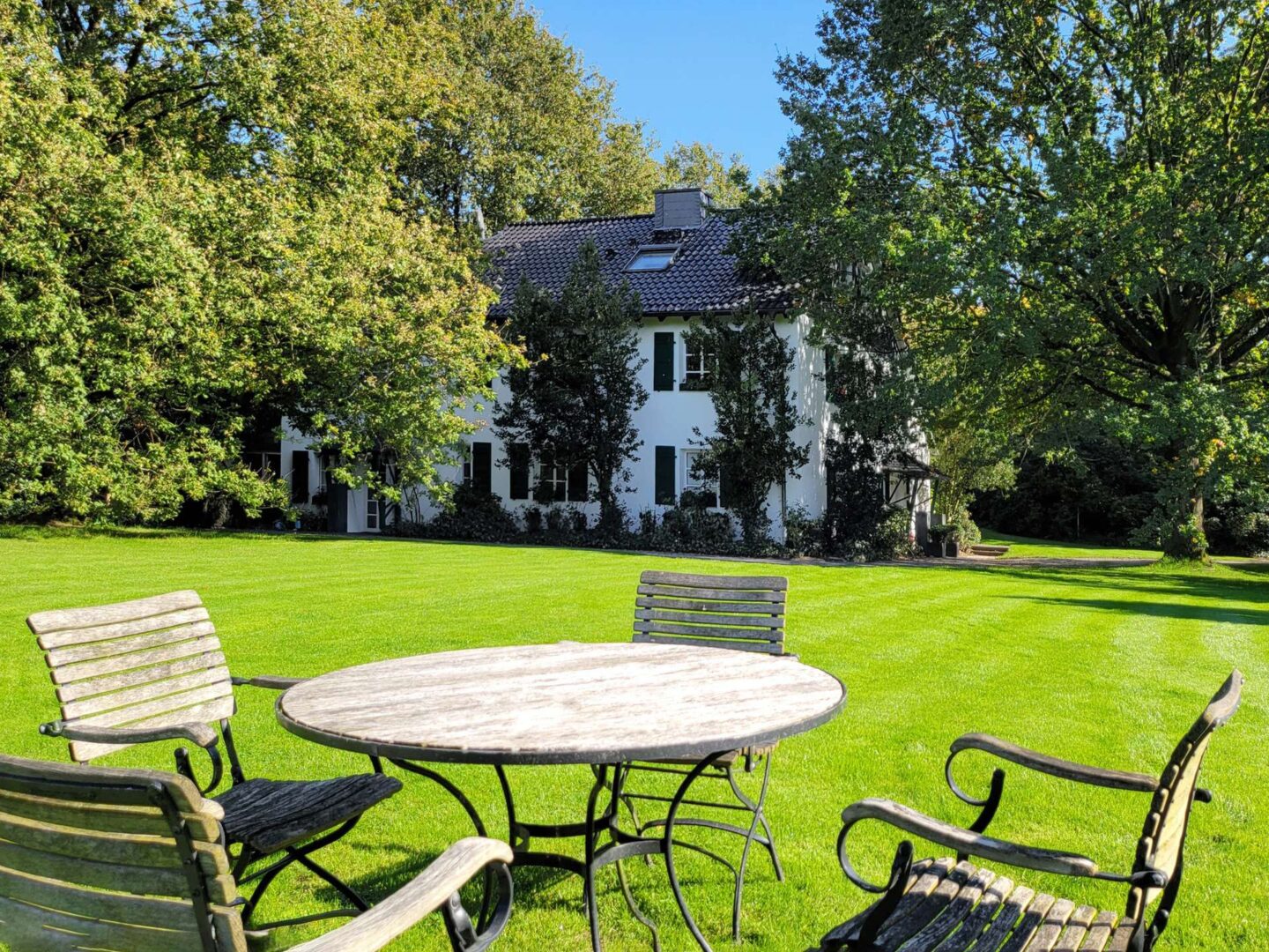 Der eingewachsene Park, in dessen Mitte das Wohnhaus steht, wurde von den renommierten Landschaftsarchitekten Weber, Klein & Maaß nach alten englischen Pflanzplänen gestaltet und realisiert. Eine großvolumige landschaftsnahe Hecke mit Ahornen, blühenden Gehölzen und Rhododendren schafft einen geschlossenen Gartenraum, der die Privatsphäre sichert. Im Inneren des Gartens strahlen gepflegte Rasenflächen Ruhe aus, die Sichtachsen werden von großen Eichen strukturiert. Zwei Teiche komplettieren den Erlebnisraum. Vor dem Wellnessbereich lädt ein Zen-Garten zum Meditieren ein.