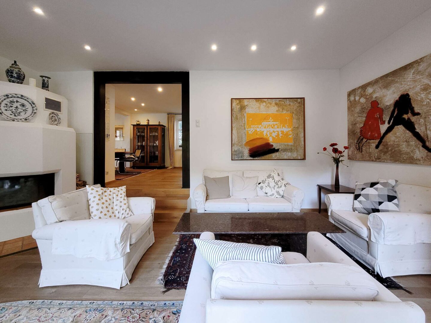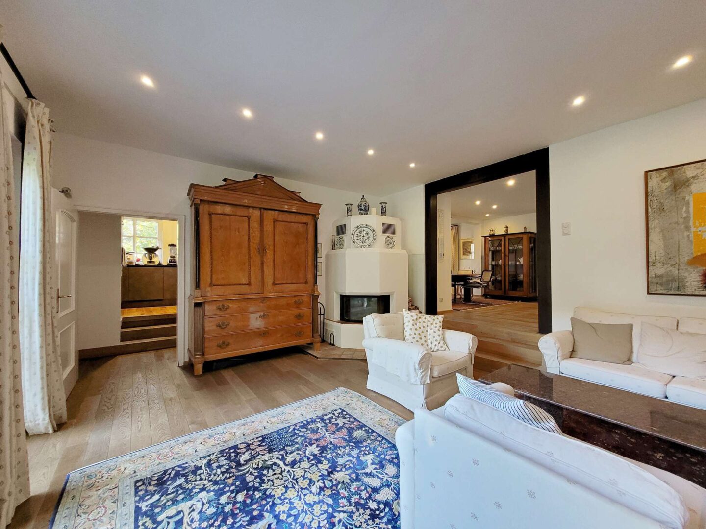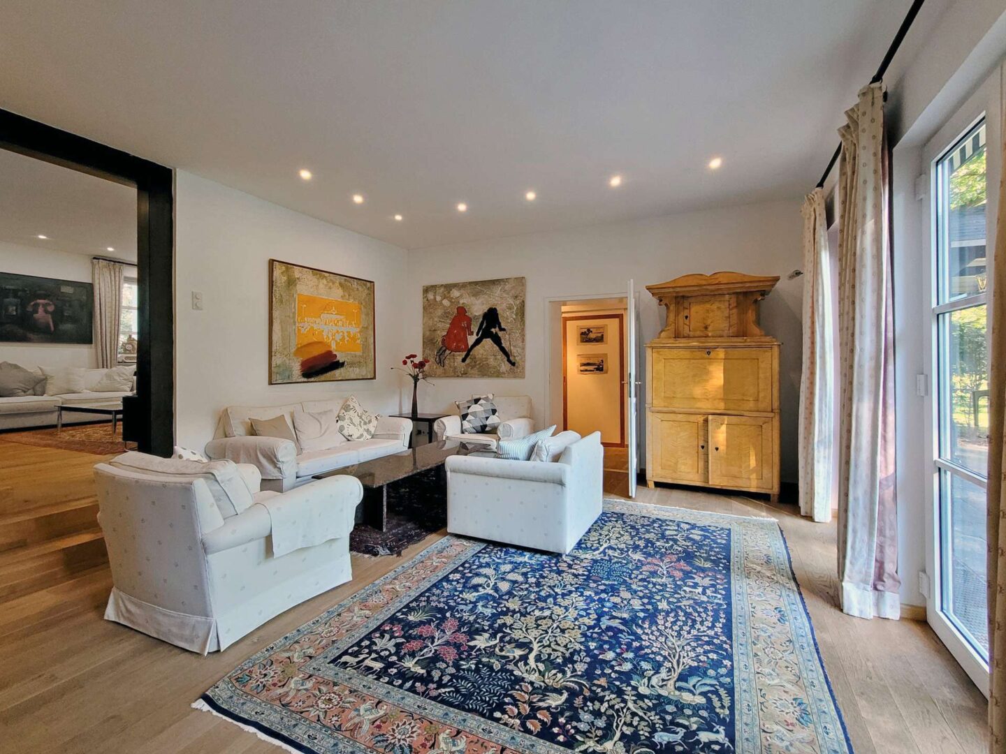 Über die Treppe im Entree gelangen Sie in das Obergeschoss, welches dank der Hanglage Richtung Osten ebenfalls ebenerdigen Zugang zu einem großen Garten samt Teichanlage bietet. Bodentiefe Sprossenfenster im gartenseitigen Kaminzimmer geben den Blick ins Grüne frei und bieten zugleich Zugang zu der großen, teilüberdachten Terrasse mit Außenküche.