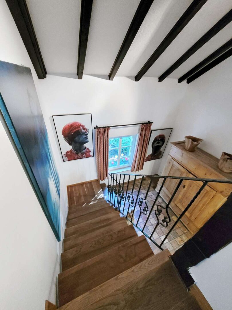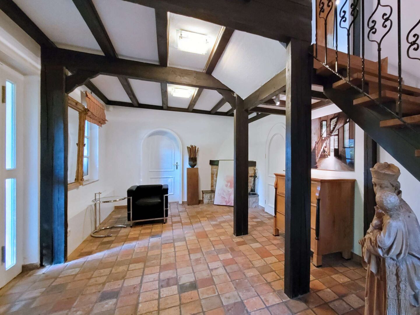 Über den seitlich gelegenen Haupteingang betreten Sie das einladende Entree im Erdgeschoss der Immobilie. Freigelegte Dach- und Stützbalken, ein offener Kamin, terracottafarbene Natursteinfliesen und eine Holztreppe mit schmiedeeisernem Geländer verleihen dem Raum einen ganz besonderen anmutenden Charme.