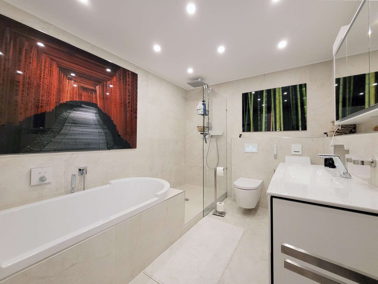 Über eine weitere Türe im Entree gelangen Sie in den restlichen Teil des Erdgeschosses. Sie betreten zunächst den großen Hauswirtschaftsraum, von dem der Heizungsraum, ein Kellerraum und ein WC abgehen. Am Ende des Traktes schließt sich ein einstöckiger Anbau an, welcher im Zuge der Sanierungsarbeiten nachträglich errichtet wurde. Hier befindet sich ein großer Fitness - und Wellnessbereich mit Sauna, Solarium, begehbarer Dusche und Ruhebereich. Über große bodentiefe Türelemente schauen Sie in den Zen-Garten, weiterhin haben Sie Zugang zu der Terrasse im Außenbereich, welche insbesondere nach dem Saunieren zum Entspannen im Freien einlädt.