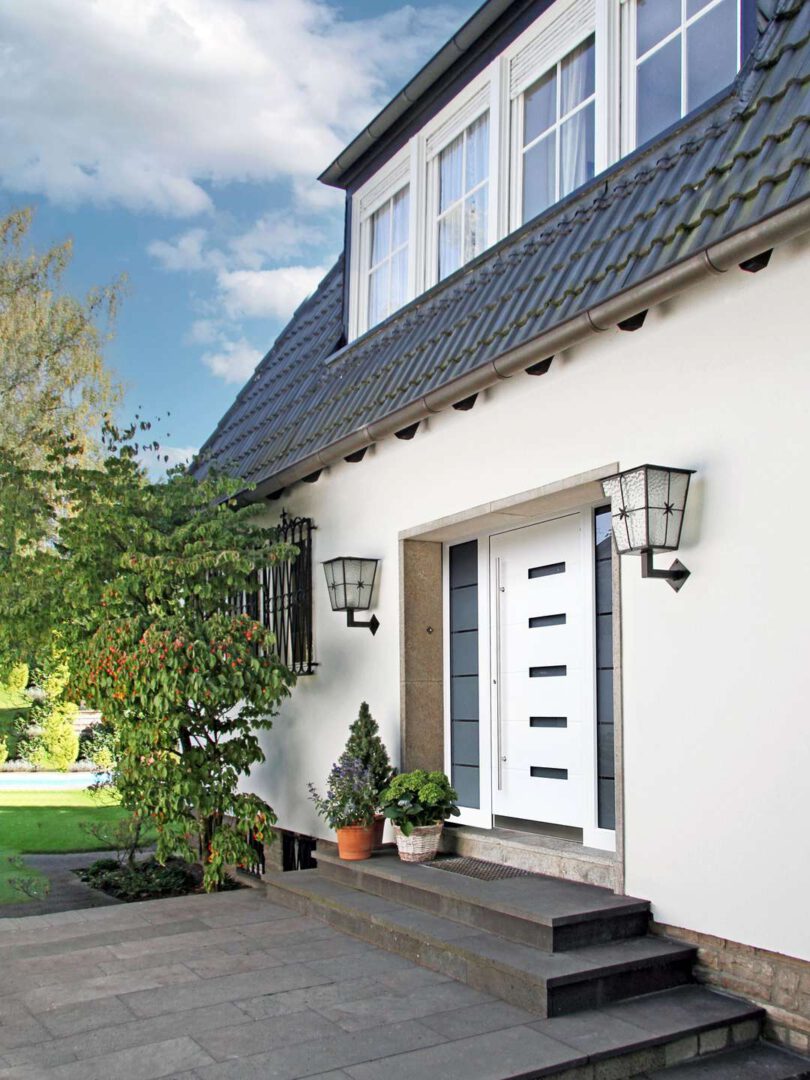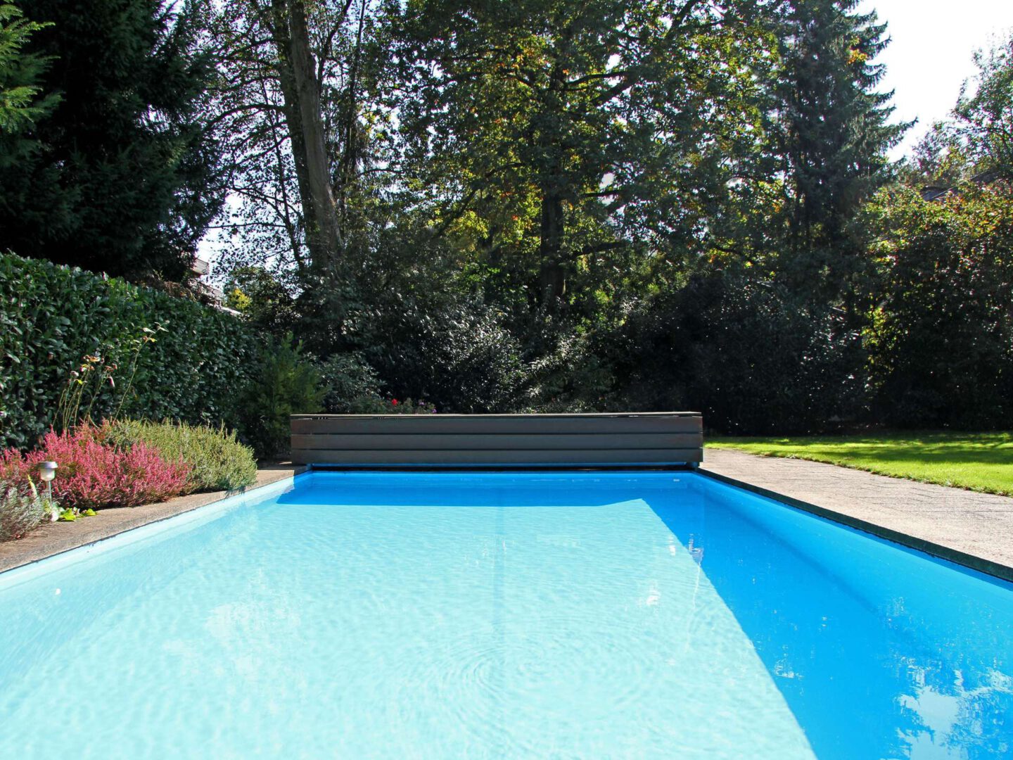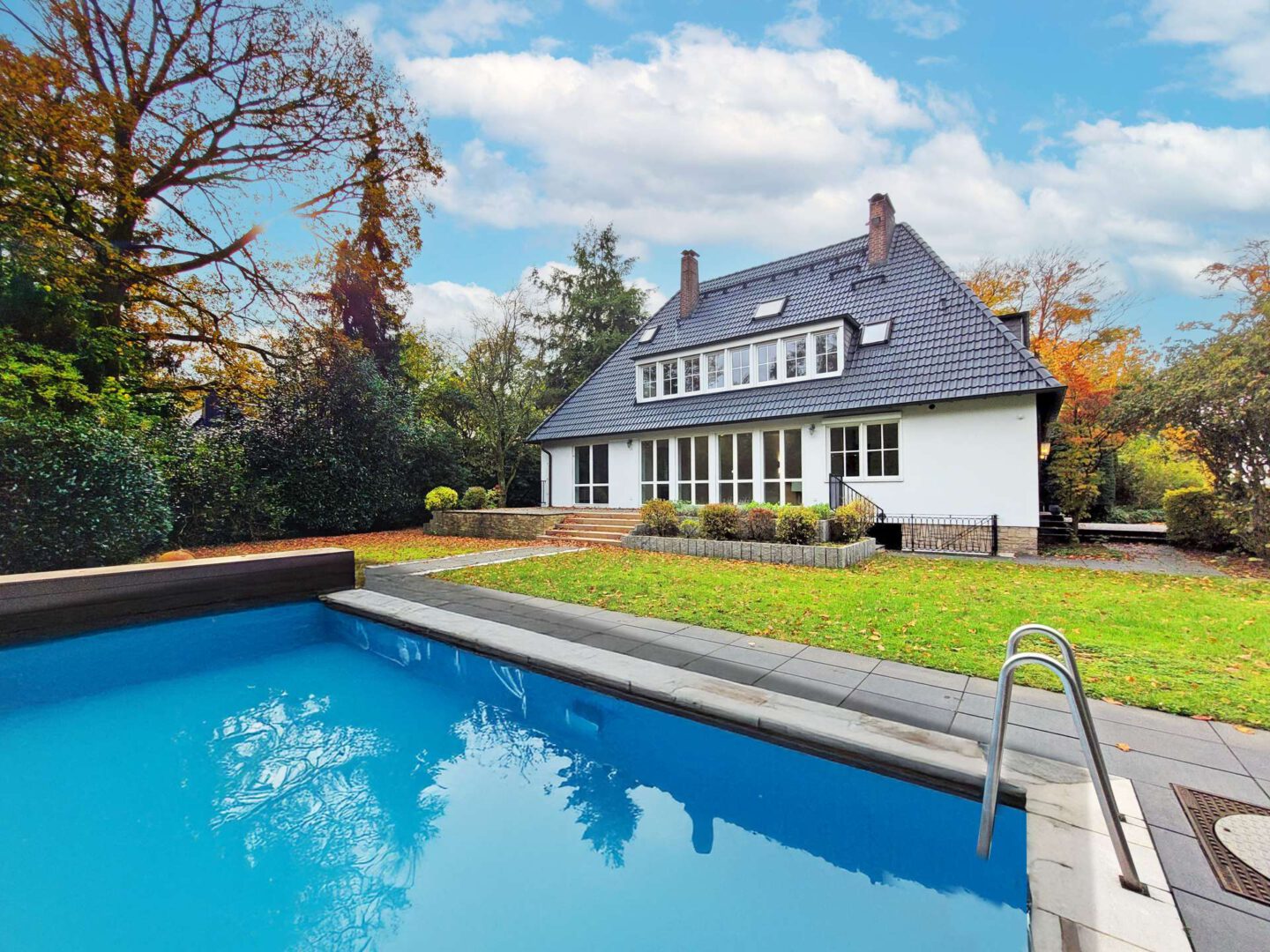 Der Außenbereich bietet einen hohen Freizeitwert: im vorderen Garten bilden eine große Hauptterrasse mit Zierbrunnen sowie eine überdachte Terrasse die Bühne für das Leben im Grünen. Im rückwärtigen Garten laden eine weitere Terrasse sowie das Außenschwimmbecken (ca. 4 × 9 m) und ein Blockhaus mit Sauna für vier Personen und Ruhezone zur Entspannung ein.