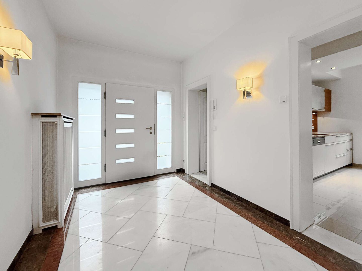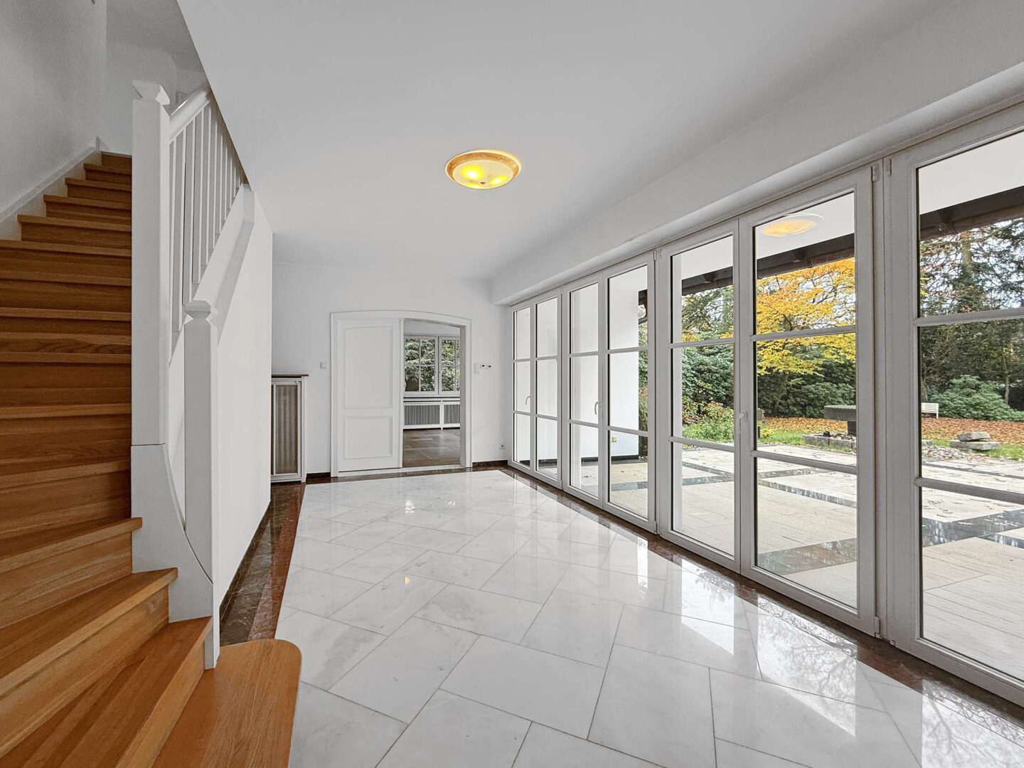 Sie betreten das Haus über ein einladendes Entrée mit Garderobe und Gäste-WC. Daran schließt sich die großzügige Diele mit dem eleganten Treppenaufgang an. Beide Bereiche sind mit Marmor ausgelegt und wirken durch die hellen Flächen ruhig und repräsentativ. Die raumbreite Fensterfront entlang der Diele öffnet den direkten Zugang zur teilüberdachten Terrasse und in den Süd-West-Garten. Über eine doppelflügelige Tür gelangen Sie weiter in den Wohnbereich, der die gesamte Hausbreite einnimmt und zu beiden Seiten den Blick in den Garten freigibt. Von hier besteht auch der Zugang zur rückwärtigen Gartenseite mit einer weiteren Terrasse, Außenpool und Blocksauna.