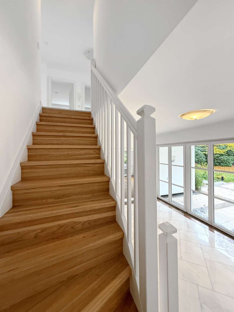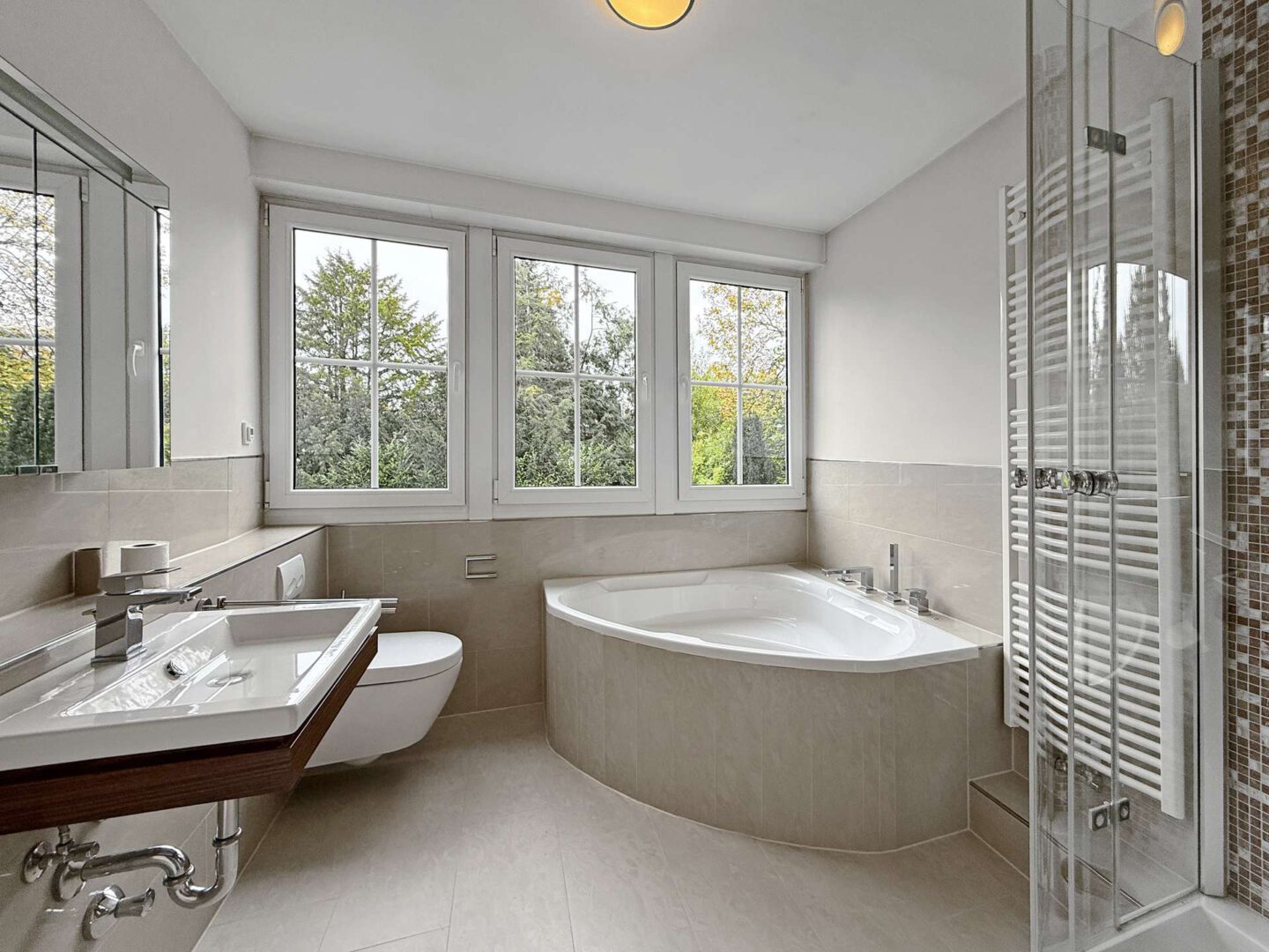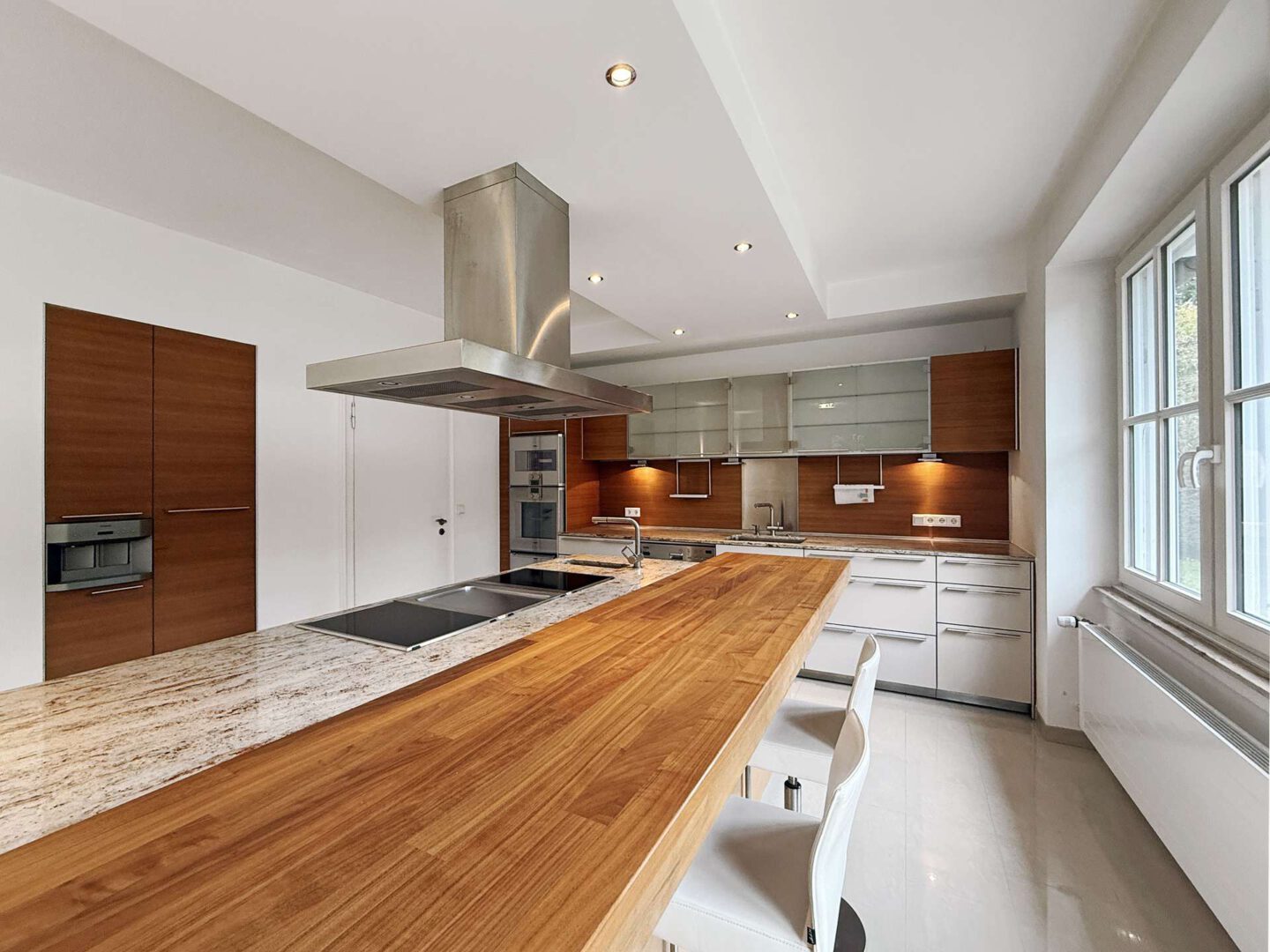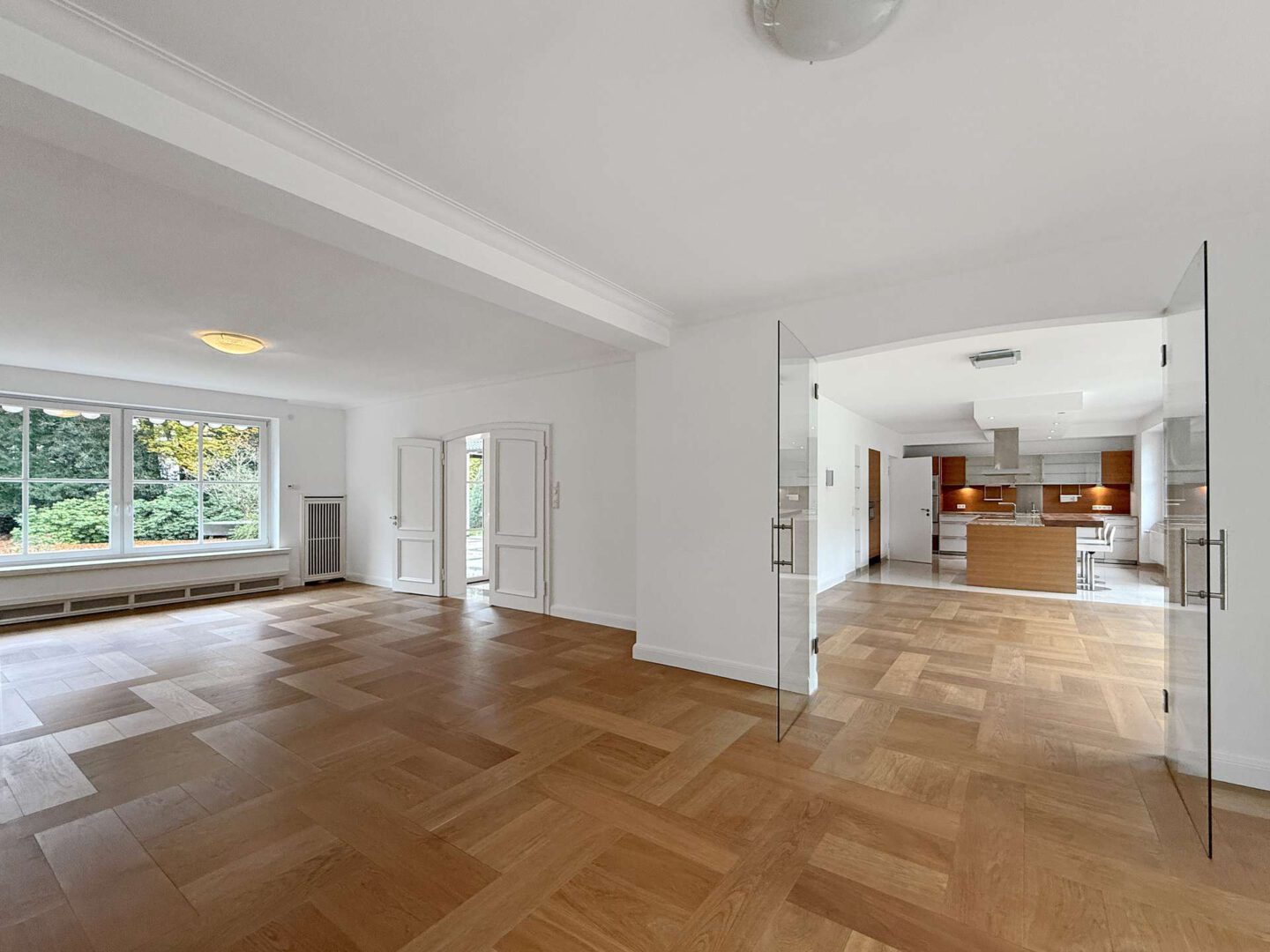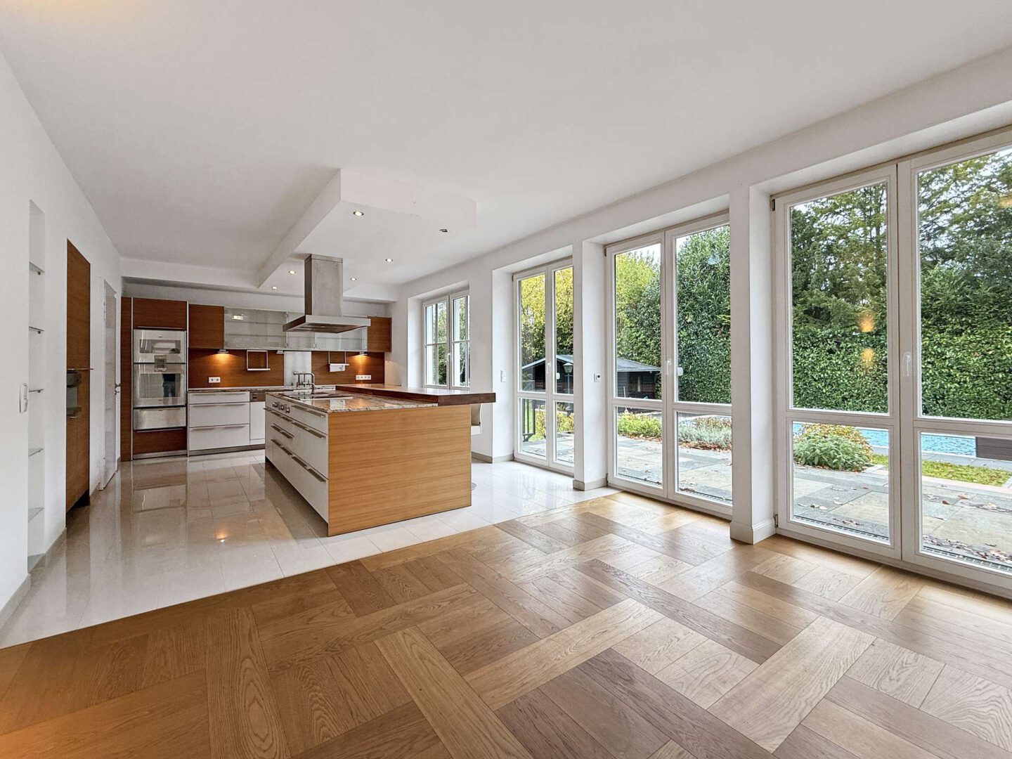 Eine moderne, doppelflügelige Glastür verbindet den Wohnbereich mit der luxuriös ausgestatteten Wohnküche und dem großen Essplatz. Die Einbauküche von Bulthaup wurde auf Maß geplant und ist mit hochwertigen Elektrogeräten ausgestattet. Bodentiefe Fenster geben den Blick und den Zugang zur Terrasse frei. Ein großes Arbeitszimmer mit Schrankeinbauten – ruhig gelegen, mit Blick in den Garten und Zugang zur Terrasse – komplettiert das Raumangebot im Erdgeschoss.