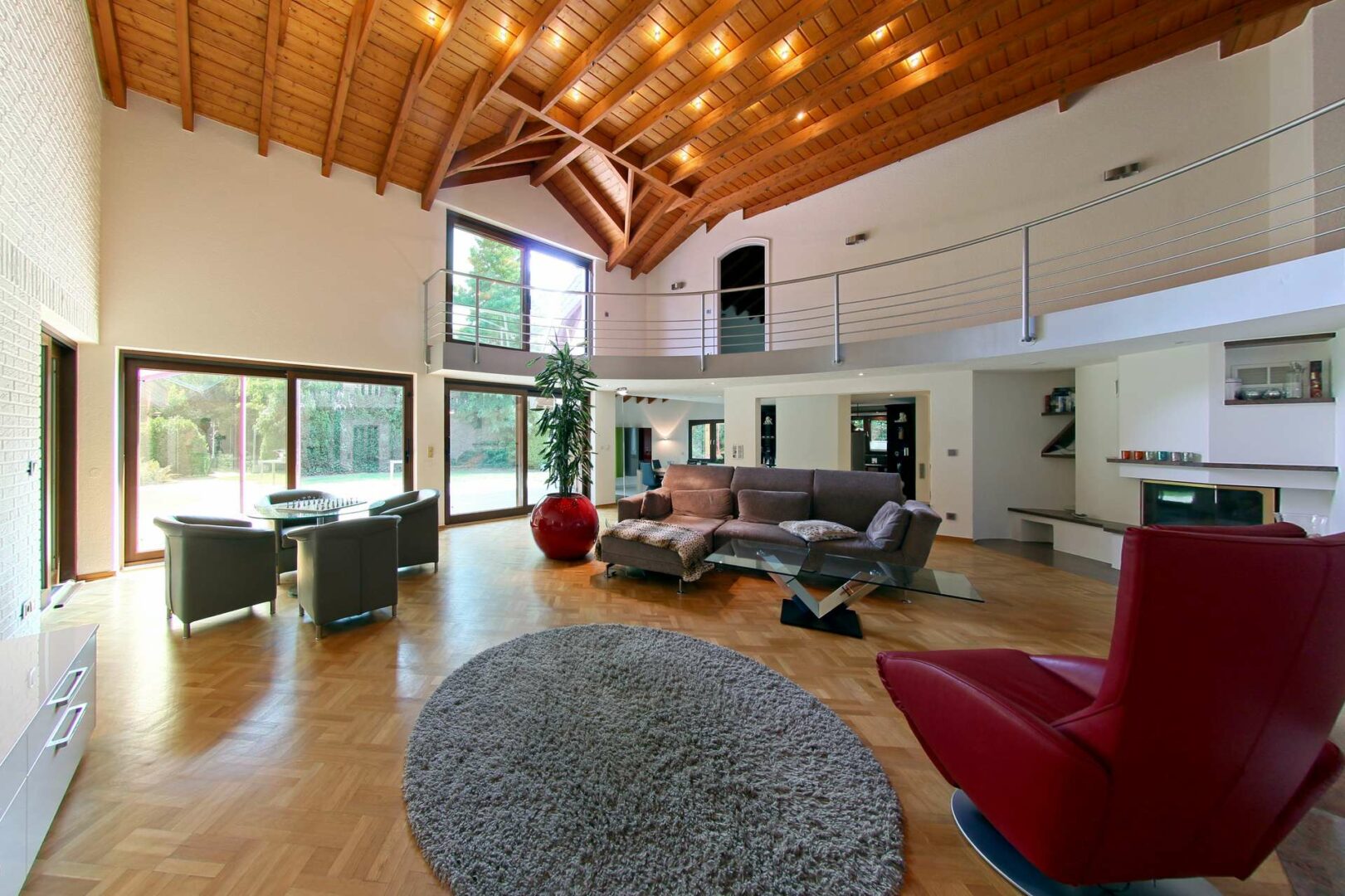 Über das helle und freundliche Entree gelangen Sie in den großzügigen und offen gestalteten Wohnbereich mit bis zu 5 Meter hoher Decke, umlaufender Galerie und offenen Dachbalken. Bodentiefe Fenster mit Zugang zur Terrasse sorgen für lichtdurchflutete Räume und geben den Blick auf den Garten frei.