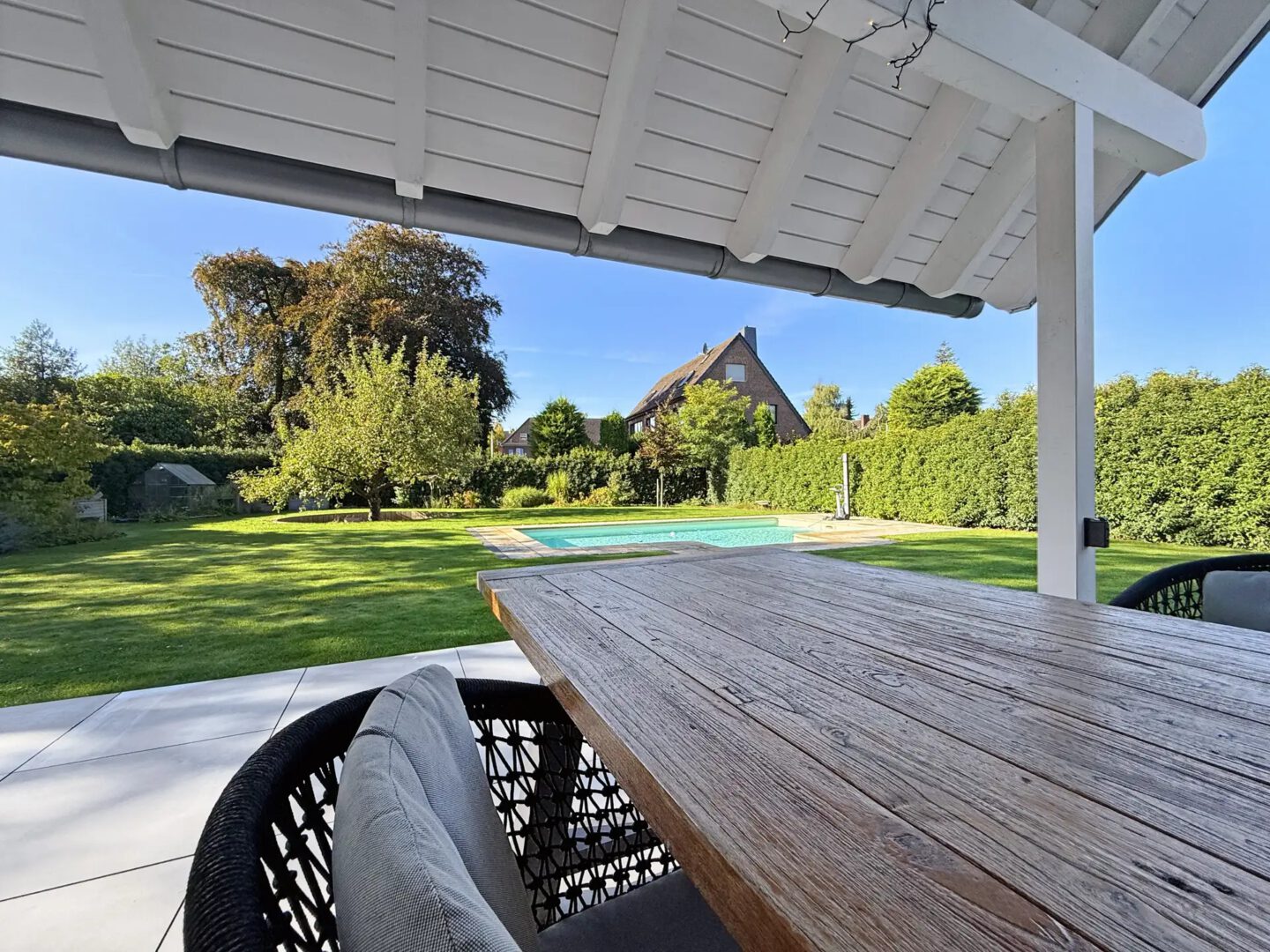 Der Garten ist pflegeleicht angelegt und mit hohen Hecken umfriedet. Die Terrasse in Süd-West-Lage, weitläufige Rasenflächen und das Außenschwimmbecken sorgen für eine hohe Aufenthaltsqualität im Freien. Die Wasserversorgung im Garten erfolgt mittels eines eigenen Brunnens.