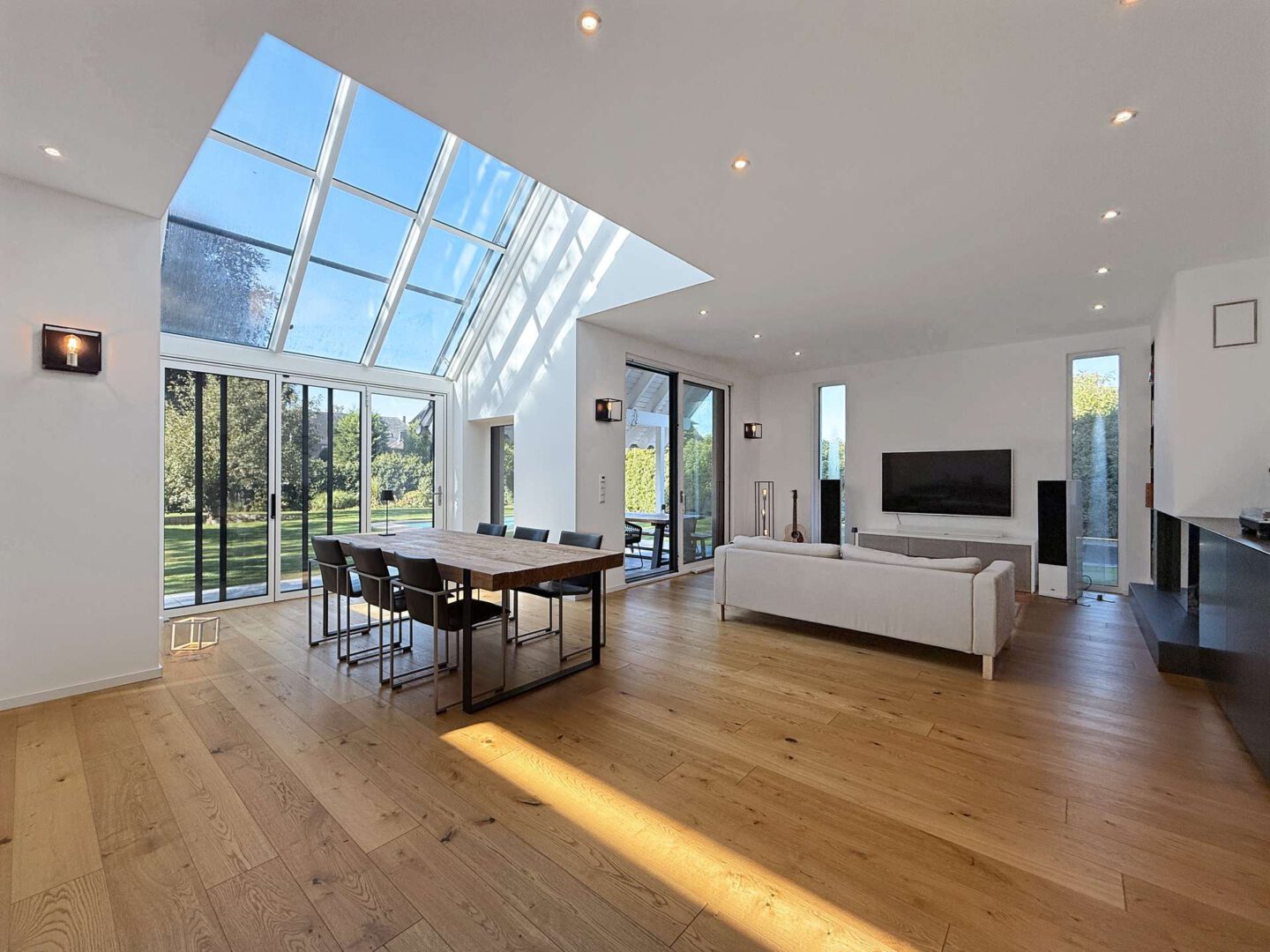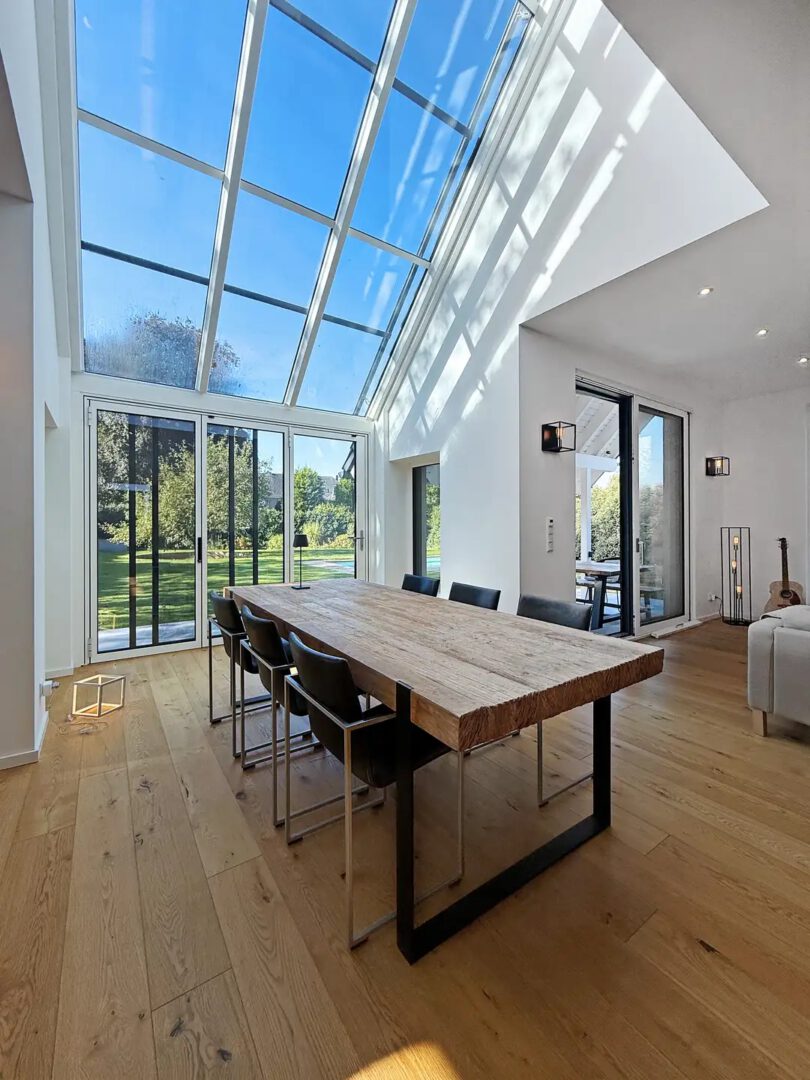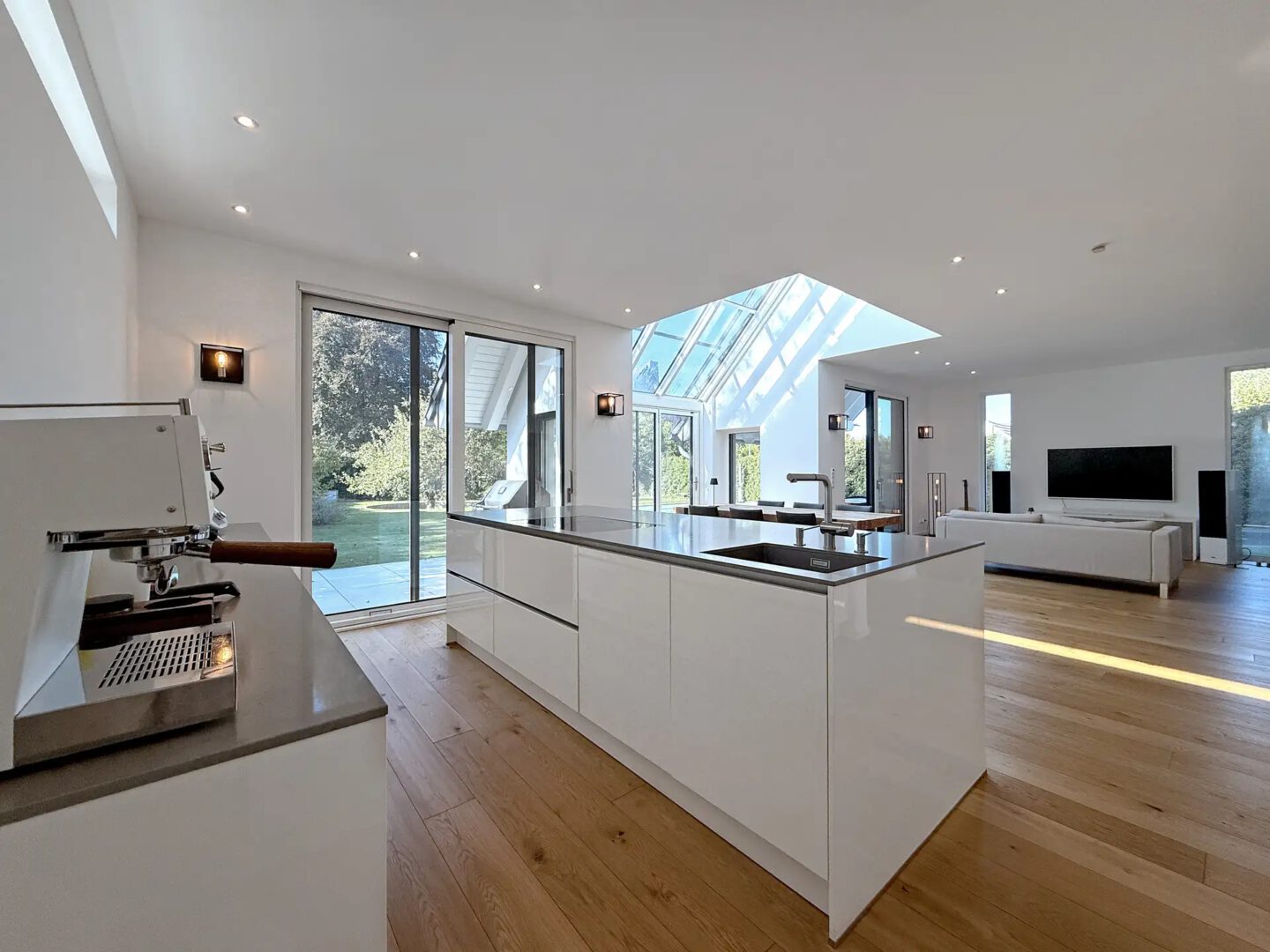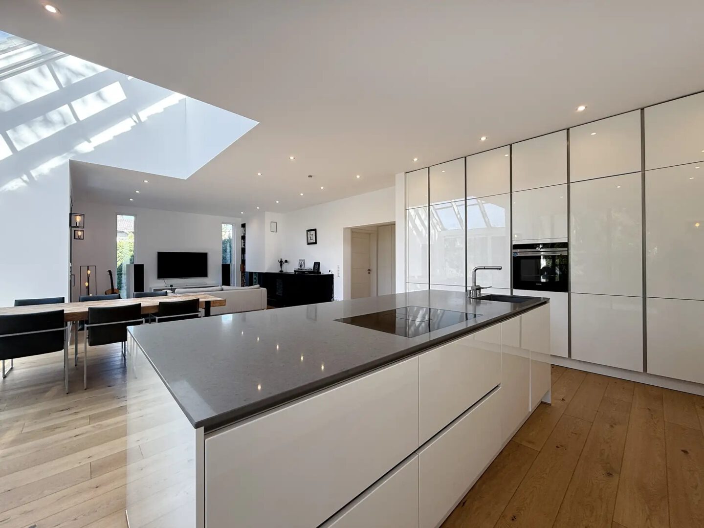 Über das Entree mit Treppenaufgang öffnet sich der weitläufige Wohn-/Essbereich. Bodentiefe Fenster und ein bis zu ca. sechs m hoher Luftraum über dem Essplatz sorgen für reichlich Tageslicht sowie ein großzügiges Raumgefühl und geben den Blick auf den Garten samt Außenschwimmbad frei. Große Schiebeelemente bieten Zugang zur Terrasse. Ein eleganter Gaskamin im Wohnbereich sorgt für eine behagliche und gemütliche Atmosphäre. Die offen gestaltete Küche der Marke Häcker wurde von dem Küchenstudio Thelen geplant und auf Maß angefertigt. Sie überzeugt mit hochwertigen Elektrogeräten, einer großen Kochinsel mit reichlich Stauraum sowie raumhohen Schrankeinbauten.
