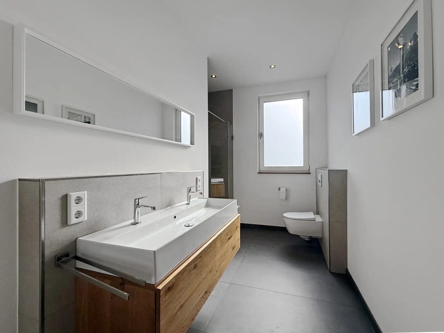 Darüber hinaus stehen Ihnen im Erdgeschoss ein gemütliches Zimmer zur individuellen Nutzung sowie ein modernes Duschbad zur Verfügung. Ein praktischer Hausanschluss-/Hauswirtschaftsraum mit Stellplätzen für Waschmaschine und Trockner ist ebenfalls vorhanden.