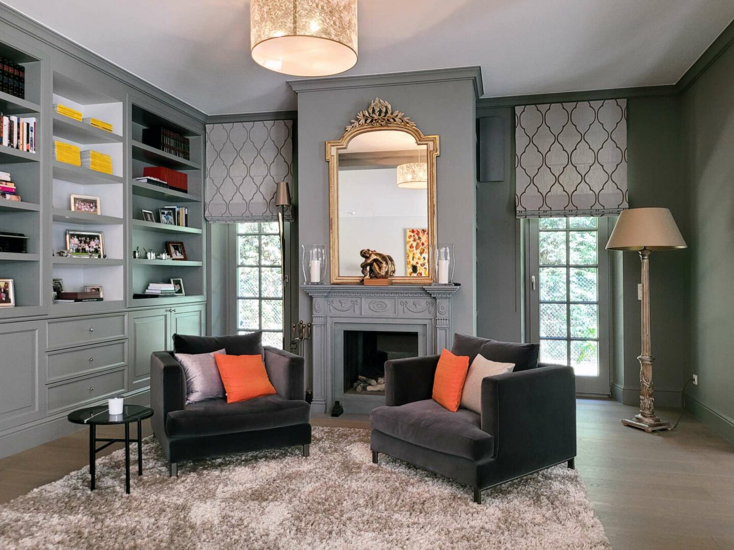 Den weitläufigen, mit edlem Parkett ausgelegten Wohnbereich betreten Sie vom Entree aus durch eine doppelflügelige Glastüre mit Sprossenaufteilung. Über bodentiefe Fenster, teils in Sprossenoptik, eröffnet sich den Bewohnern der Blick auf das parkähnliche Grundstück. Ein charmanter Kaminbereich mit Bibliothekswänden verleiht dem Raum eine warme und gemütliche Atmosphäre, perfekt für entspannte Abende oder gesellige Zusammenkünfte.