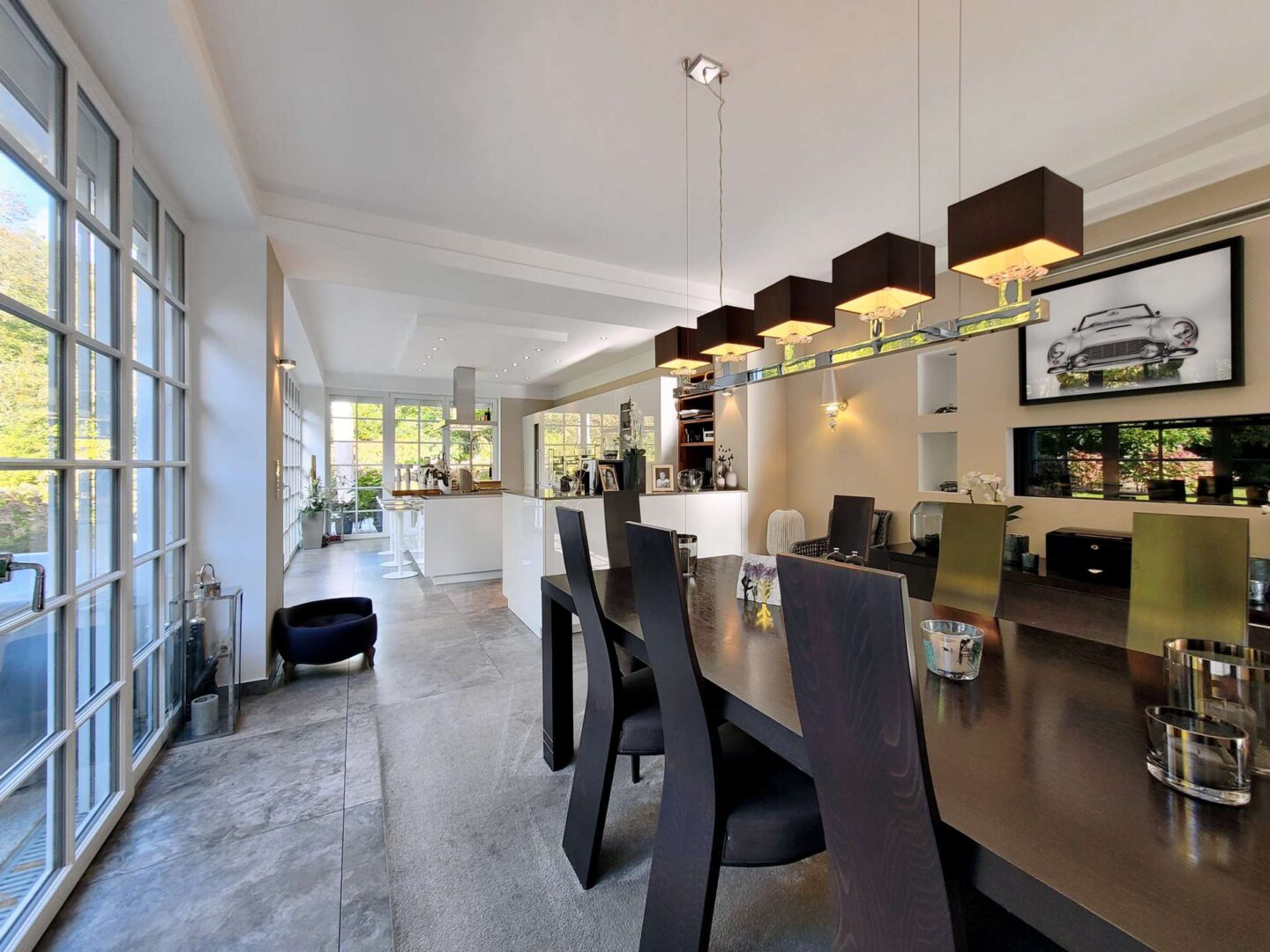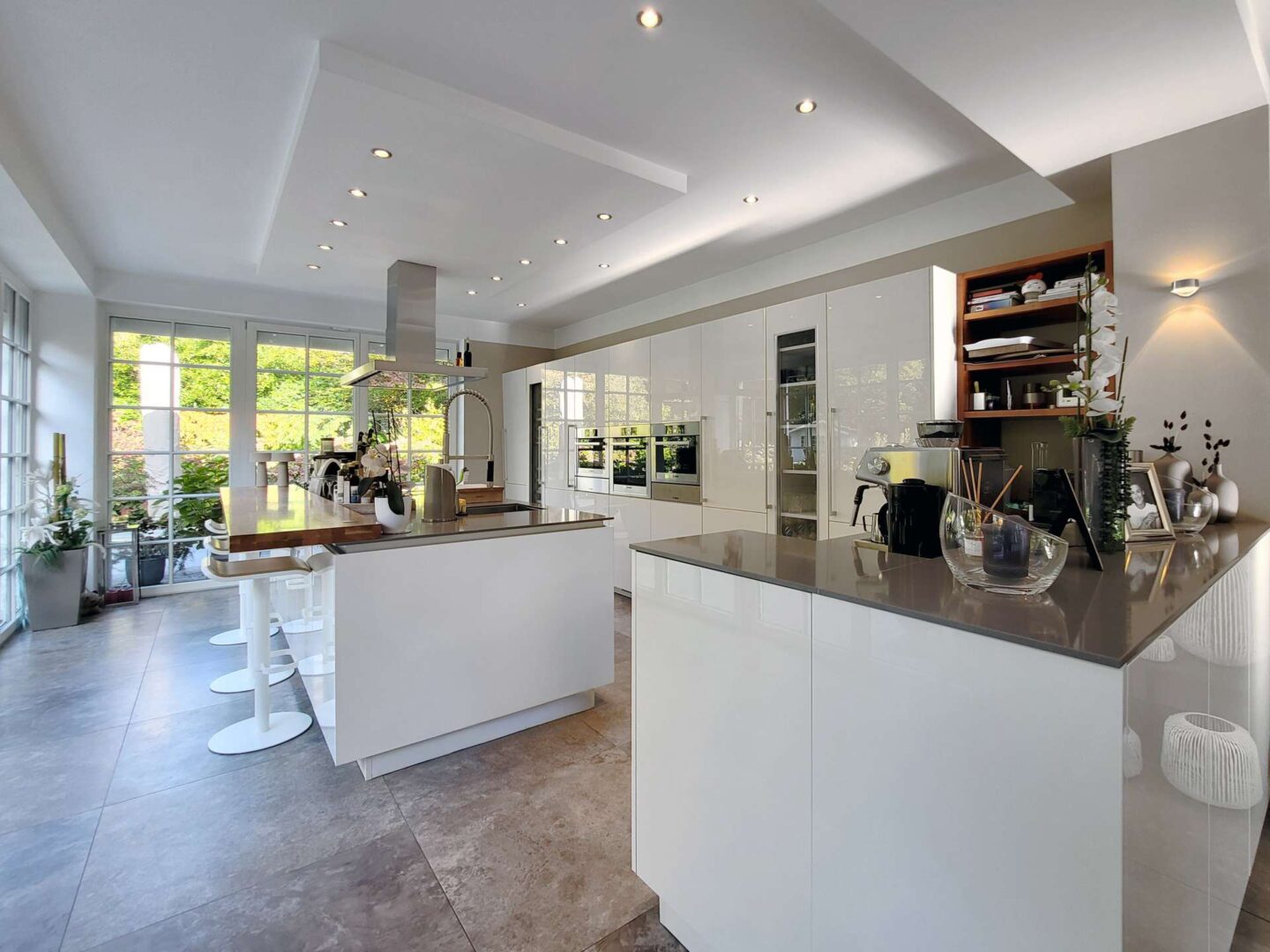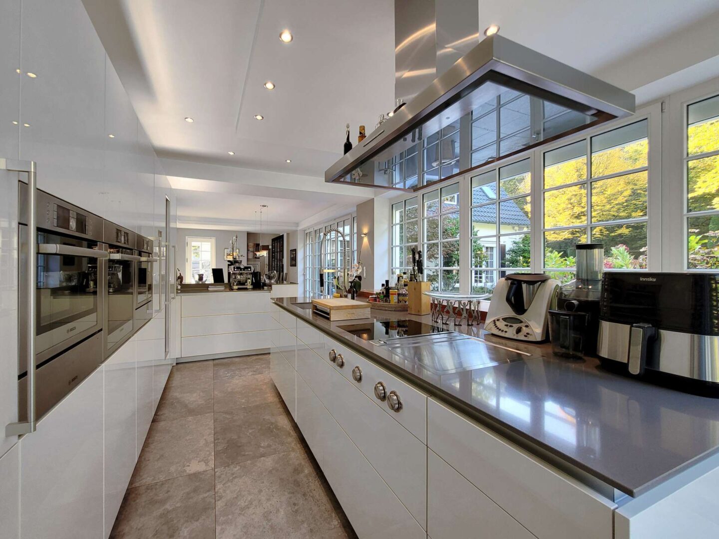 Über eine Diele hinter dem Entree gelangen Sie in den modernen und exklusiven Küchentrakt. Der Anbau wurde im Zuge der Sanierungsarbeiten im Jahre 2017 komplett neu errichtet. Zahlreiche raumhohe Sprossenfenster verleihen dem Raum ein wintergartenähnliches Flair und geben von jeder Position den Blick auf die traumhafte Gartenlandschaft frei. Eine angeschlossene Terrasse lädt zum Frühstücken im Freien ein. Die moderne Küche samt großer Kochinsel wurde vom Küchenstudio Poggenpohl auf Maß gefertigt und besticht durch ihre hochwertige und üppige Ausstattung. Im angrenzenden Essbereich sorgt ein Gaskamin für ein gemütliches und stilvolles Ambiente.