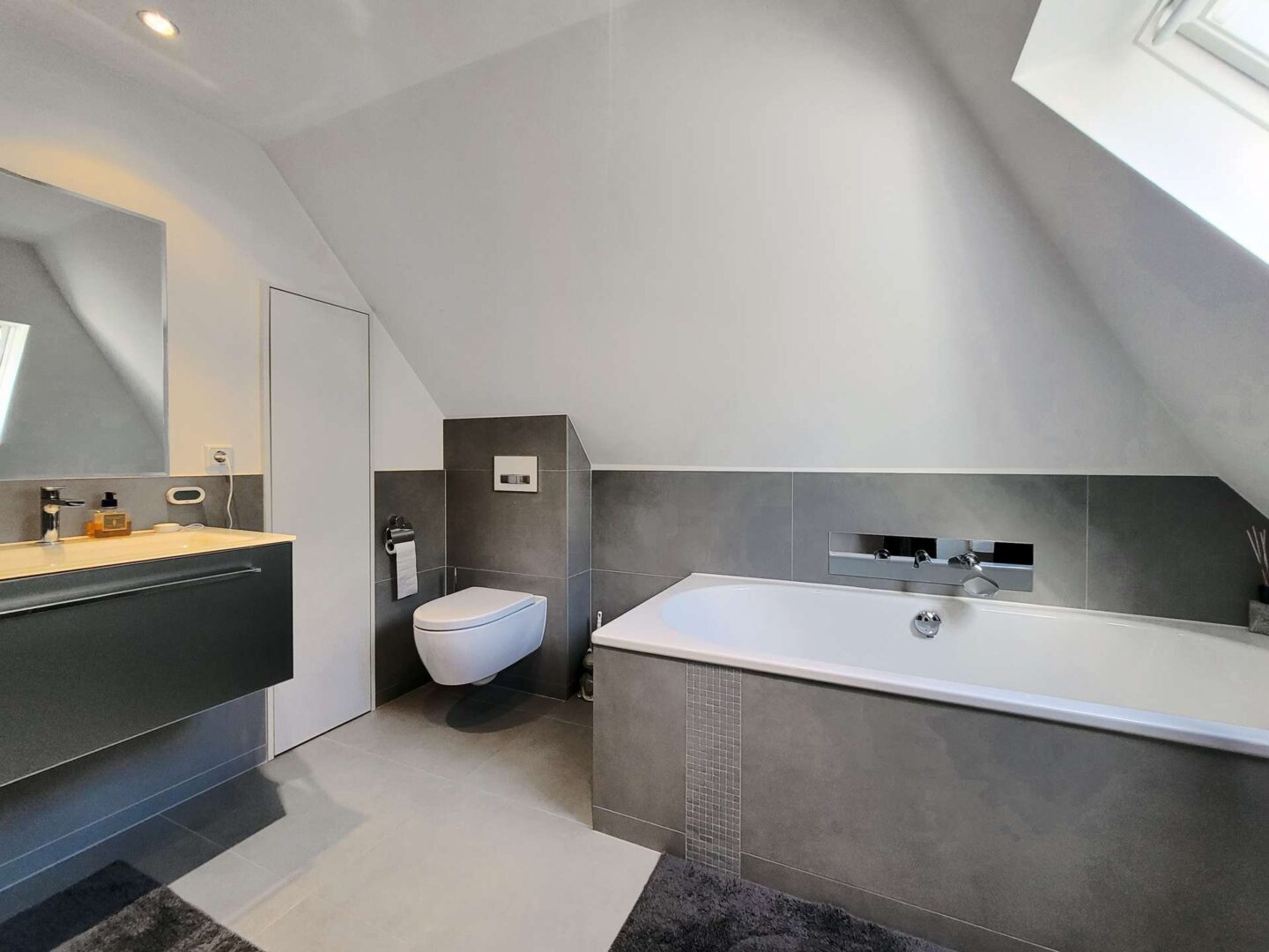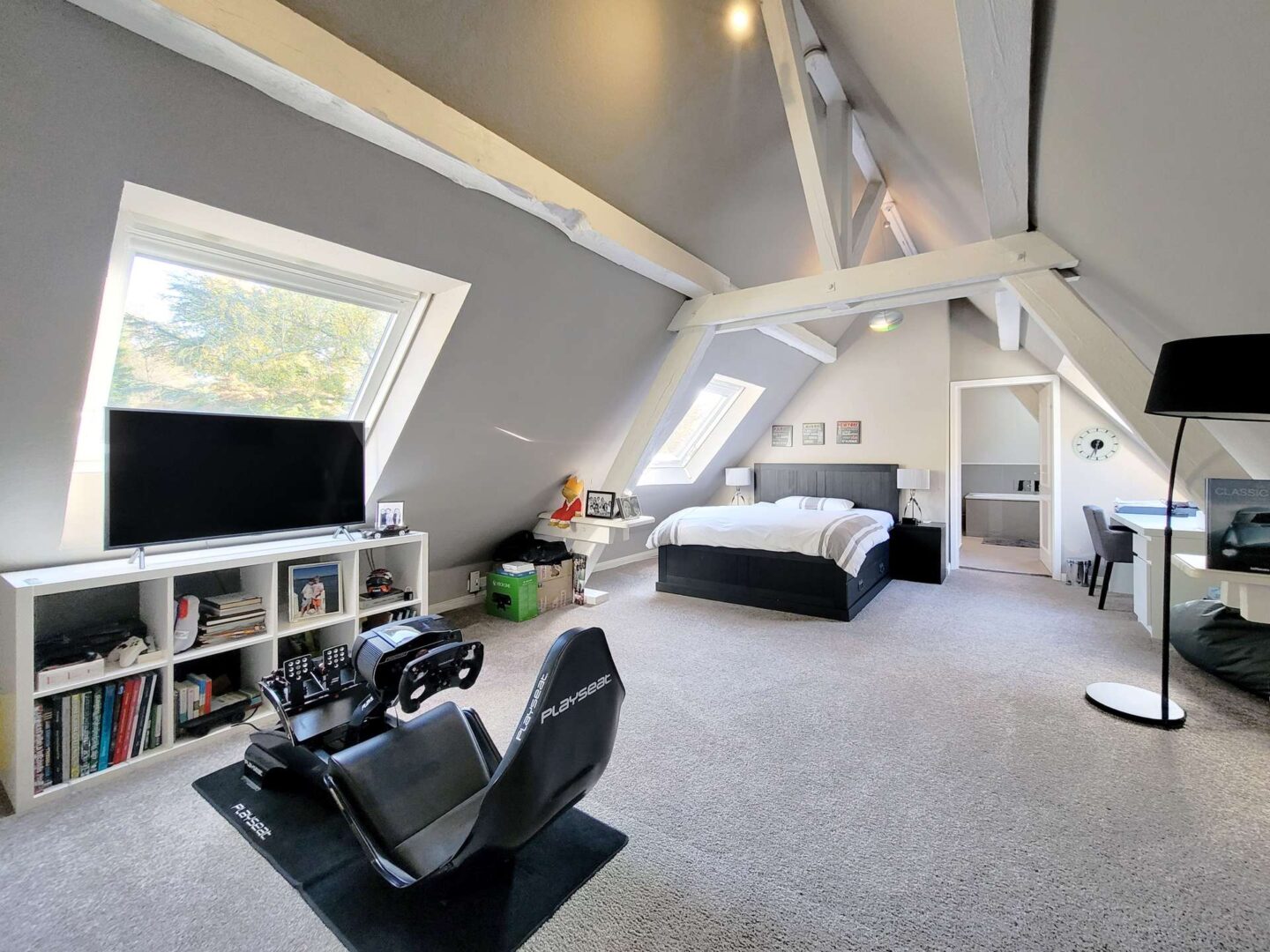 Über die Treppe in der Diele gelangen Sie in das ausgebaute Dachgeschoss. Hier stehen Ihnen ein komfortables Gästezimmer, ein Kinderzimmer, ein Duschbad sowie ein großes Studiozimmer mit Bad en Suite zur Verfügung. Alle Räume sind klimatisiert und bieten höchste Flexibilität in der Nutzung z.B. als Kinder-, Arbeits- oder Hobbyzimmer.
