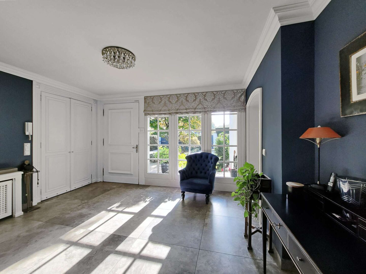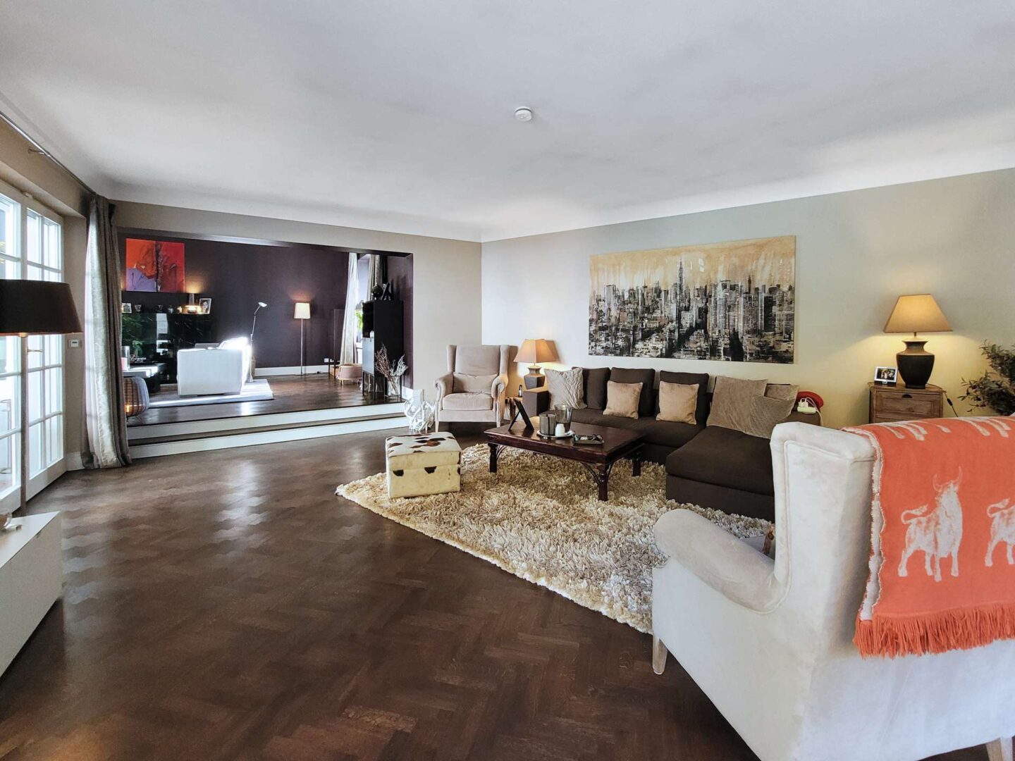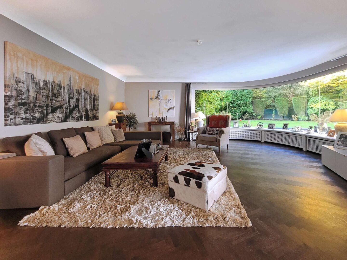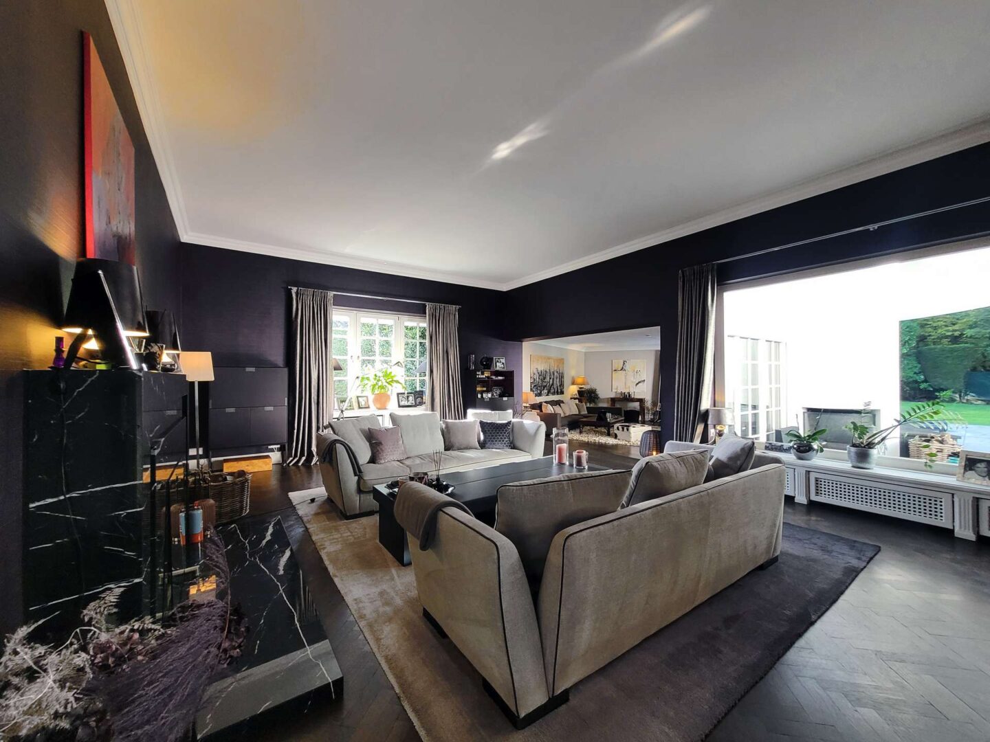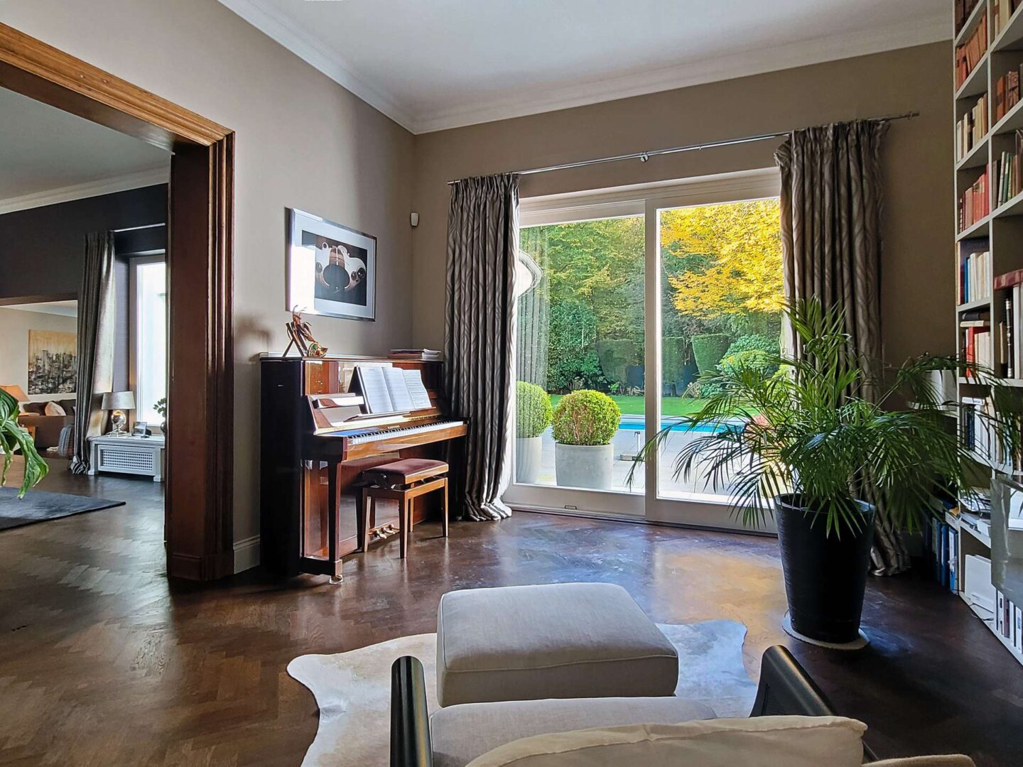 Über den weitläufigen, komplett umfriedeten Vorgarten betreten Sie das elegante Entree. Linker Hand befindet sich der äußerst großzügige Wohnbereich, welcher sich in eine Bibliothek, ein Kaminzimmer mit prächtigem Marmorkamin und einem angrenzenden Wohnzimmer mit gewölbtem Panoramafenster und malerischem Blick in den parkähnlichen Garten, unterteilt. Alle 3 Räume sind dank großer Fensterflächen lichtdurchflutet und verfügen über einen Zugang zu der teilüberdachten Terrasse mit Kamin und Schwimmbad.