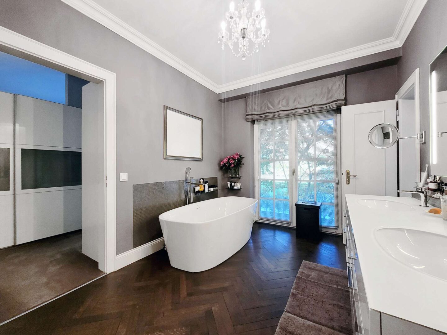 Die Mastersuite befindet sich ebenfalls im Erdgeschoss und umfasst ein klimatisiertes Schlafzimmer mit begehbarer Ankleide und ein luxuriös ausgestattetes Bad mit separater Dusche und WC. Beide Räume sind dem Garten zugewandt und bieten einen direkten Zugang zur Terrasse.
