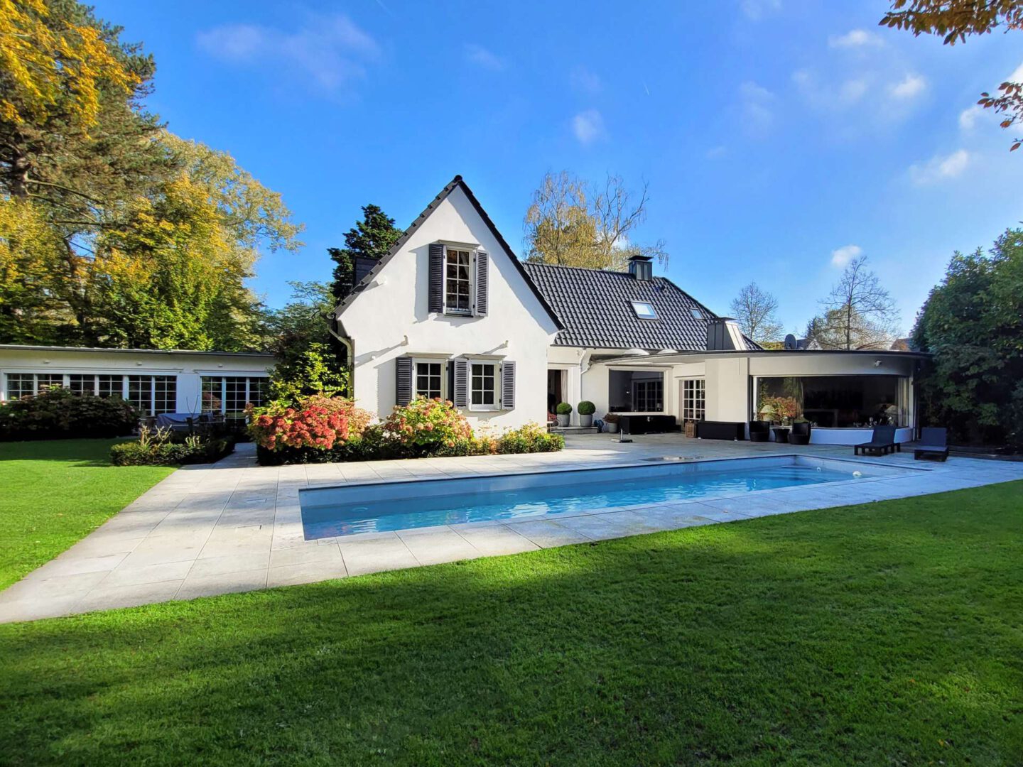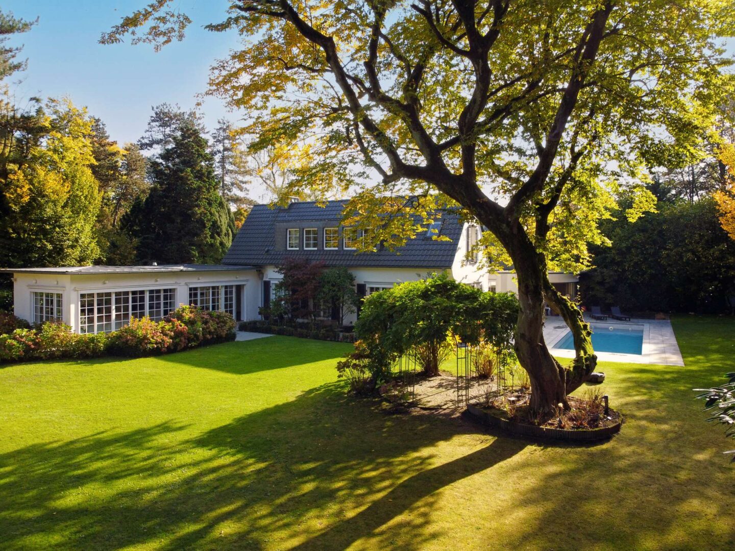 Die hochwertig sanierte Landhausvilla liegt auf einem ca. 1.967 m² großen, parkähnlich gestaltetem Gartengrundstück in einer exponierten Wohnlage im Villenviertel von Alt – Meererbusch. Die Immobilie bietet ihren Bewohnern eine Wohnfläche von ca. 370 m², verteilt über 2 Etagen bei 6 Zimmern zzgl. diverser Nebenräume. Ein traumhafter Garten mit zahlreichen Terrassenflächen und ein Außenschwimmbad laden zum Verweilen in der Natur ein.