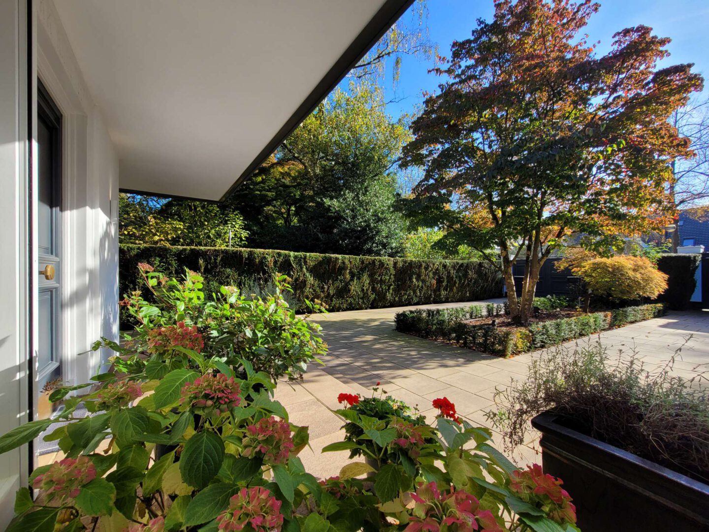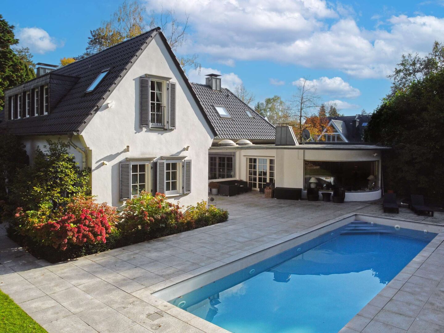 Der traumhafte Garten ist mit einer üppigen Bepflanzung versehen, die für einen hohen Erholungswert sorgt. Die gartenseitig umlaufende Terrassenfläche bietet vielfältige Möglichkeiten, die Natur in vollen Zügen zu genießen – vom Frühstück im Freien direkt auf der Küchenterrasse bis hin zum gemütlichen Abend vorm Außenkamin auf der teilüberdachten Terrasse am Wohnbereich. Ein kürzlich modernisiertes Schwimmbad mit Gegenstromanlage und Überlaufbecken bildet das Highlight des Außenbereichs und lädt an warmen Tagen oder nach dem Saunagang zum Entspannen ein.
