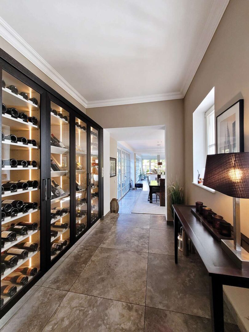 Ein besonderes Highlight ist der als Weinraum gestaltete Durchgangsraum zur Küche, in dem sich über die gesamte Breite große, klimatisierte Weinschränke befinden und Liebhaber edler Tropfen ihre Schätze gut aufbewahrt wissen.