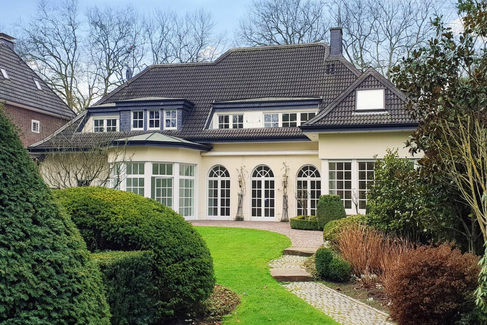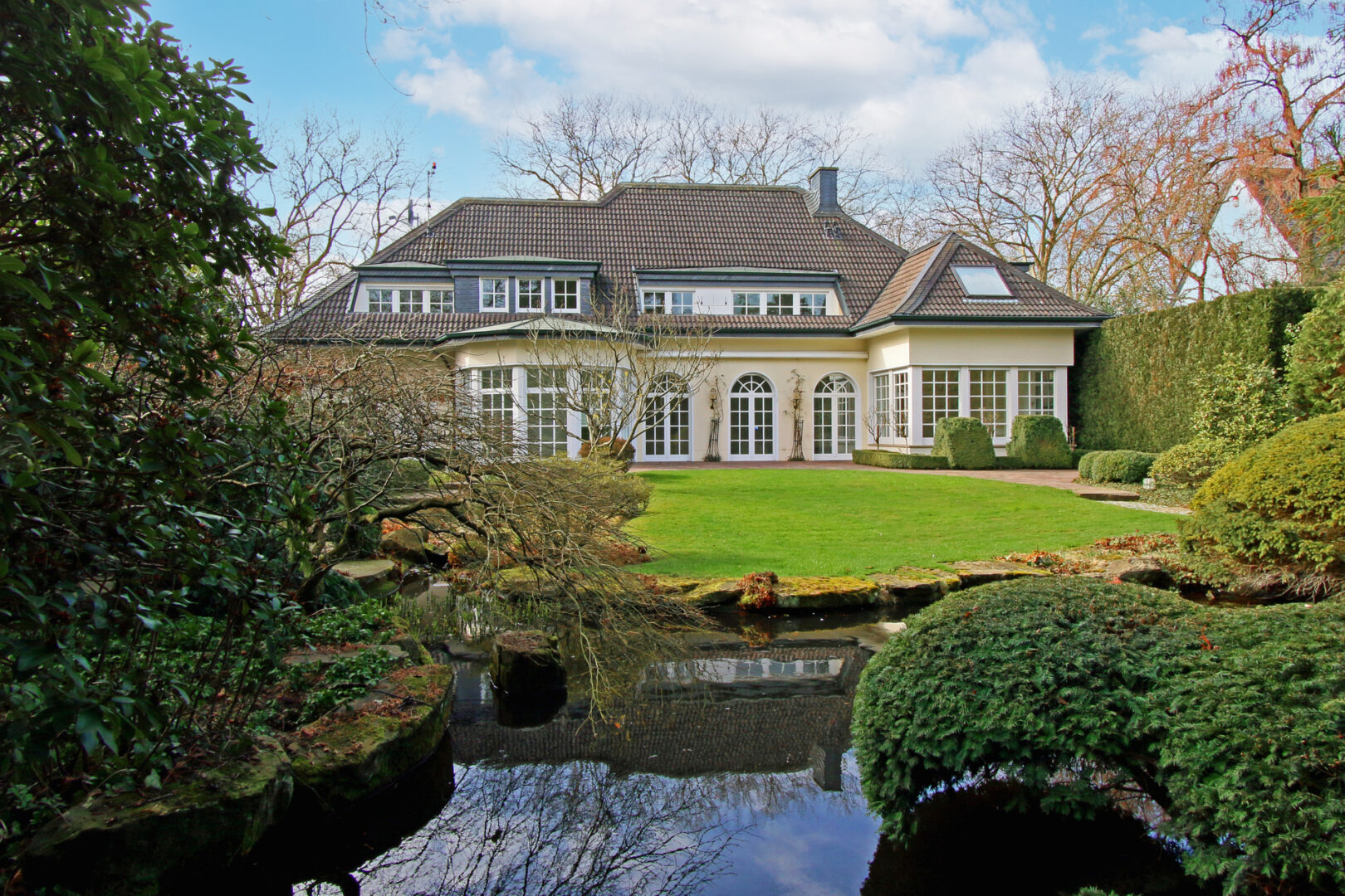 Die freistehende Villa im Landhausstil liegt auf einem traumhaften Gartengrundstück samt Wasserlauf und Teichanlage direkt am Bunten Garten in Mönchengladbach. Die Immobilie bietet ihren Bewohnern viel Wohnfläche verteilt auf zwei Etagen. Im Untergeschoss stehen Ihnen weitere Nutzfläche inkl. großem Fitnessraum und einer Sauna mit Tauchbecken und Ruhebereich zur Verfügung.