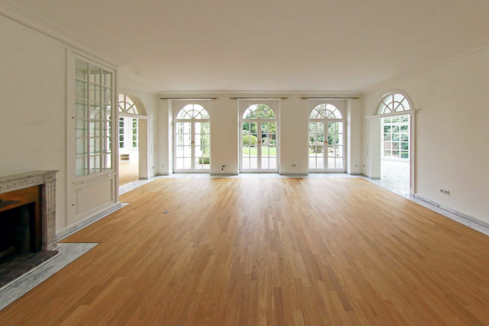 Über das Entree mit angrenzender Garderobe und Gäste-WC gelangen Sie in die großzügige Empfangshalle mit Treppenaufgang und Galerie. Von hier aus betreten Sie den zum Garten ausgerichteten Wohnbereich mit antikem Echtholz-Kamin und Einbauten im Landhausstil. Bodentiefe Sprossenfenster mit Zugang zur Terrasse sorgen für lichtdurchflutete Räume und geben den Blick auf den Garten samt Teichlandschaft frei. Links vom Wohnzimmer befindet sich eine kleine Bibliothek mit hochwertigen Schrankeinbauten und einem traumhaften Ausblick in den Garten. Das geräumige Esszimmer mit Marmorboden und raumhohen Fenstern verspricht ebenfalls eine herrliche Aussicht ins Grüne und bietet viel Platz für gemütliche Abendessen mit Familie und Freunden. Die angrenzende Küche im Landhausstil wurde auf Maß gefertigt und passt sich farblich perfekt an den Marmorboden in klassischer Schachbrett-Optik an.