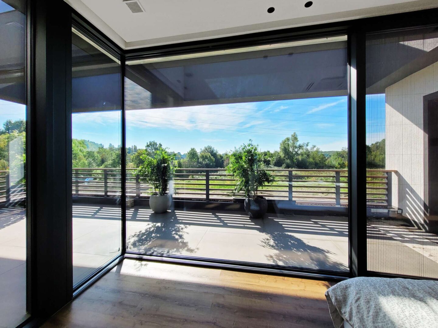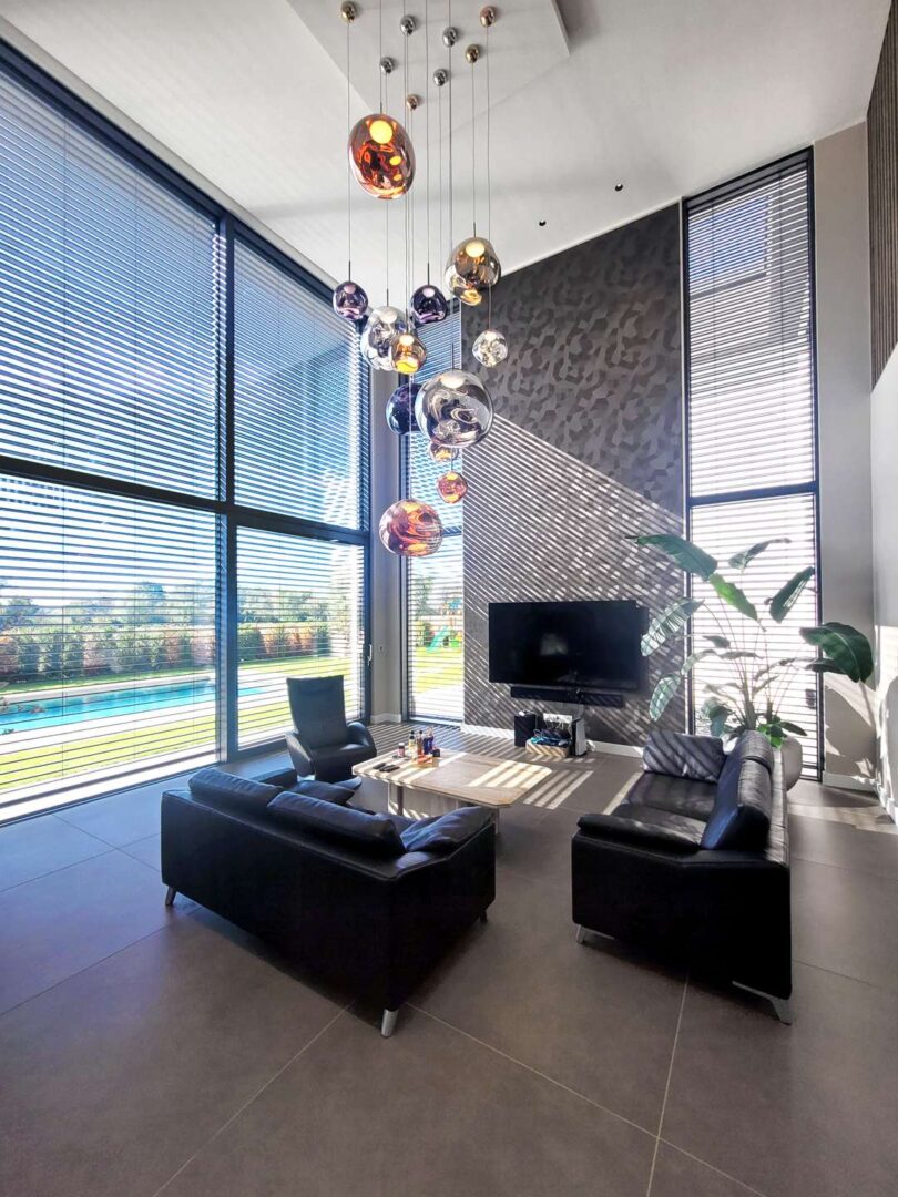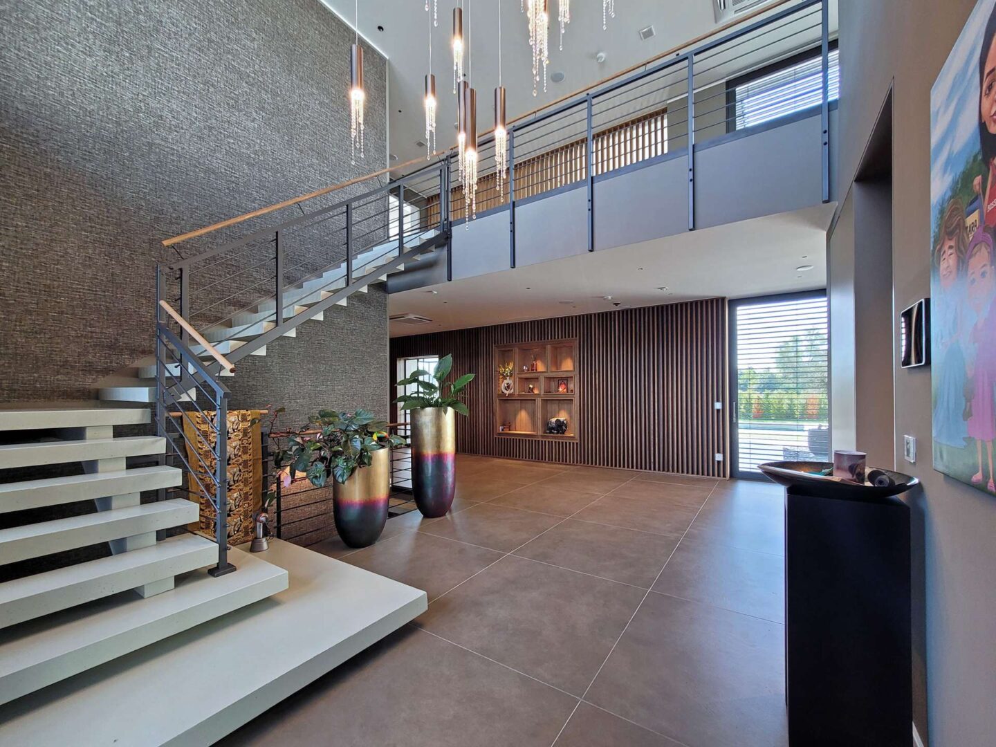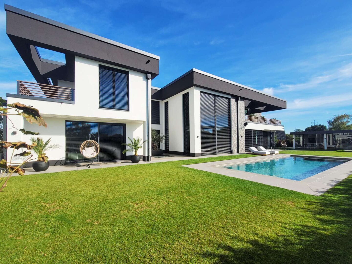 - Exklusive Innenausstattung: Bodenbeläge aus 1,2 x 1,2 m großen Feinsteinzeugfliesen und edlem Dielenboden, riesige Fensterflächen mit elektrisch gesteuerten Raffstores, hohe Decken, offene Galerie