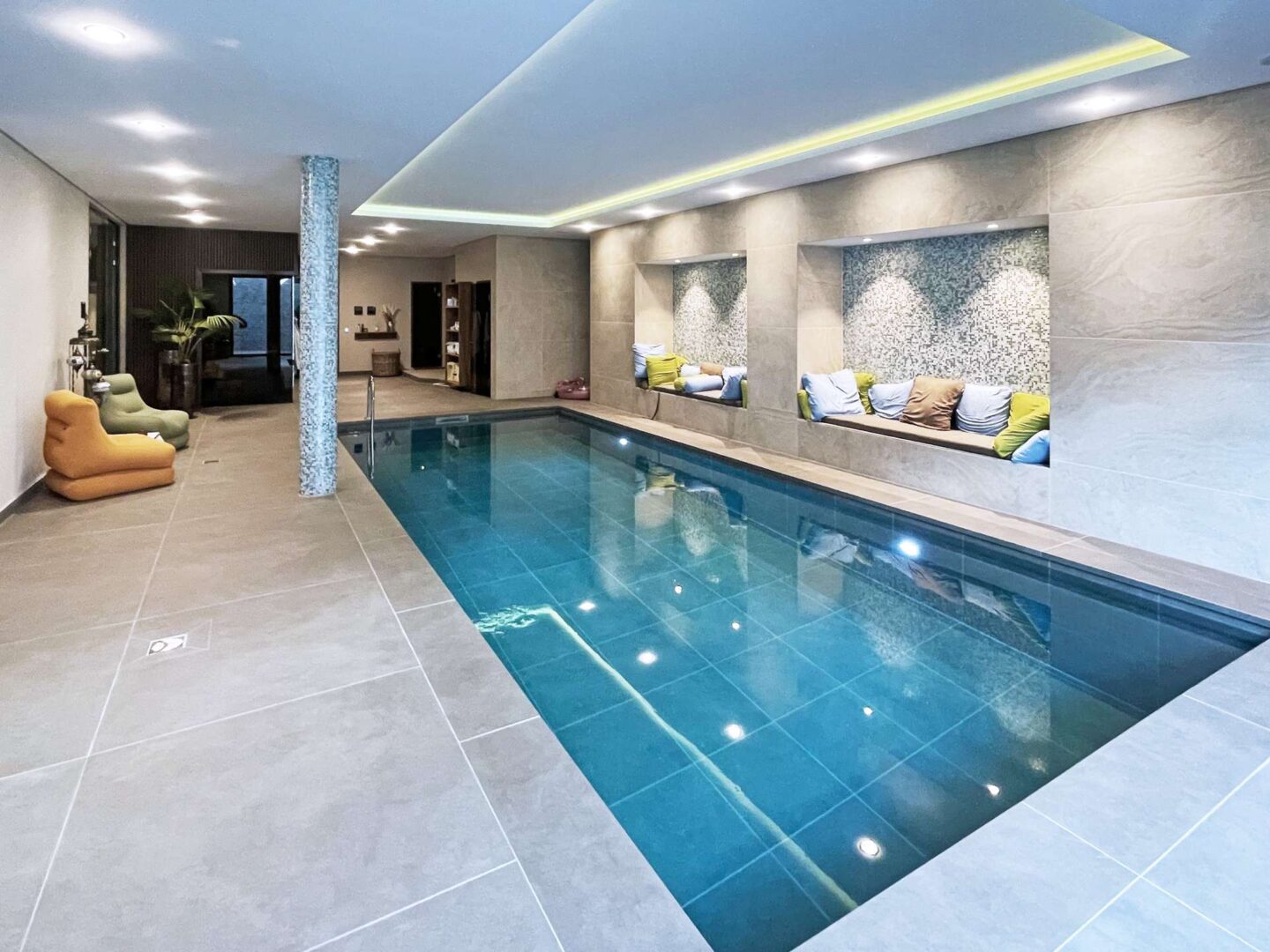 - Wellness & Fitness: Innenpool mit Gegenstromanlage, Hamam, Dampfbad und verglaste Profi-Sauna, Fitnessstudio mit Spiegelwänden, hochwertigen Böden und direktem Zugang zu einer Terrasse.