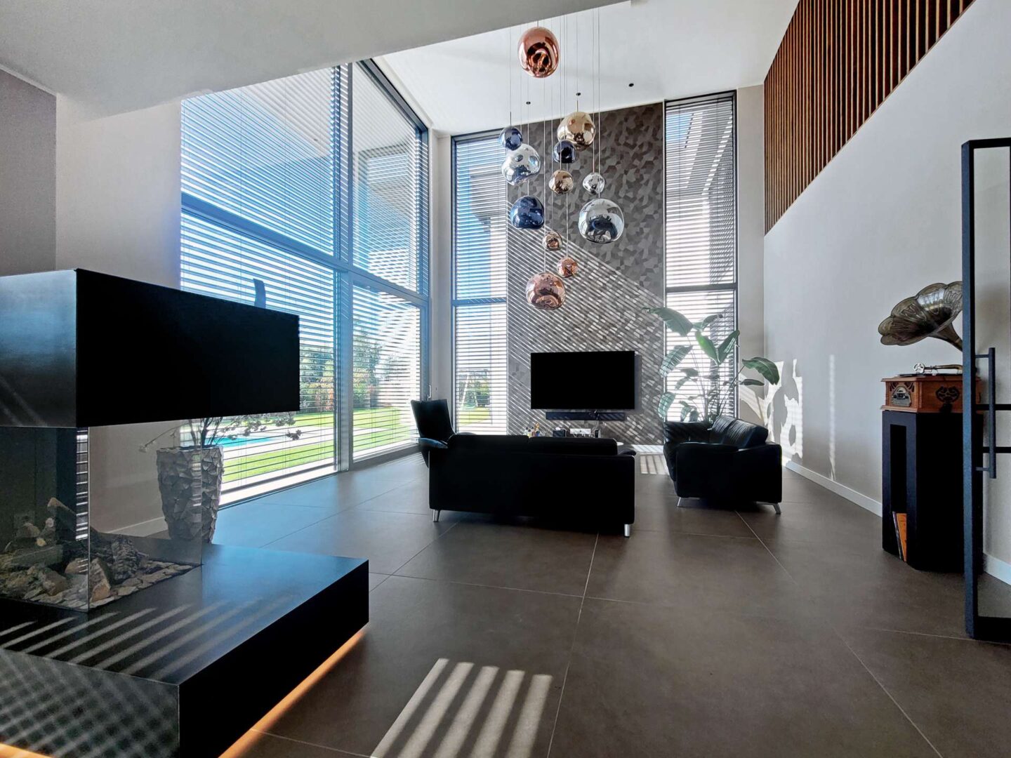 - Wohnbereich: großzügige Räume mit beeindruckender Deckenhöhe (bis zu 7 m), Gas-Kaminanlage von ART OF FIRE, maßgefertigte Warendorf-Küche mit Gaggenau-Geräten