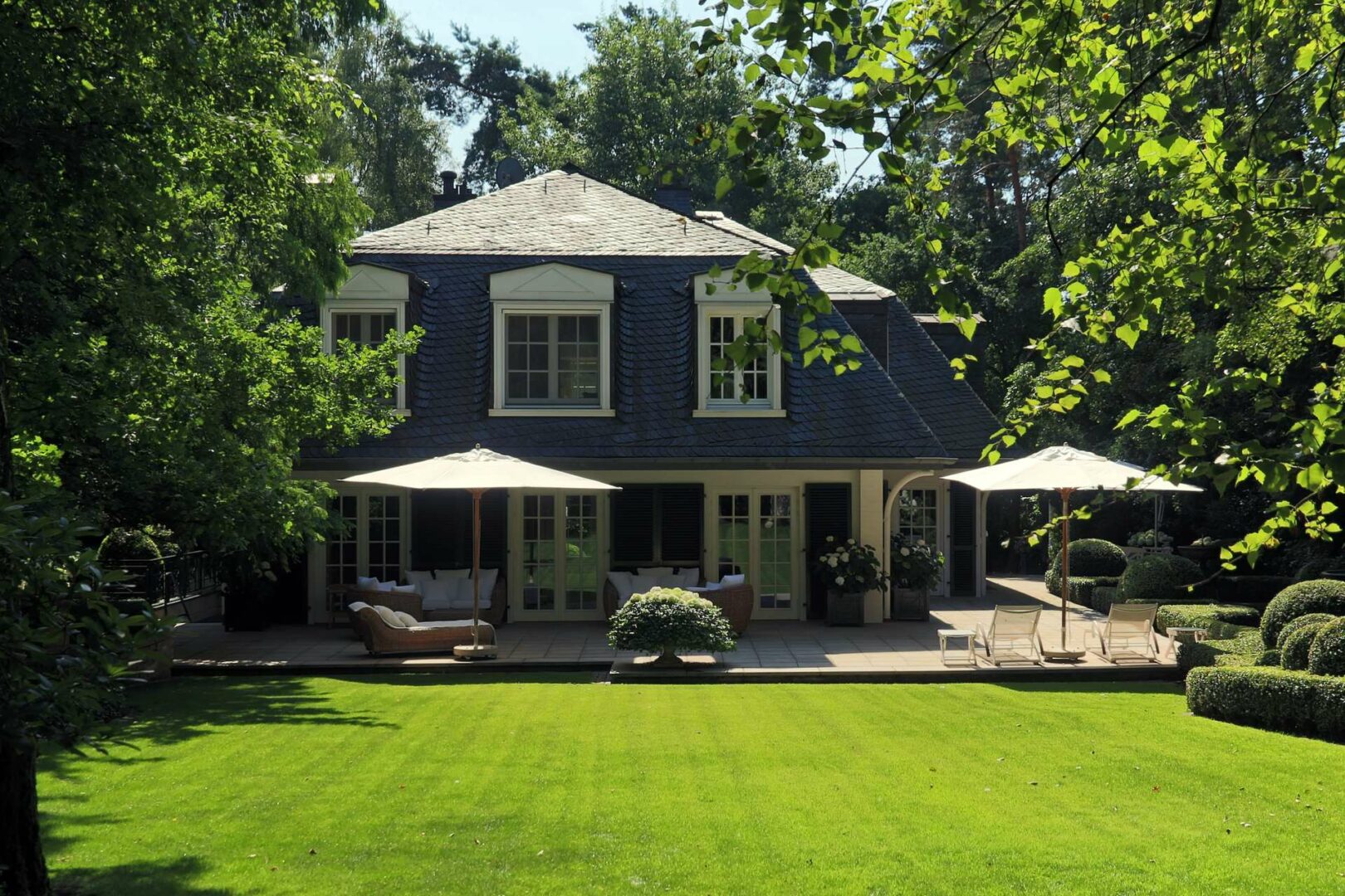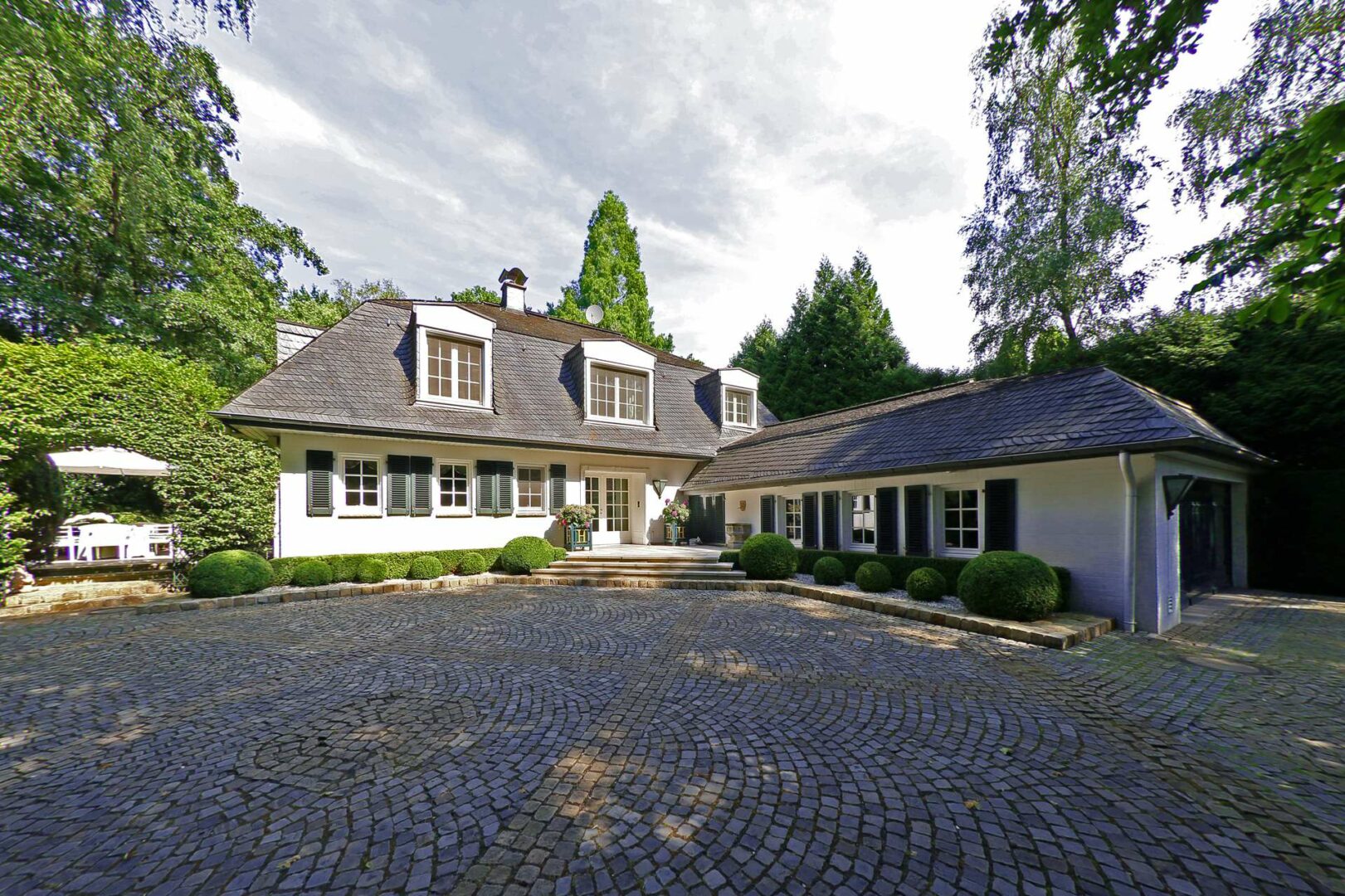Das Grundstück ist nahezu komplett mit alten Bäumen umfriedet und bietet eine hohe Privatsphäre. Der alteingewachsene Garten wurde im französischem Stil angelegt und mit Buxbäumen, einem Wasserlauf sowie einem Gartenpavillon gekonnt in Szene gesetzt. Eine ca. 60 m2 große, teilüberdachte, Terrasse lädt zum Sonnen und Erholen ein.