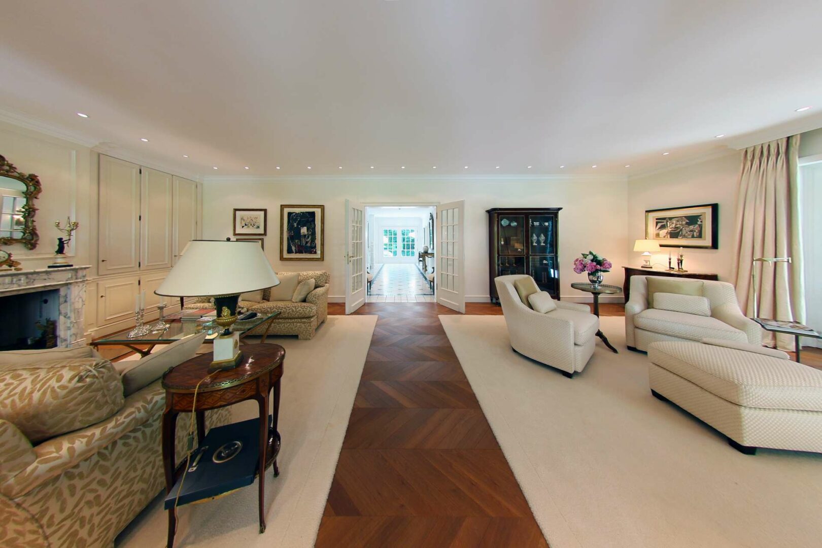 Schon beim Betreten des Objekts über den hellen und freundlichen Empfangsbereich spiegelt sich die Exklusivität der Immobilie wider. Marmorboden, Stuckdecken, zum Teil doppelflügelige Glaskassettentüren sowie maßgefertigte Einbauten gehören hier zum Standard. Am Ende der Diele erschließen drei doppelflügelige Türen die weiteren Räume. Zur Linken befindet sich das repräsentative Esszimmer, zur Rechten liegt eine Bibliothek mit maßangerfertigten Schrankeinbauten. Durch die dritte doppelflügelige Türe betreten Sie den großzügigen Wohnbereich mit offenem Marmor-Kamin. Bodentiefe Sprossenfenster sorgen für lichtdurchflutete Räume und geben den Blick in den Garten frei. Alle Wohnräume im Erdgeschoss sind mit hochwertigem Parkett ausgestattet. Die Küche im Landhausstil mit direktem Zugang zum Esszimmer komplettiert das Raumangebot im Erdgeschoss.