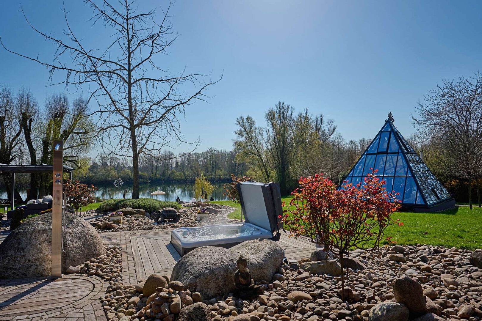 Hinter der Pyramide befindet sich ein Gerätehaus (Baujahr 2018) in Holzkonstruktion mit einer Outdoorgym-Anlage aus dem Jahre 2022. Sport, Freizeit und Arbeit lassen sich hier perfekt kombinieren. Direkt am See befindet sich zudem ein Saunagebäude in Holzkonstruktion mit einer Terrasse zur Wasserseite und einem weiteren Bootssteg (Baujahr 2020). Die Sauna und die Pyramide sind an die KNX- Cat 7 Verkabelung angeschlossen.