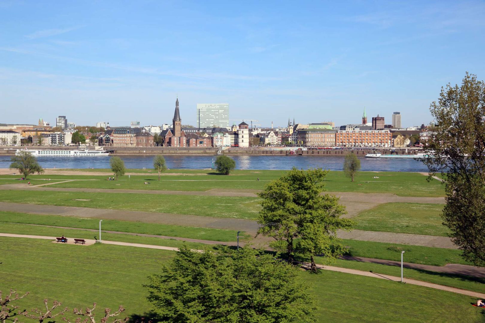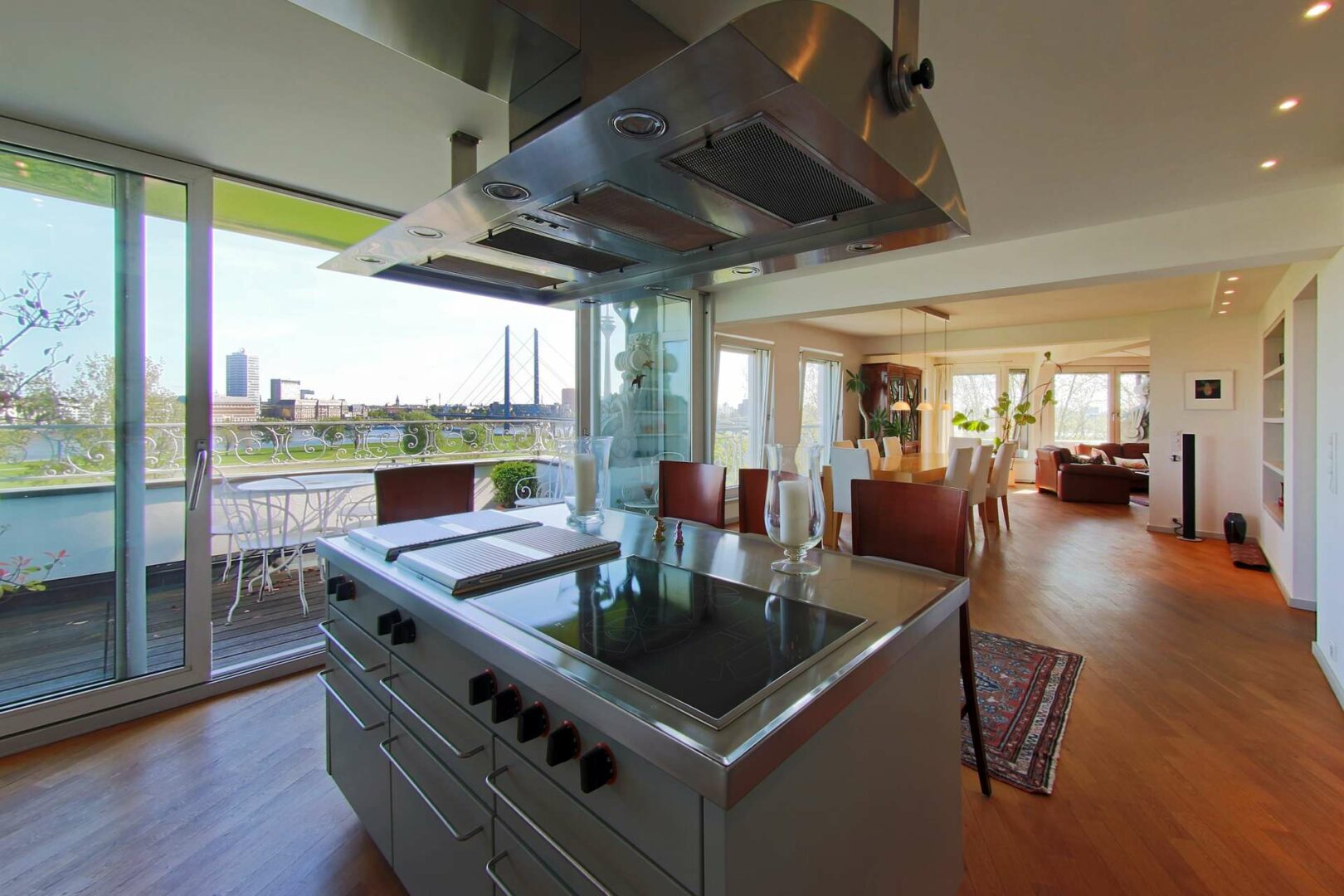 Mit dem Personenaufzug gelangen Sie zu Ihrer Wohnung. Eine lange Diele führt durch die gesamte Wohnung, welche sich über die komplette Etage erstreckt. Die Schlafzimmer liegen auf der rechten Seite und sind der ruhigen Gartenseite zugewandt. Auf der linken Seite befindet sich der äußerst großzügige Wohn- und Essbereich mit offener Küche und Aussicht auf den Rhein. Bereits beim Betreten der Räumlichkeiten fällt der Blick über die großen Fensterfronten auf das einmalige Rheinpanorama. Großzügige Balkone laden zum Verweilen ein und bieten einen fantastischen Weitblick über den Rhein bis hin zur Düsseldorfer Altstadt und dem Medienhafen samt Fernsehturm.