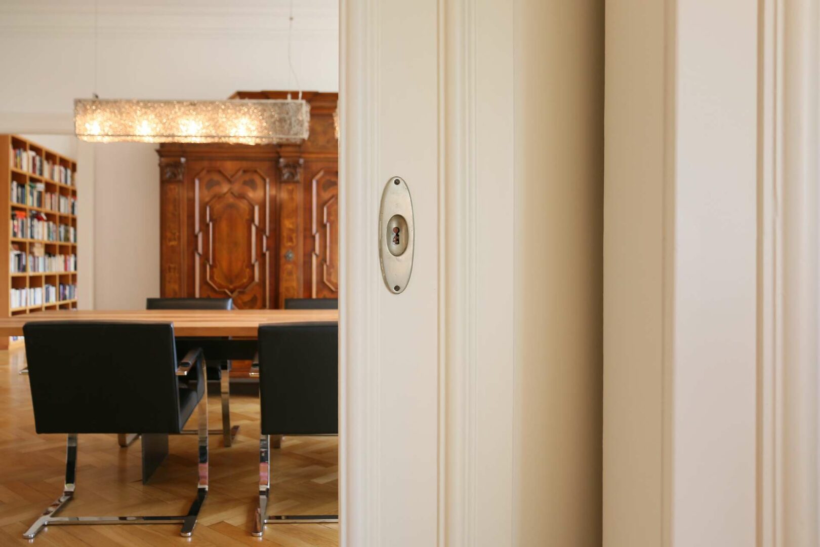 Bei allen in der Vergangenheit durchgeführten Sanierungs- und Modernisierungsarbeiten wurde stets darauf geachtet, die bestehenden historischen Stilelemente weitestgehend beizubehalten und in die Moderne zu transportieren. Aufwendige Stuckdecken, Eiche-Fischgrat-Parkett, Schachbrett-Fliesen in der Küche, Erker-Fenster und hochwertige Türen mit Glaskassetten und verzierten Rahmen zählen zu den exklusiven Ausstattungsmerkmalen und verleihen dem Objekt seinen ganz besonderen Art Déco Charme.