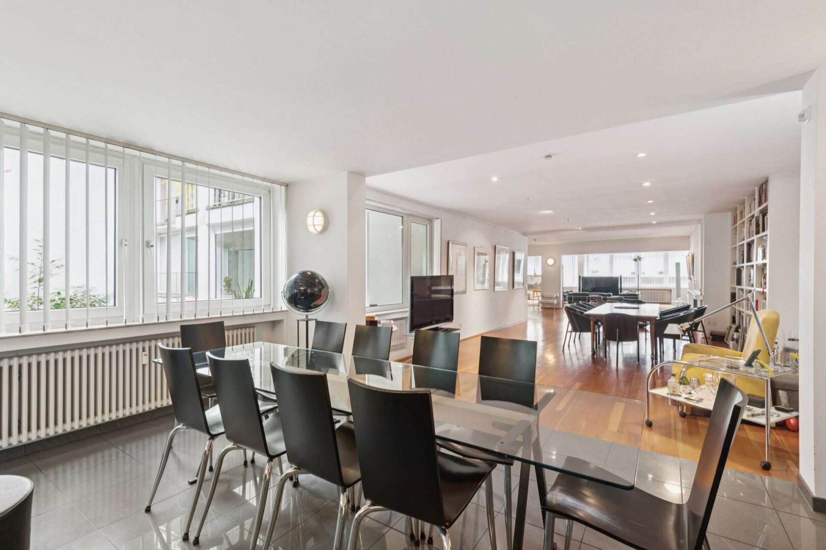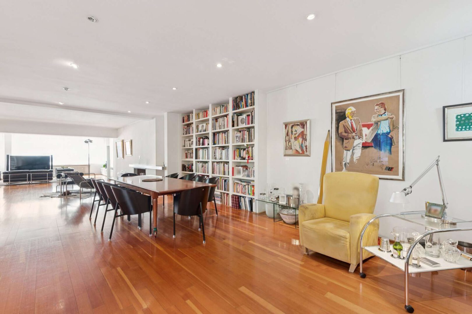 Im gesamten Wohnbereich unterstreicht ein edles Schiffsparkett aus Oregon Pine die exklusive Atmosphäre und schafft eine warme Wohnlichkeit. Nahtlos fügt sich ein weiterer Wohn- und Lesebereich mit einem deckenhohen Einbauregal an. Hier kann ein zusätzlicher großer Esstisch platziert werden - perfekt für gesellige Abende oder repräsentative Anlässe.
