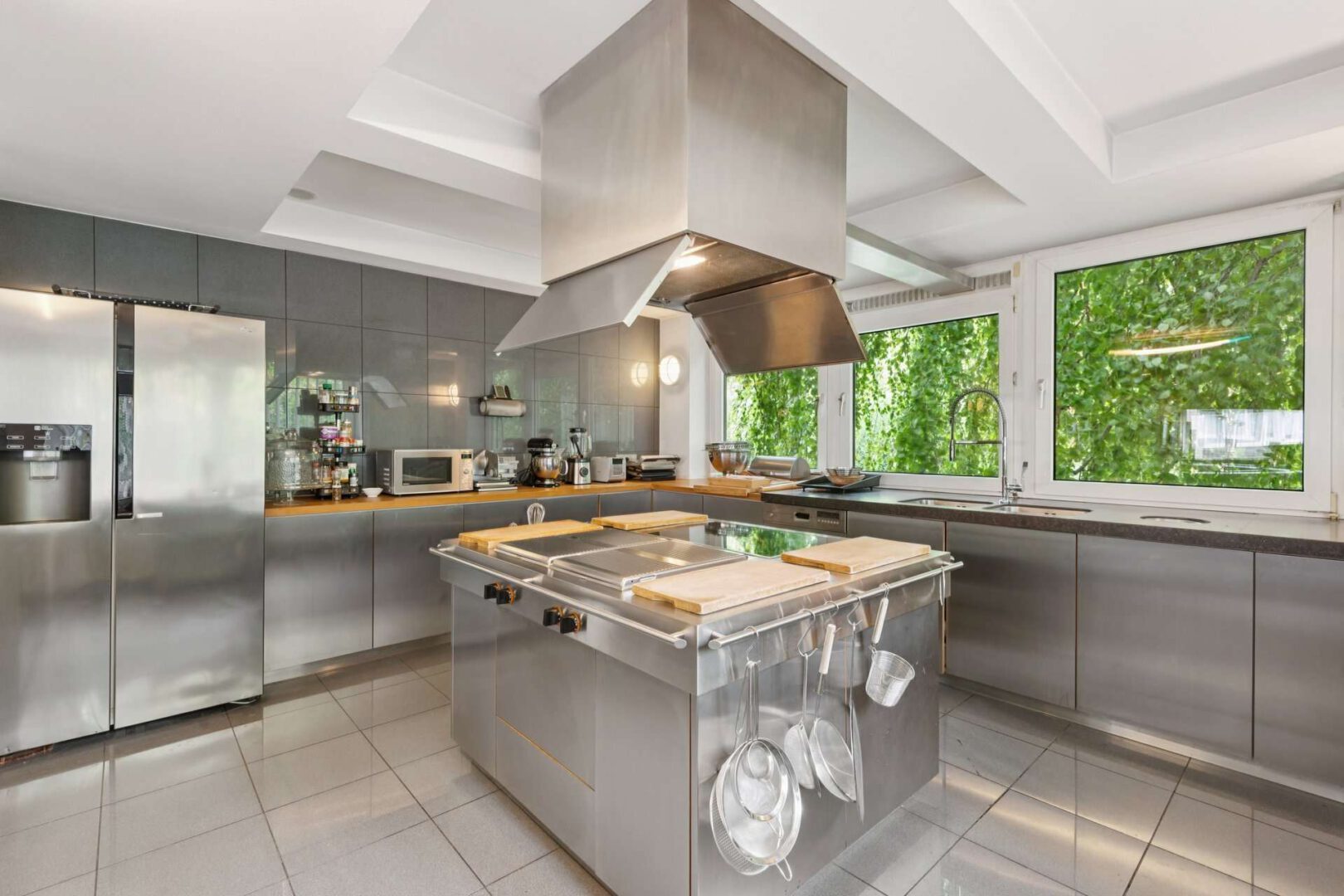 Die offene Profiküche, entworfen von einem Innenarchitekten, wurde von dem Meistertischler Mechelke gebaut und befindet sich mitsamt dem vorgelagerten Essbereich auf einem flachen Sockel. Die Küche begeistert u.a. durch einen Bar-Corpus mit Einbau-Getränkekühlschrank, einer tischhohen Schrankanlage, einem raumhohen Versorgungsschrank und einer großzügigen Kochinsel mit Abluftanlage. Ausgestattet mit hochwertigen Geräten führender Markenhersteller bietet sie Funktionalität mit moderner Eleganz. Eine Theke trennt optisch den benachbarten Essbereich von der Küche ab.
